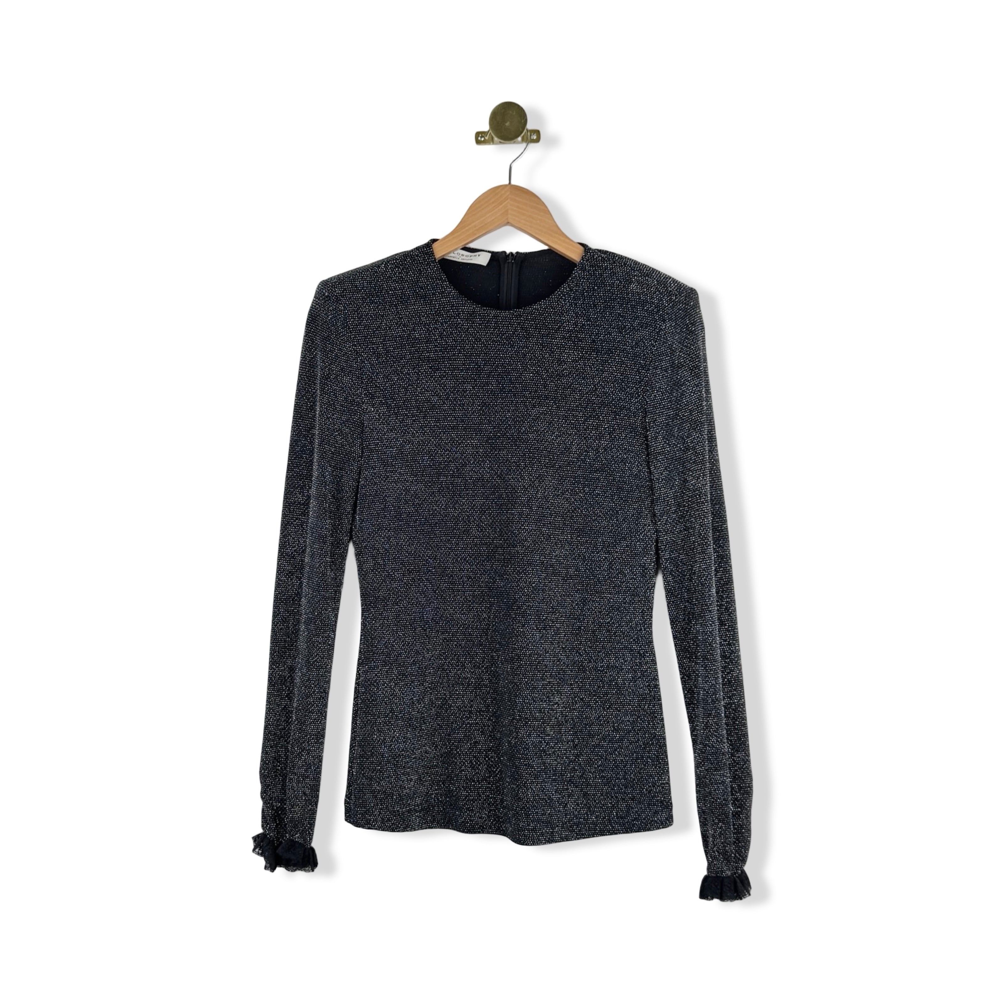- Metallic glitter long sleeve top with ruffle details on sleeves and back zip closure