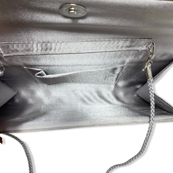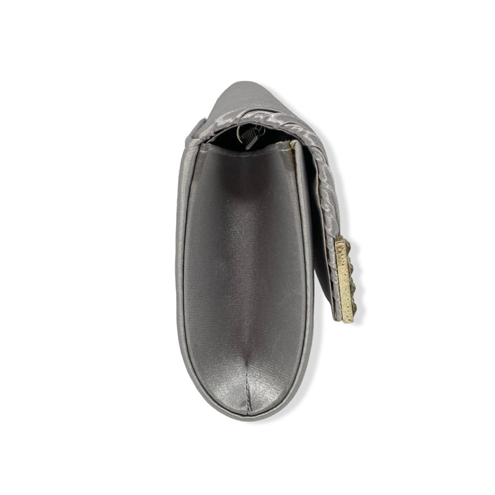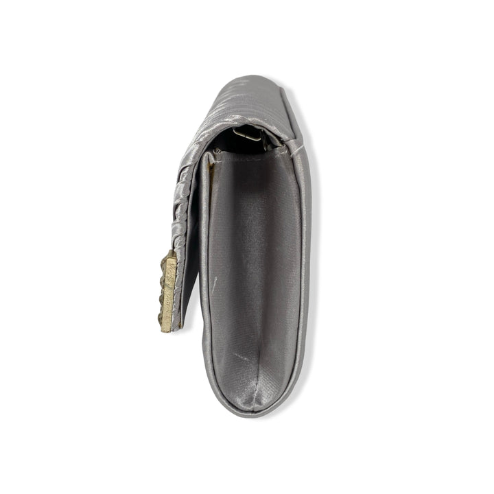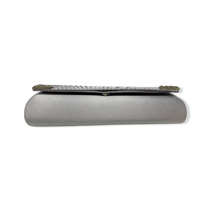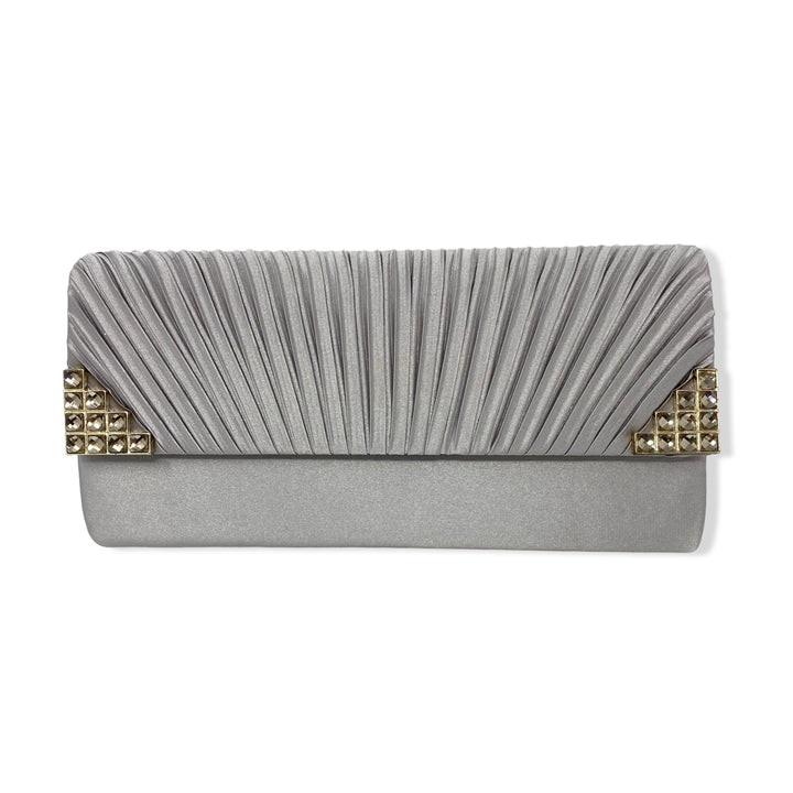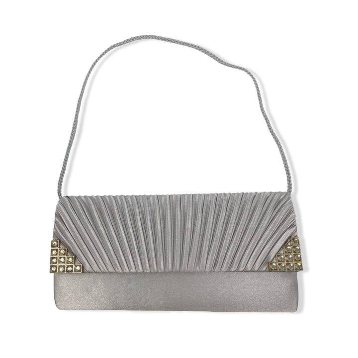 - Pleated clutch with embellished details and detachable strap. Snap button closure.