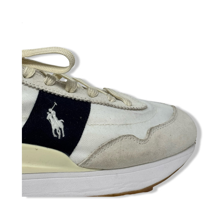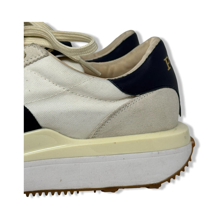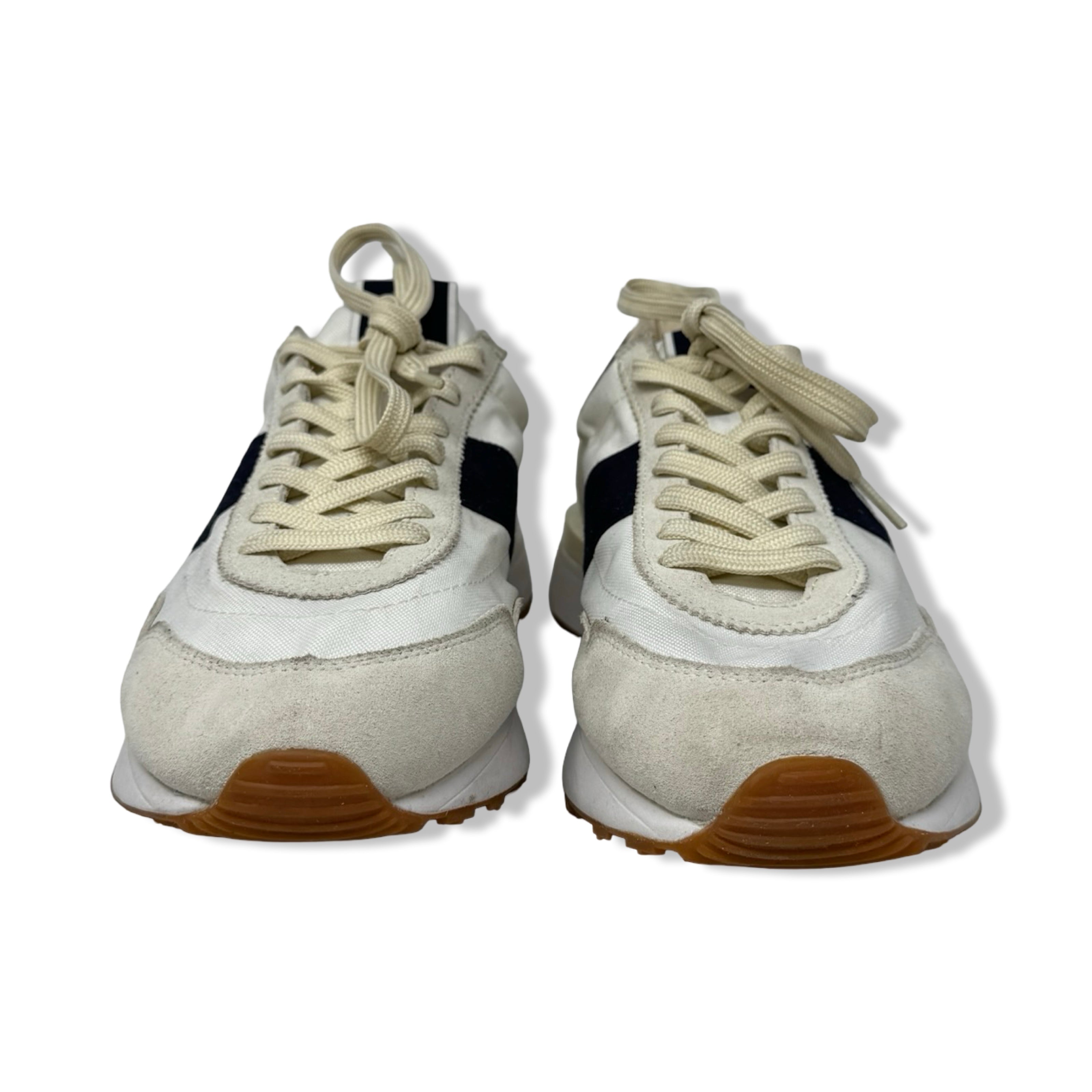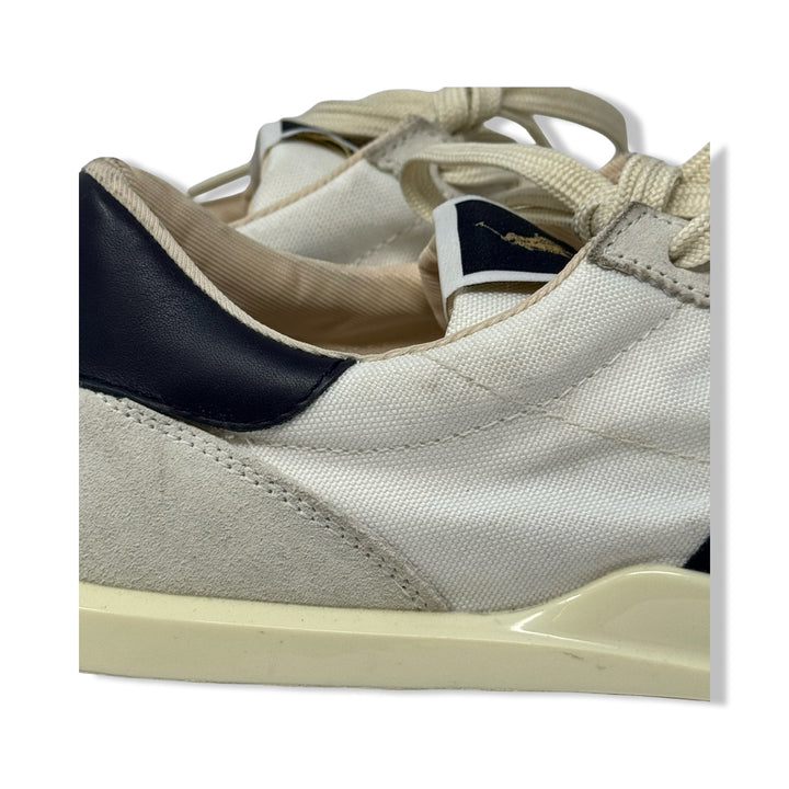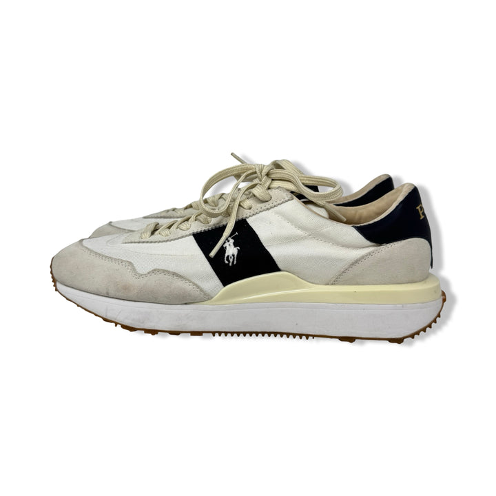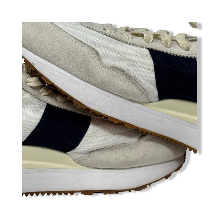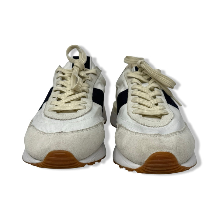 - Lace up sneakers with logo on sides and suede panels. Some signs of wear.