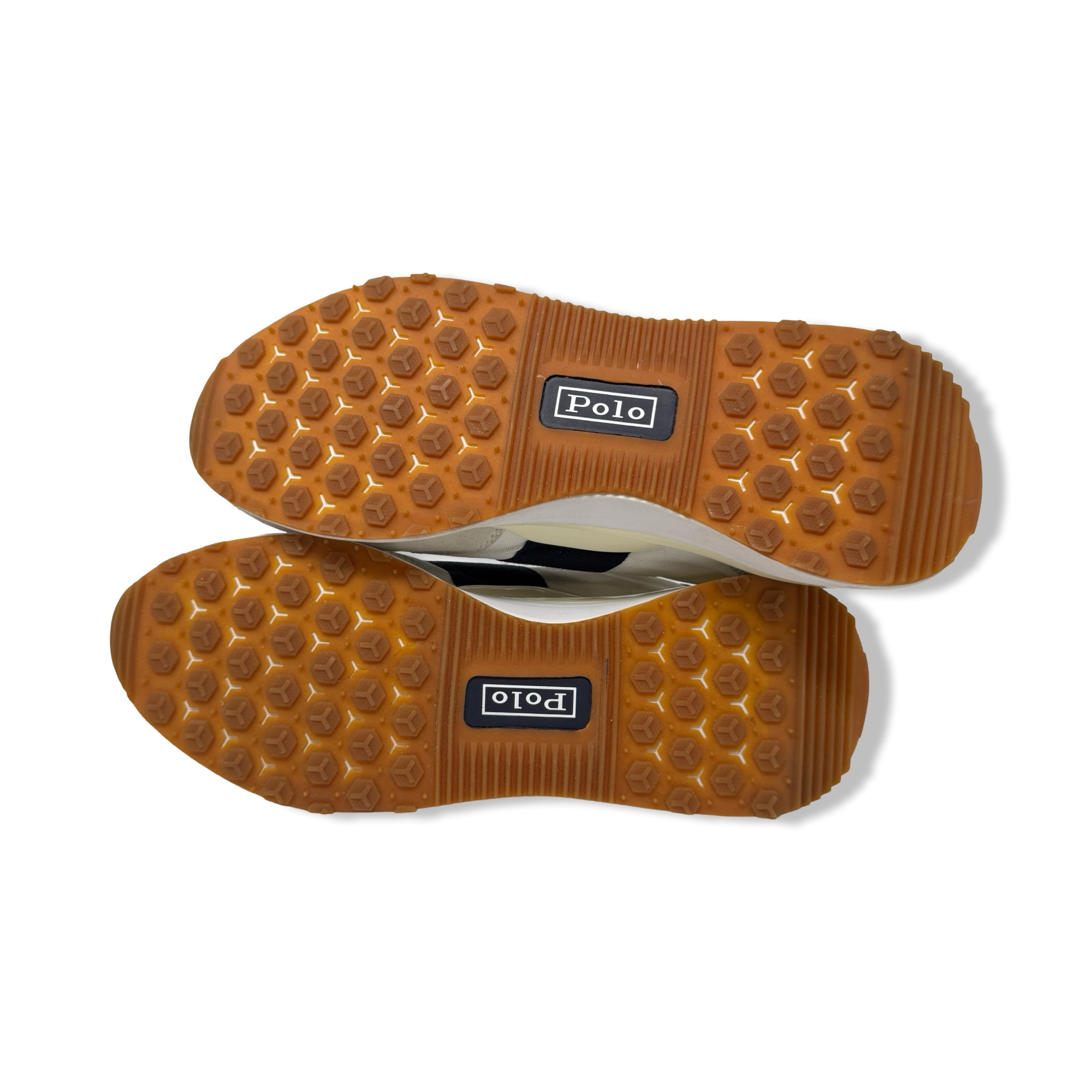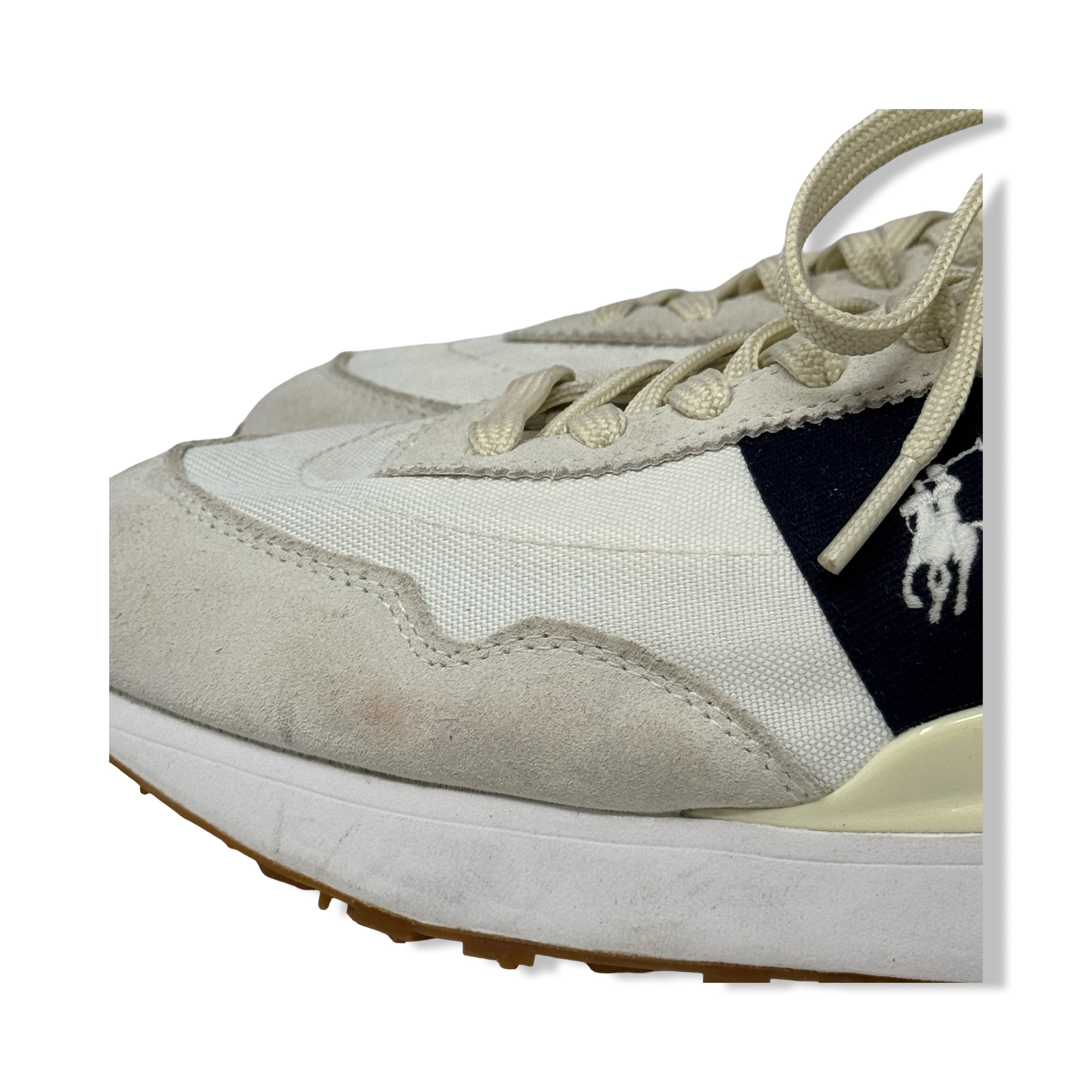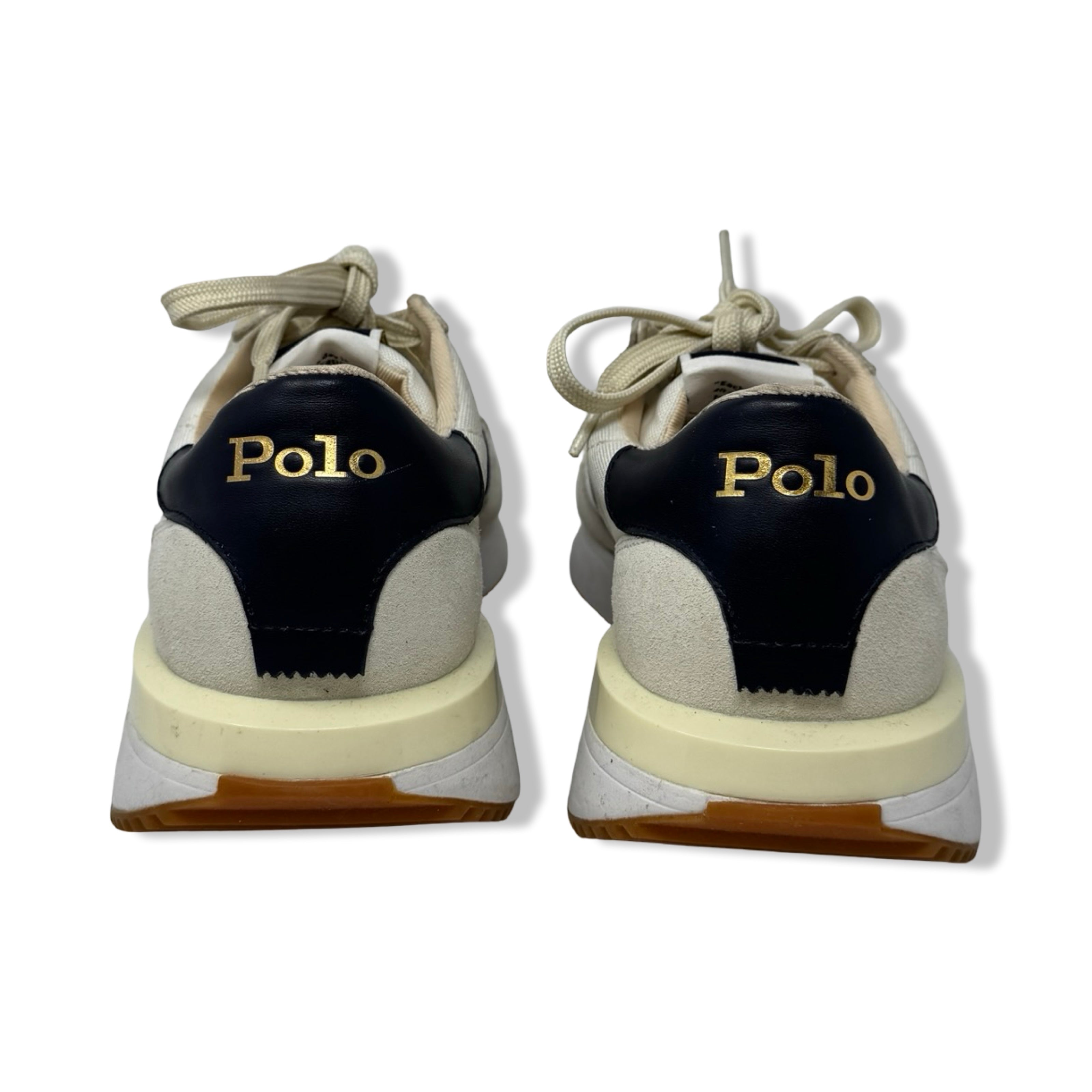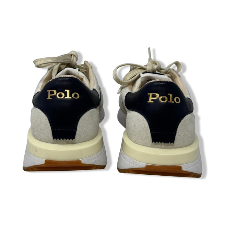 - Lace up sneakers with logo on sides and suede panels. Some signs of wear.