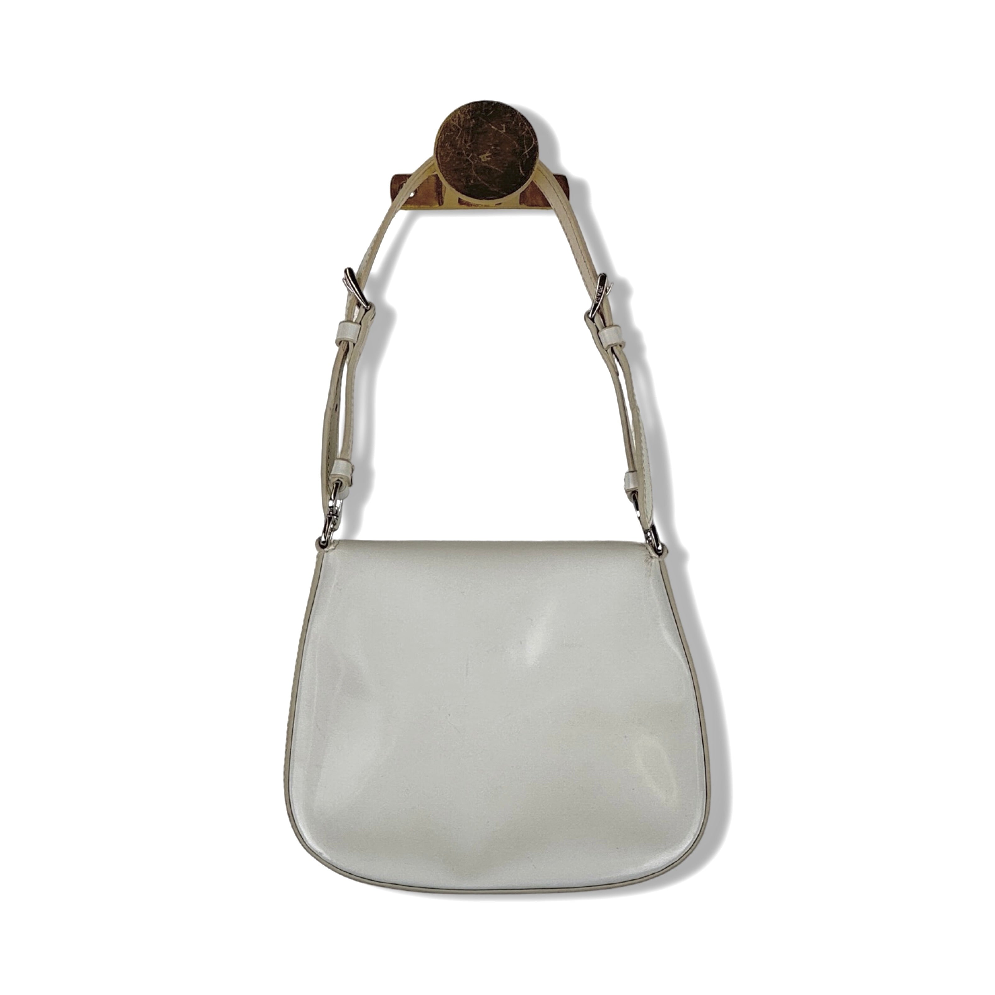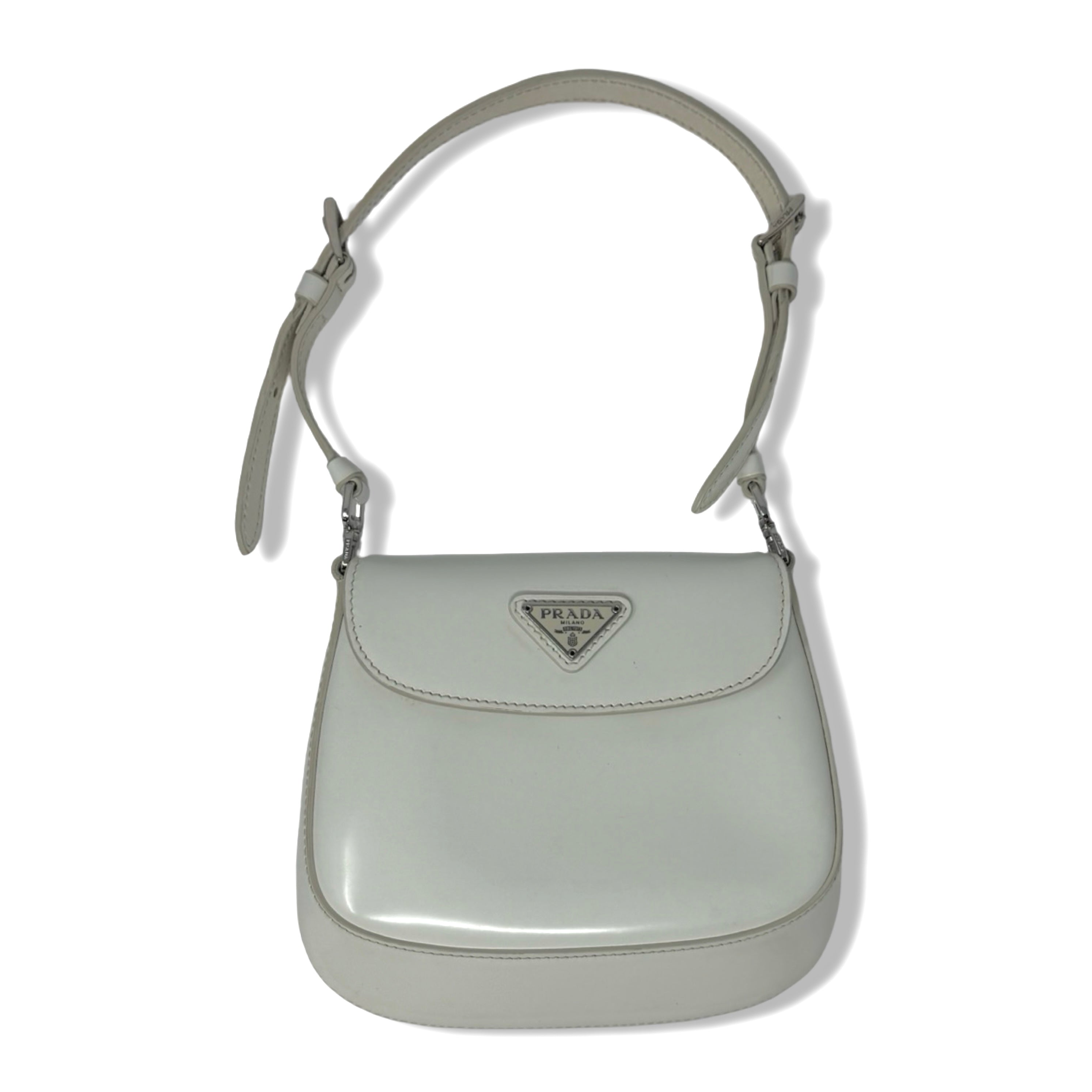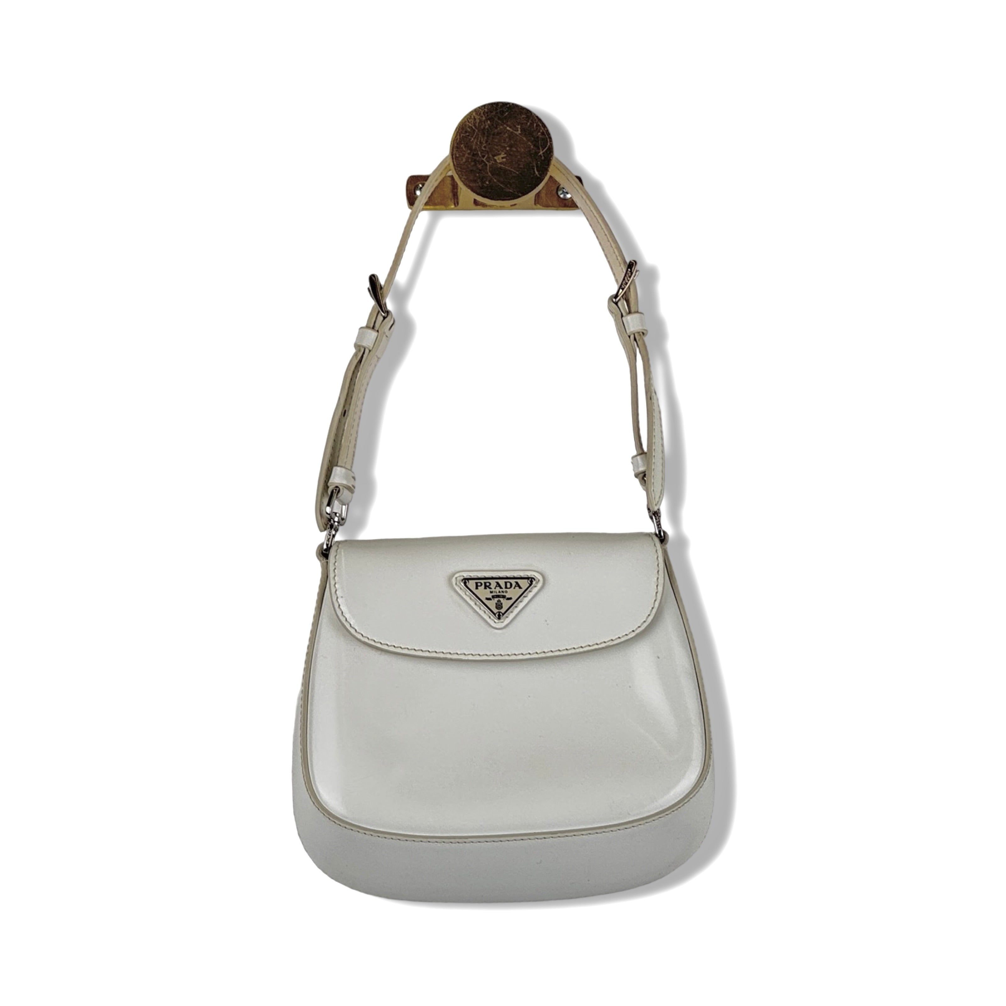 - Mini shoulder bag with leather shoulder strap with extension, Prada enamel logo on front, magnetic flap closure, and 3 interior card slots. Designer dustbag included. Some signs of wear (pictured).