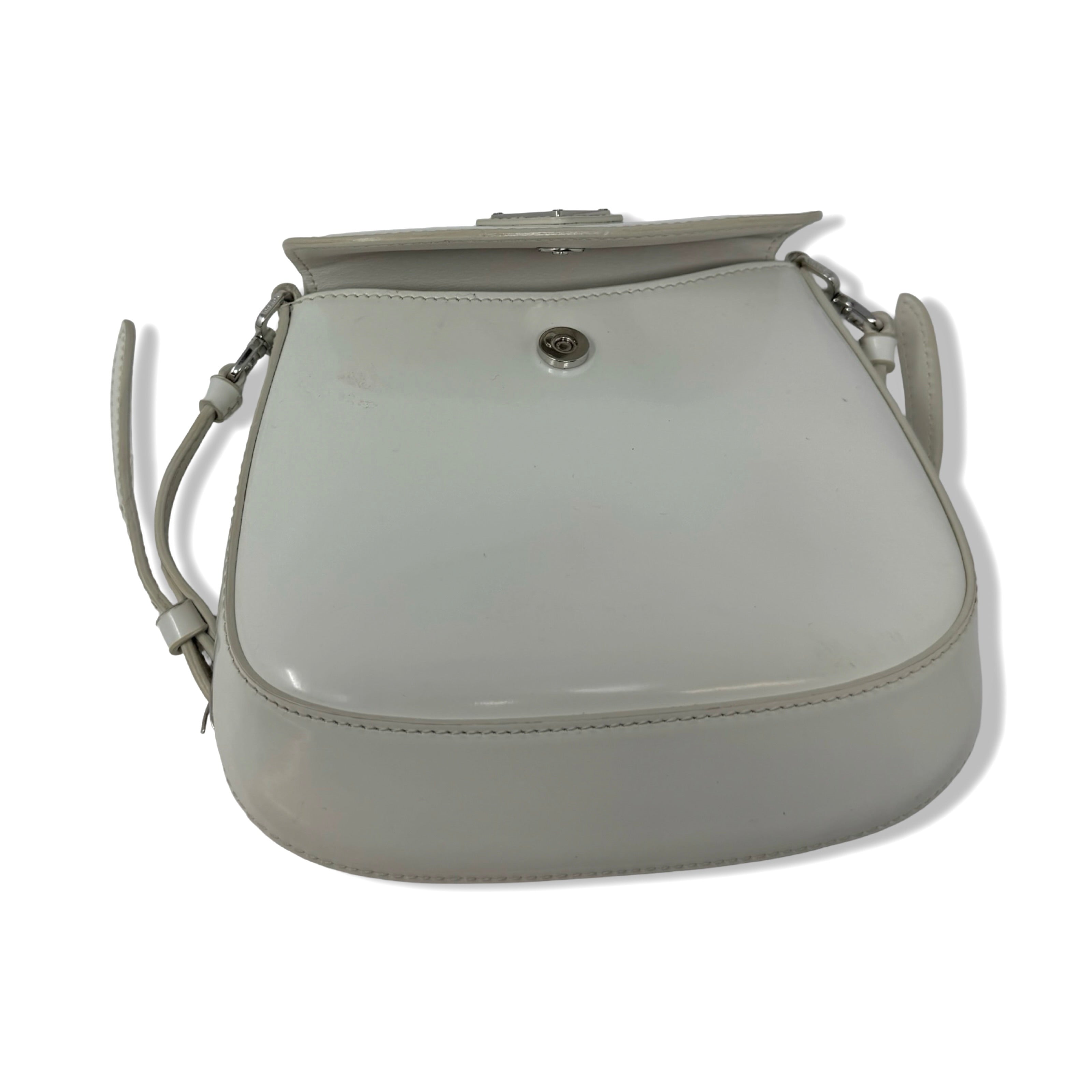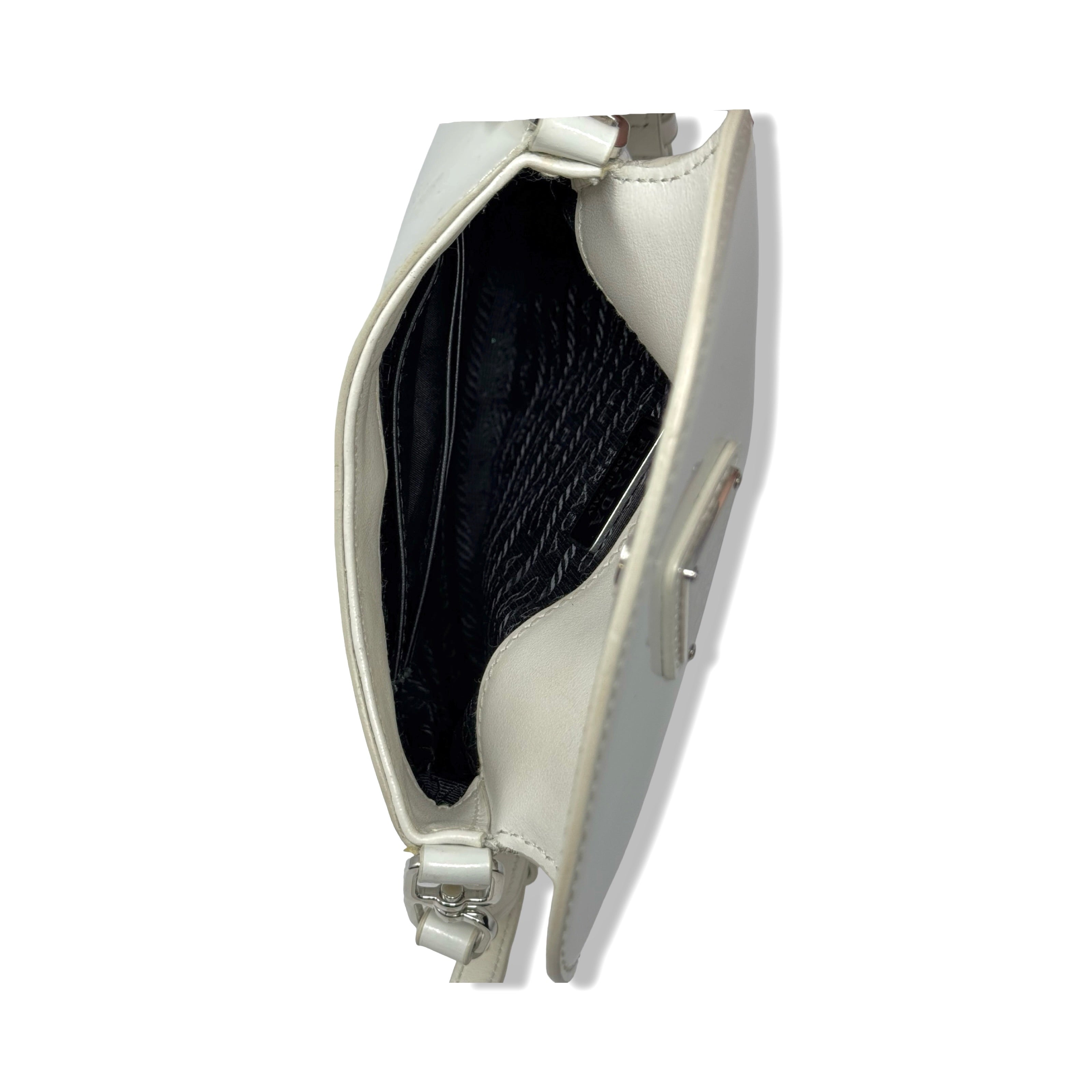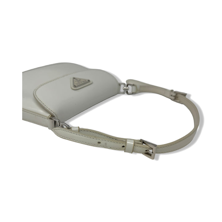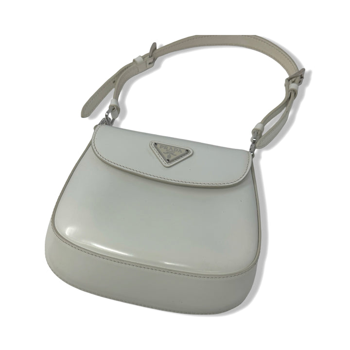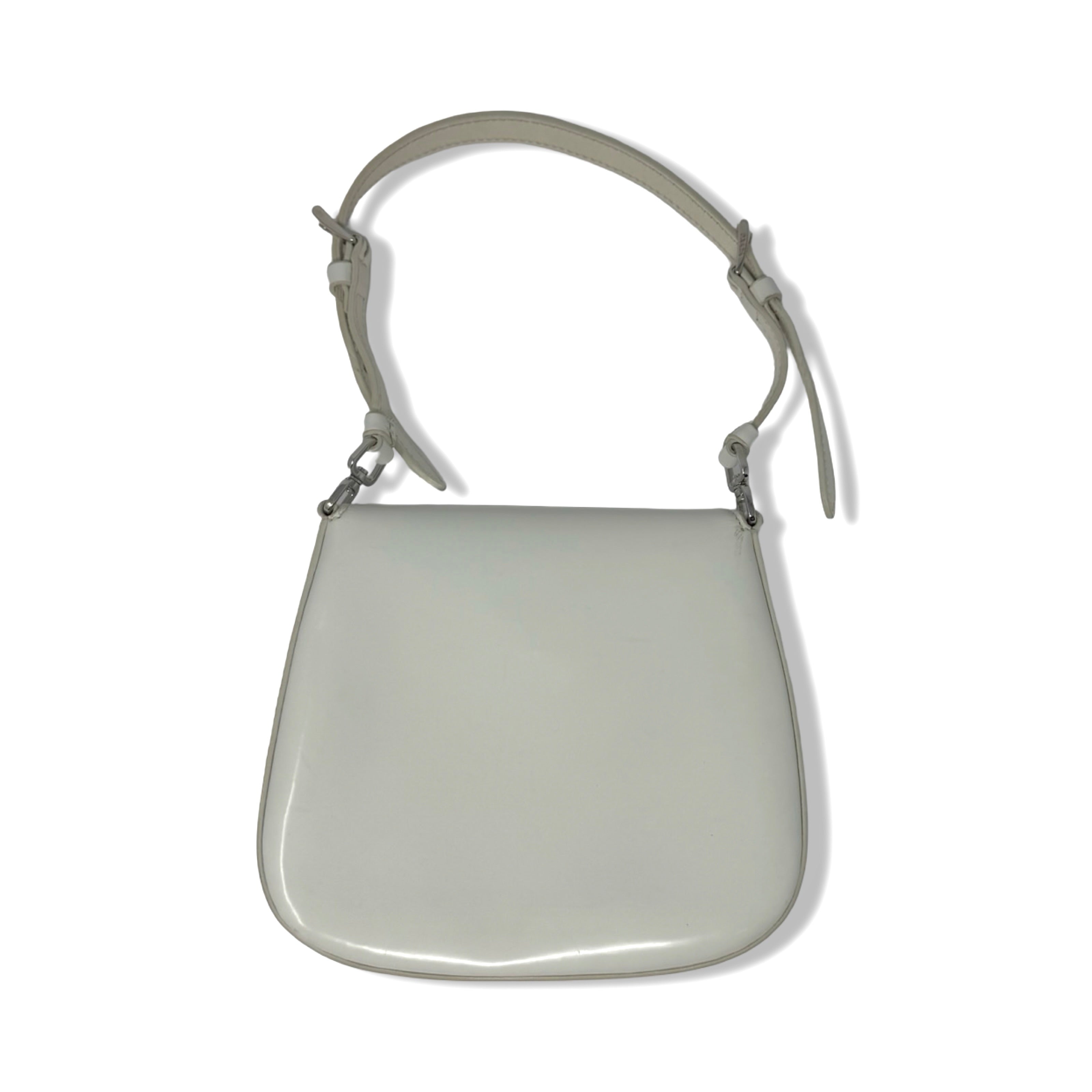 - Mini shoulder bag with leather shoulder strap with extension, Prada enamel logo on front, magnetic flap closure, and 3 interior card slots. Designer dustbag included. Some signs of wear (pictured).