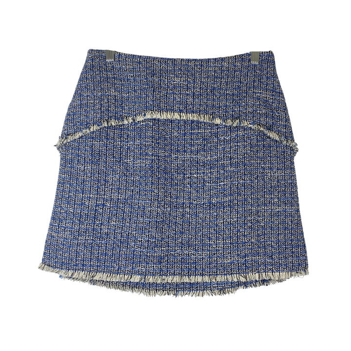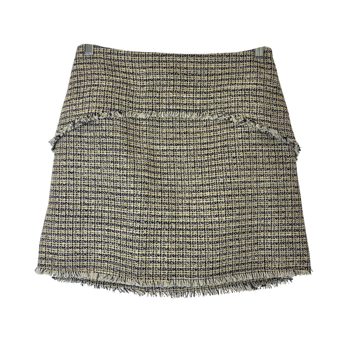 - Tweed miniskirt with a trim detail of fringe at the hem and a curved seam. Includes a back zip closure.