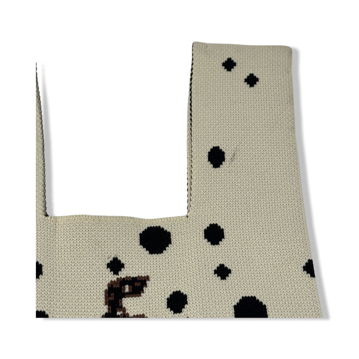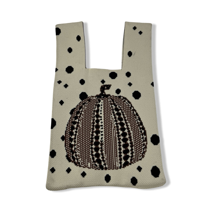 - Small knit tote bag with polka dot pattern and pumpkin print. Signs of wear