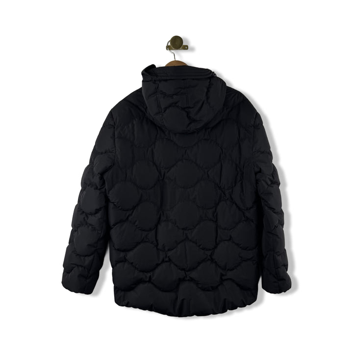 - Quilted down puffer jacket with hood. Listed as TU/One Size. Looks like size Large, Please check measurements