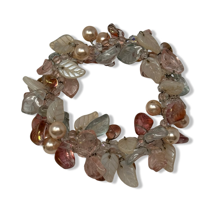 - Bead bracelet with leaf and faux pearl beads throughout.