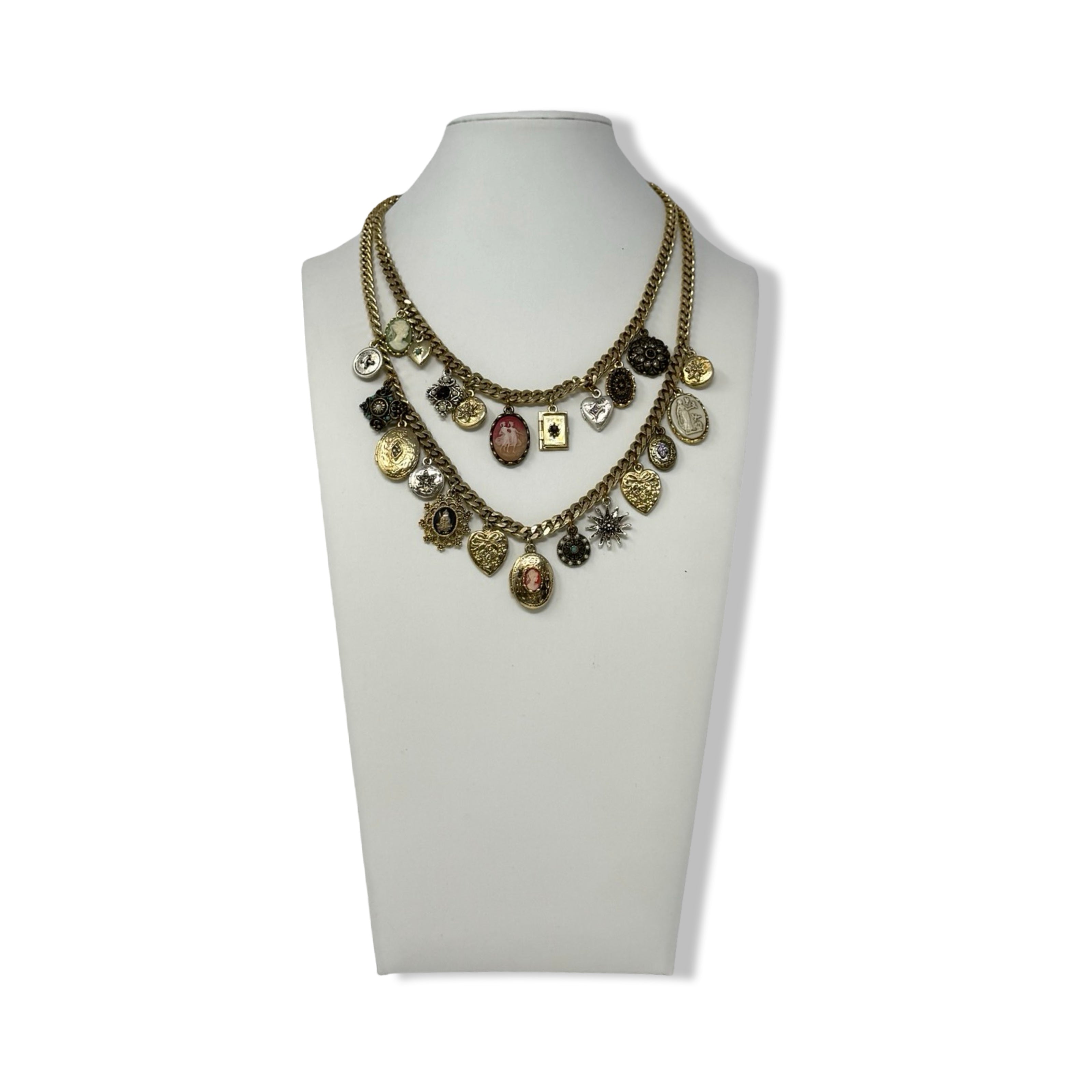 - Link chain necklace with charms throughout.