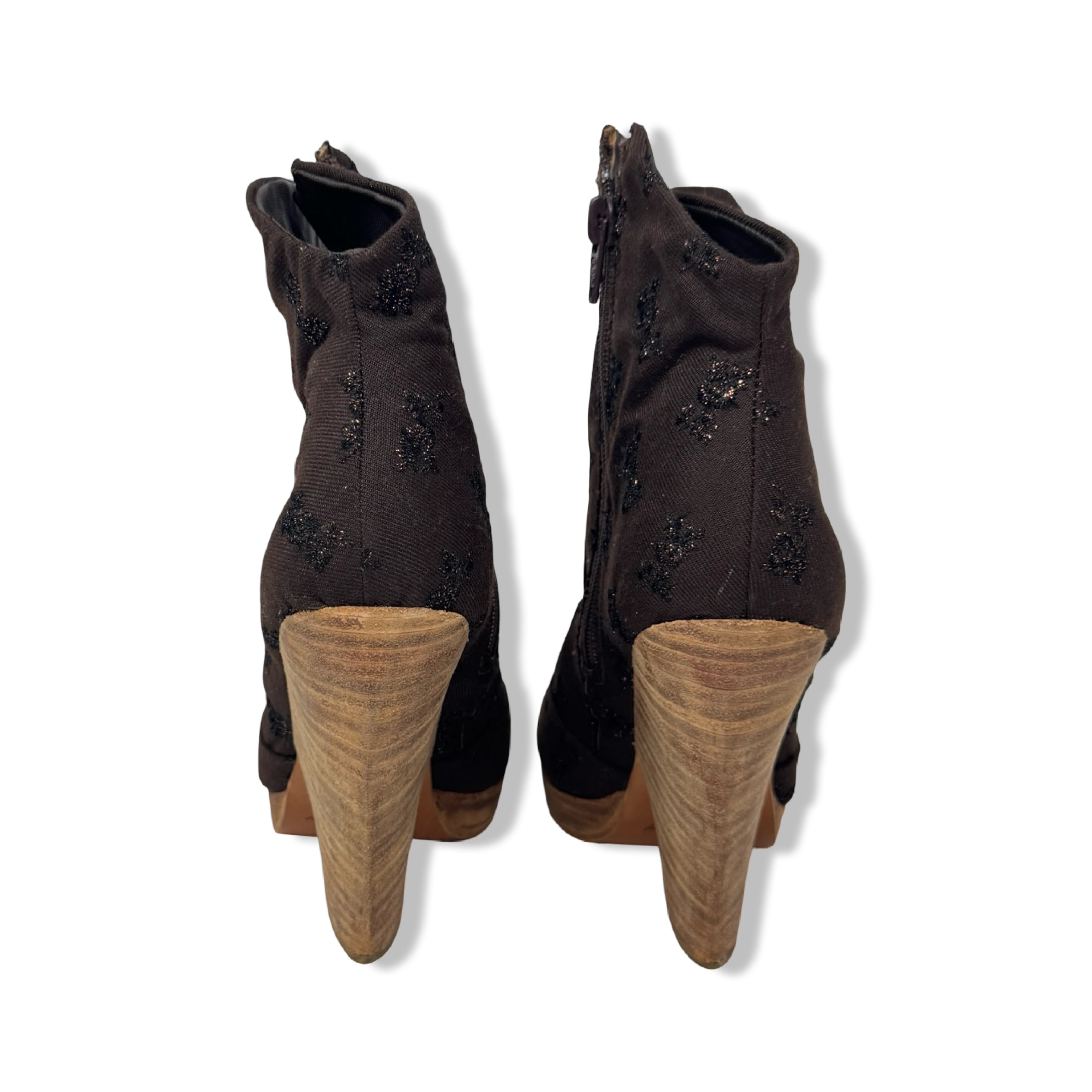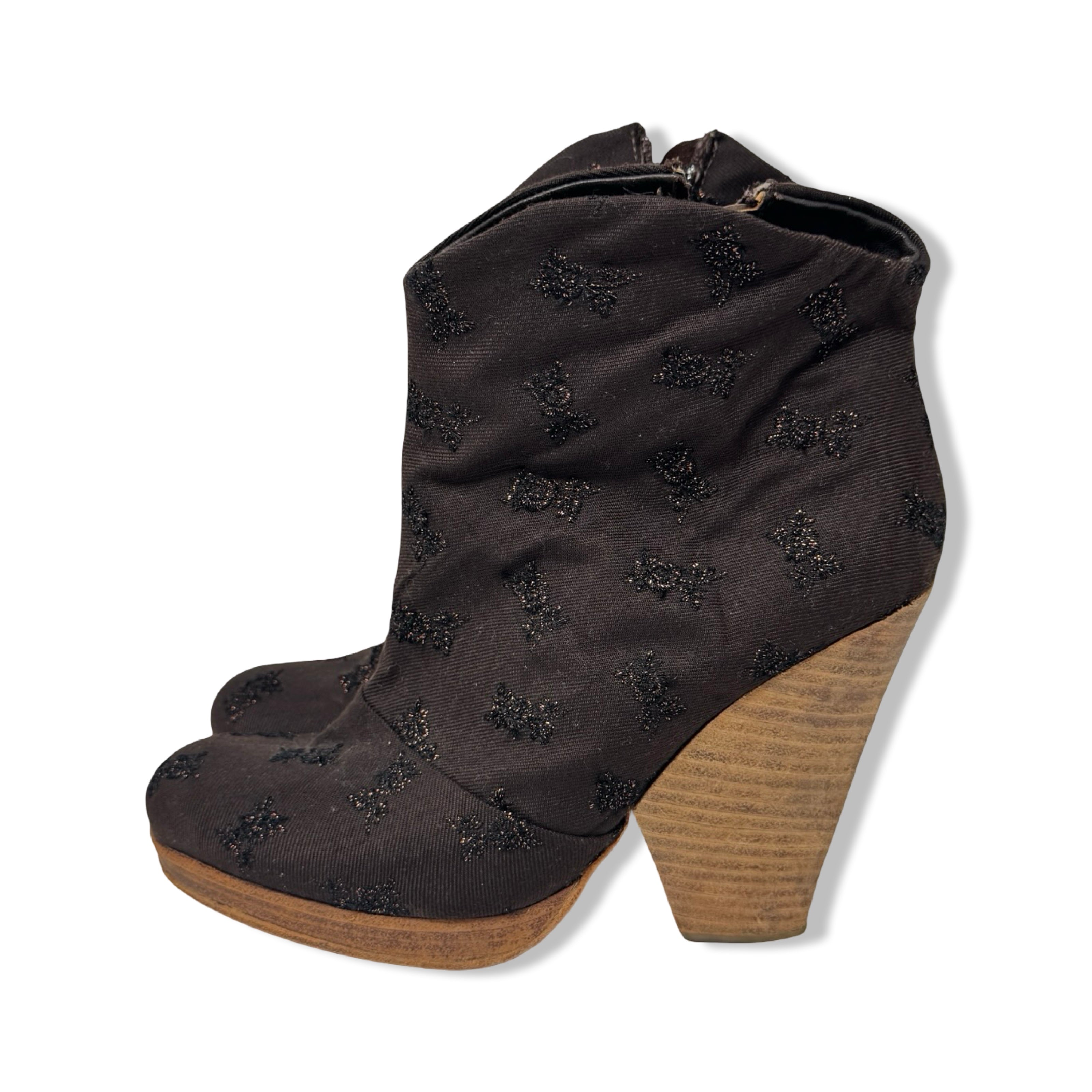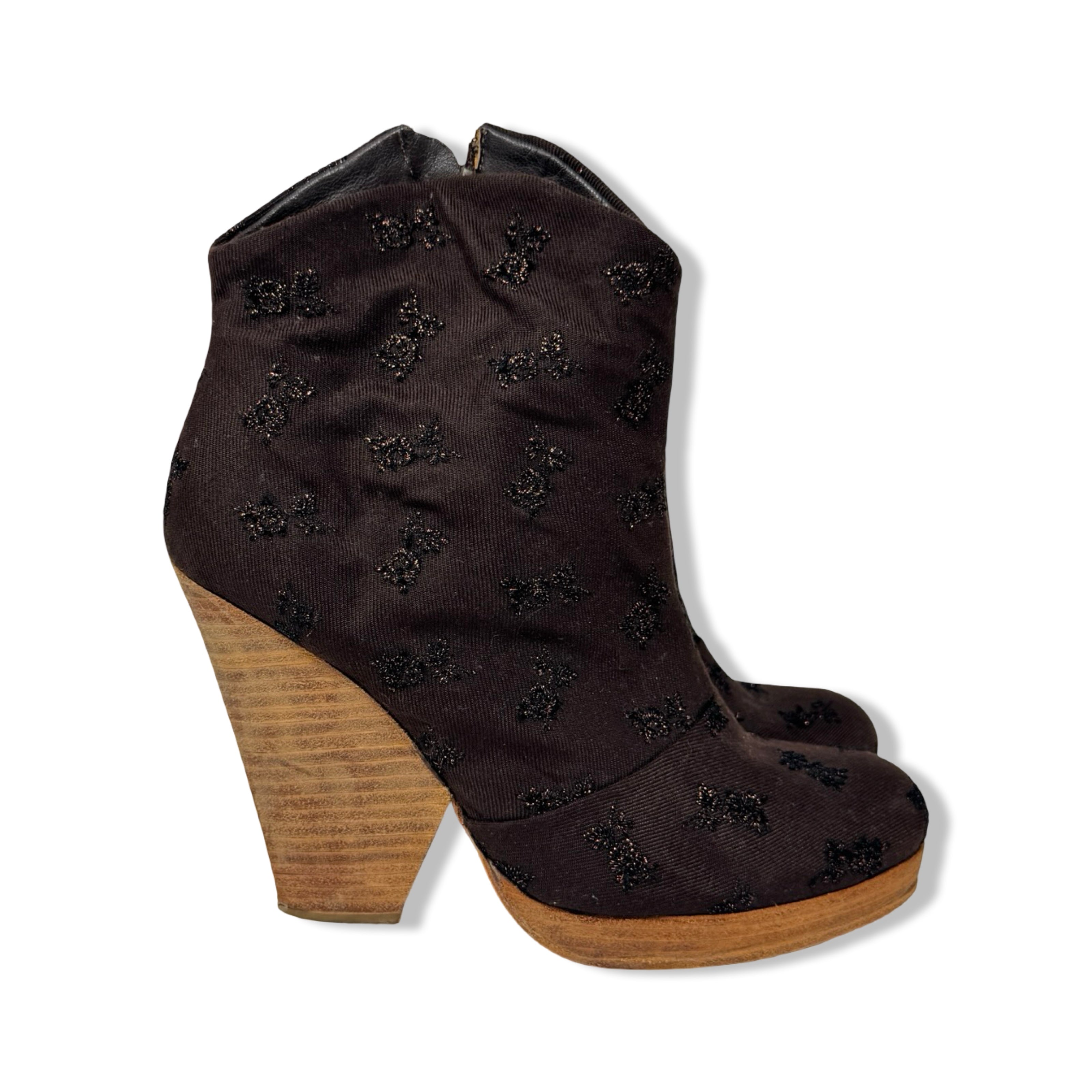 - Pull on booties with canvas upper and metallic floral pattern throughout. Side zip closure and wooden heel