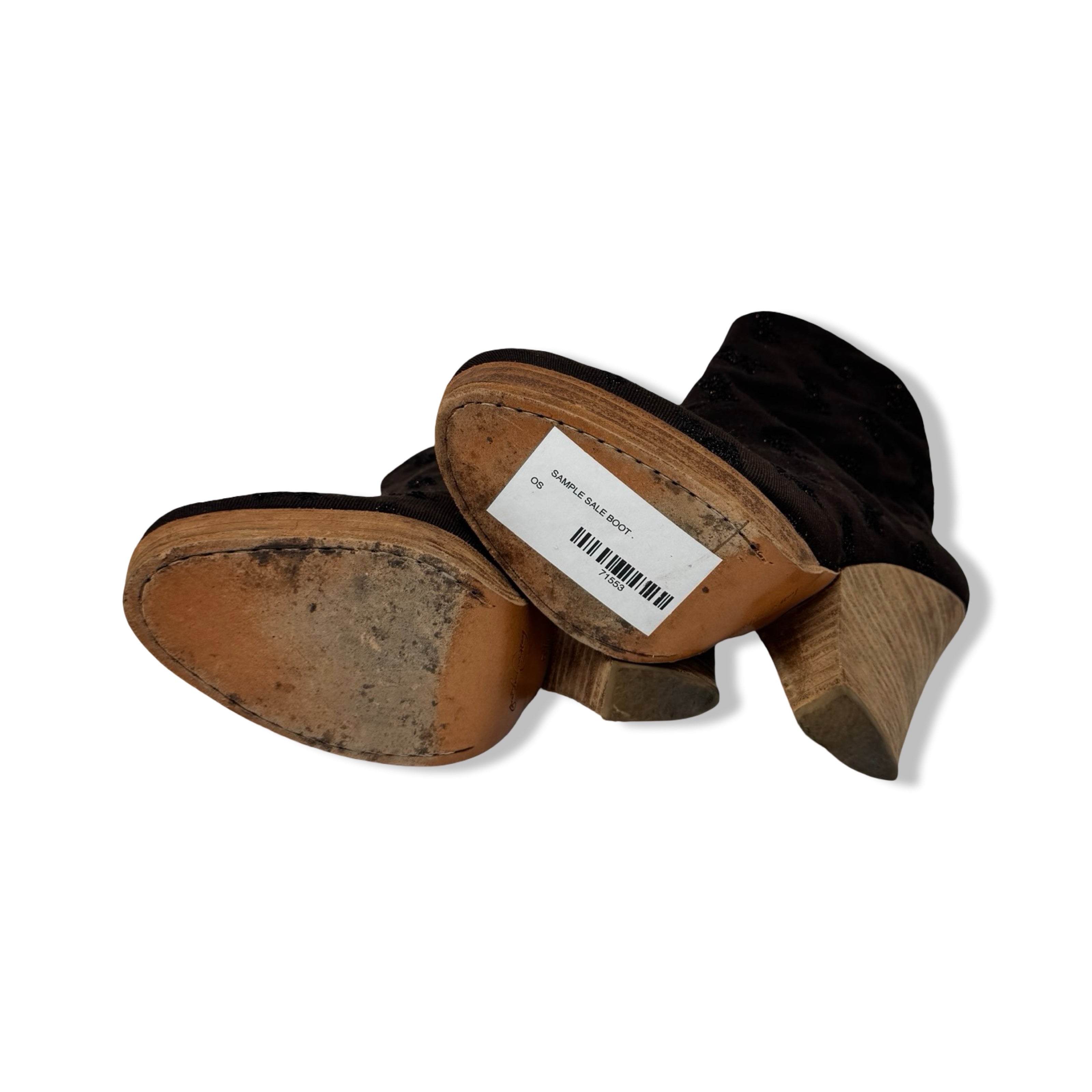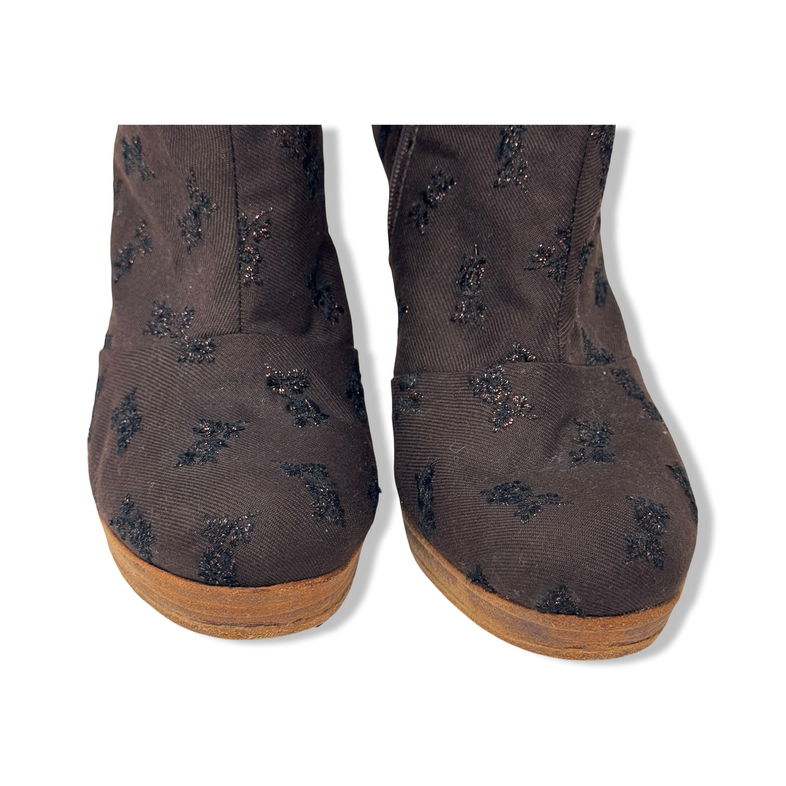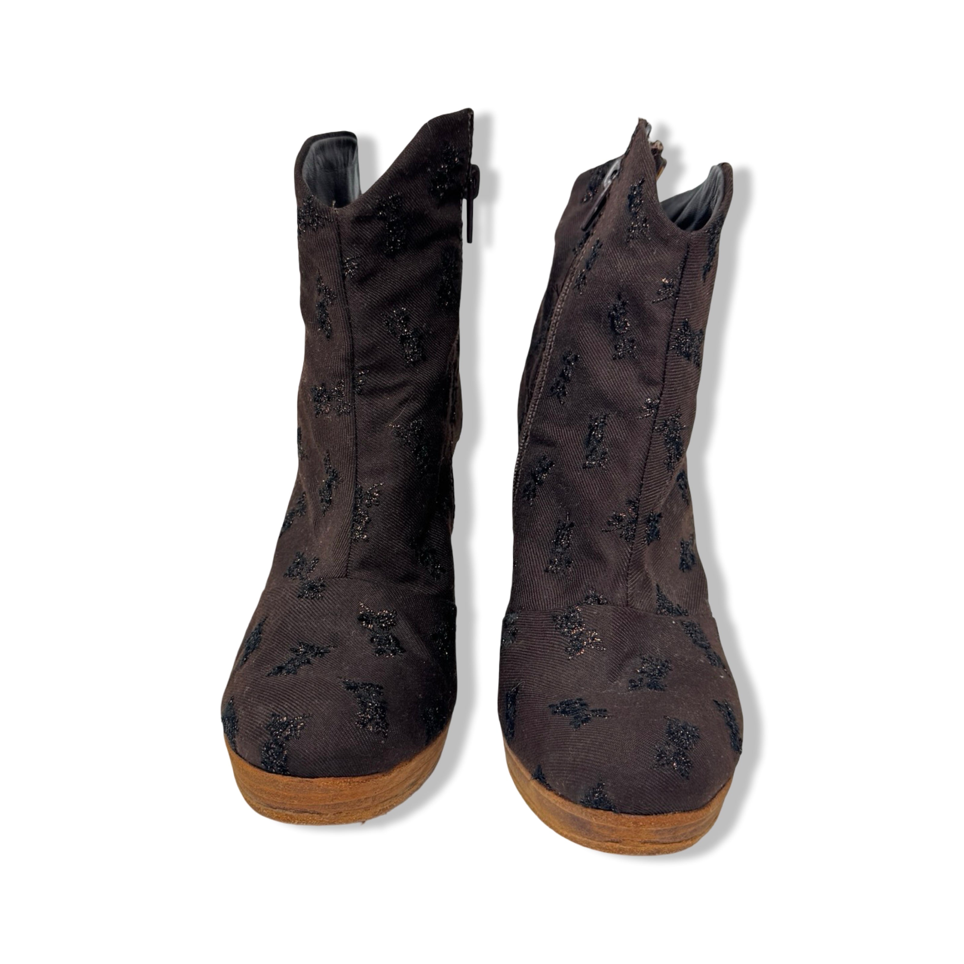 - Pull on booties with canvas upper and metallic floral pattern throughout. Side zip closure and wooden heel
