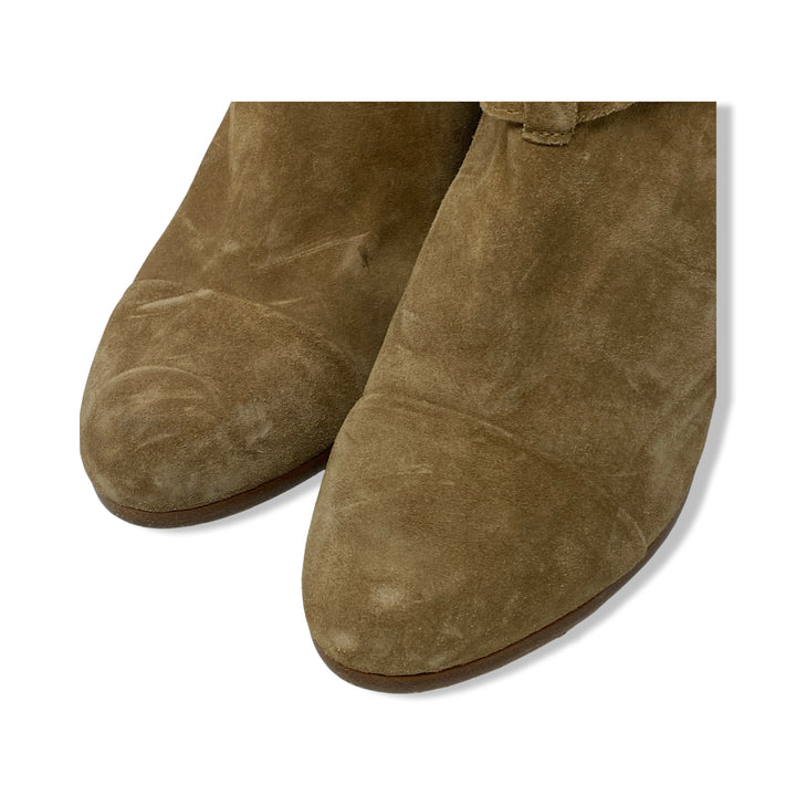 - Suede slip on bootie with strap closure on top and round toe.