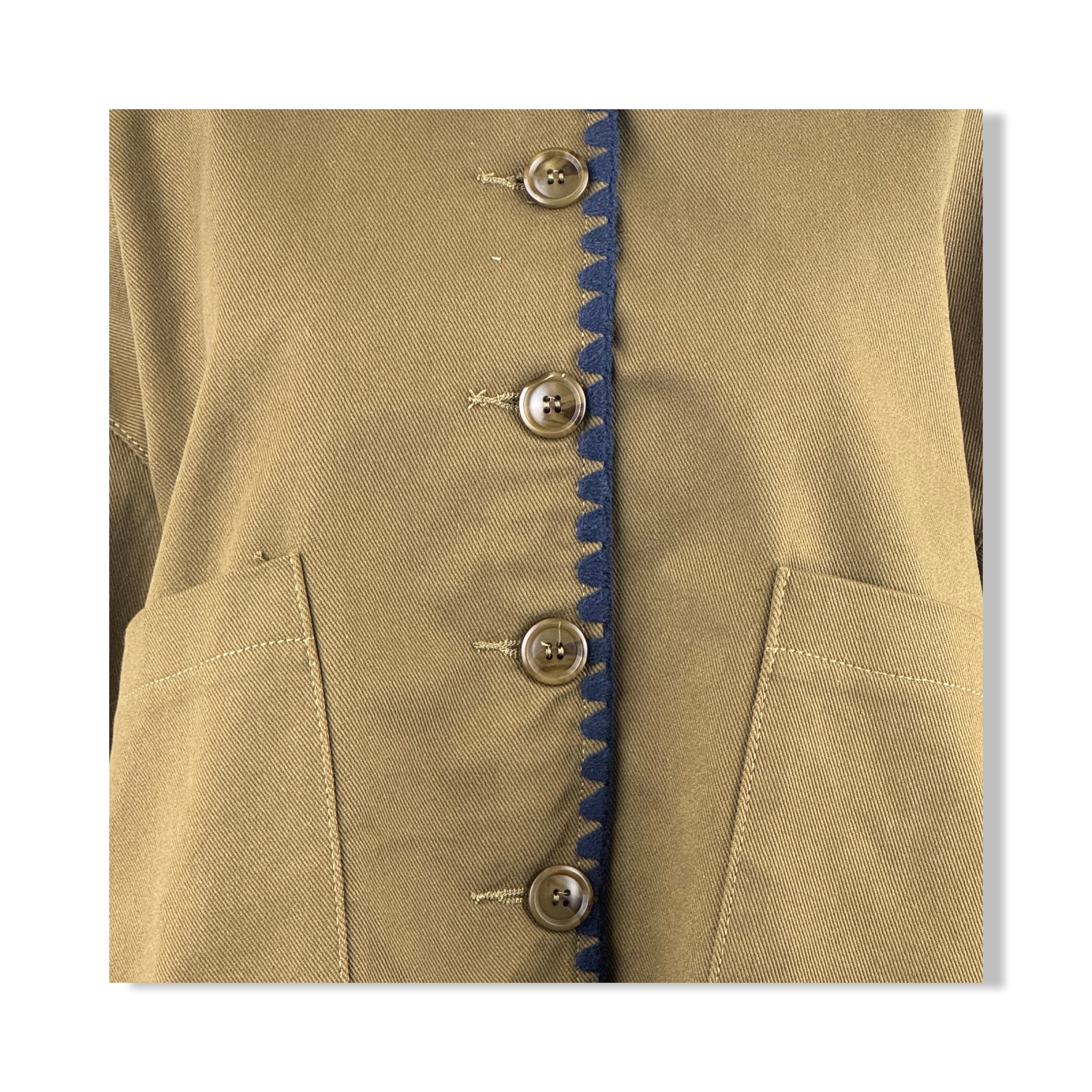- Button up collar jacket with front patch pockets and contrast stitching on trims.