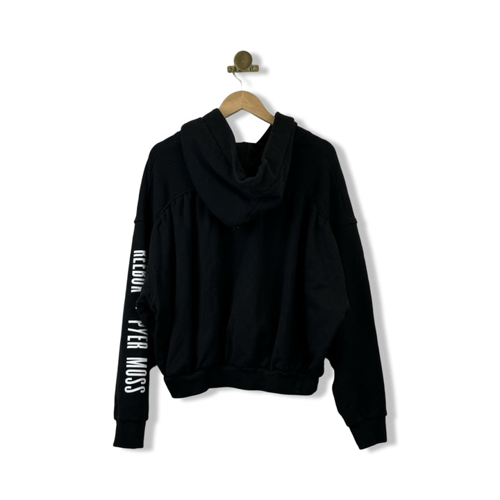 - Pullover hoodie with kangaroo pocket, long sleeves, and ribbed cuffs and hem. Missing drawstring.
