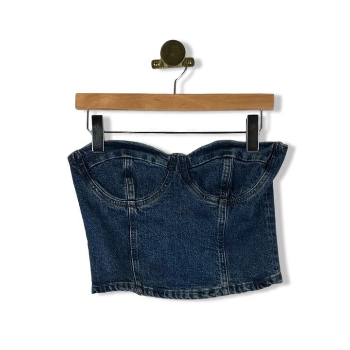 - Strapless denim top with back zip closure