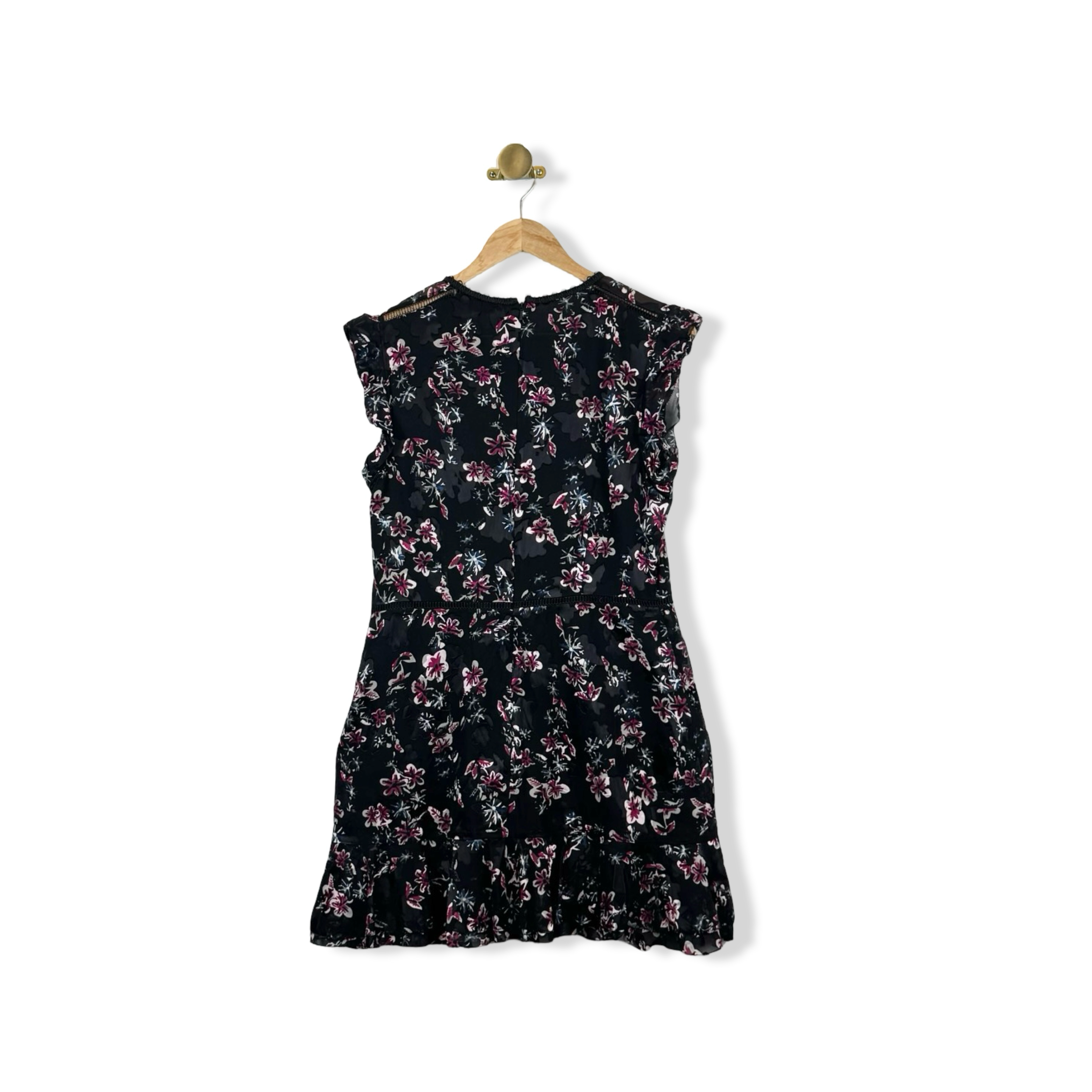 - Short sleeve floral mini dress with ruffle sleeves, and eyelet hem.