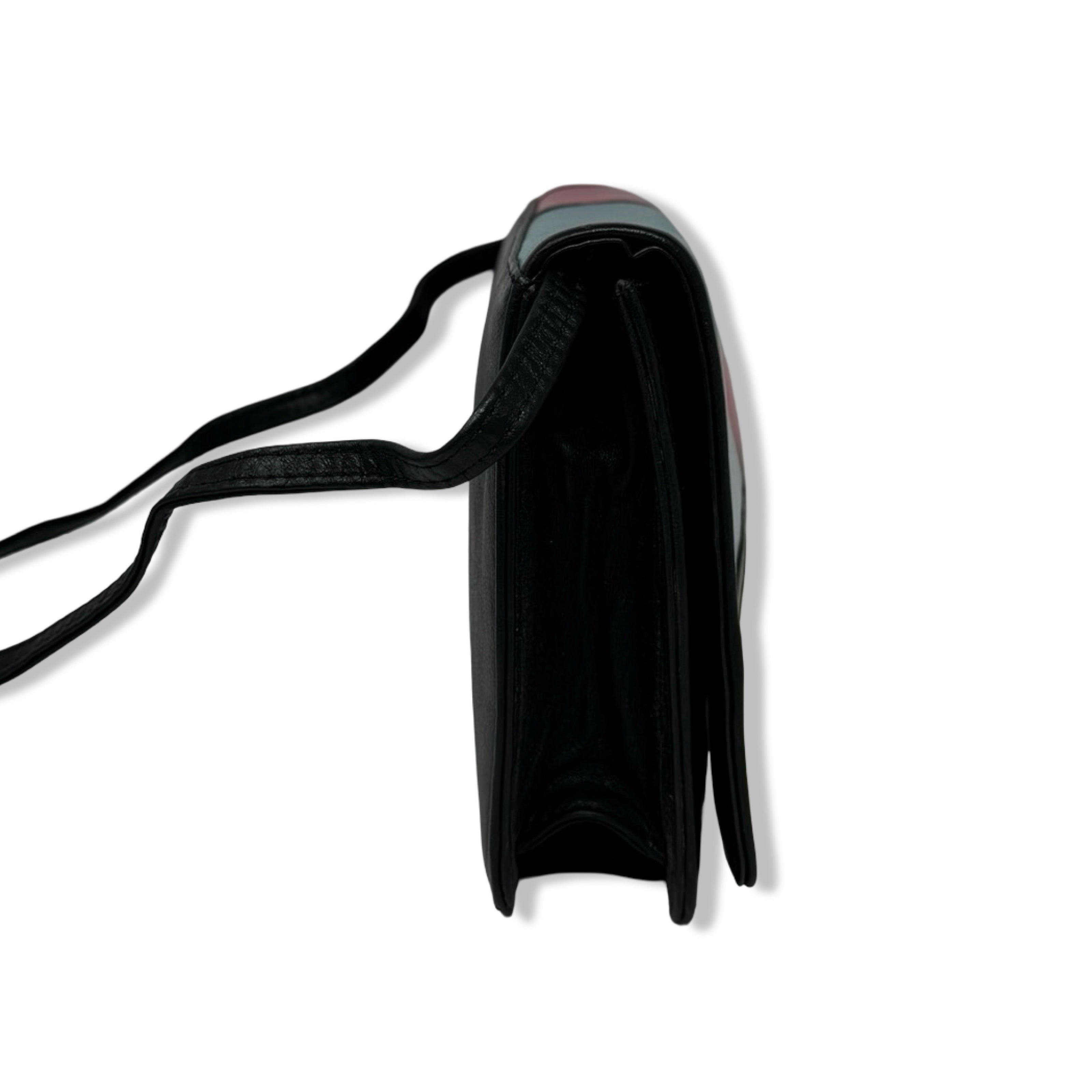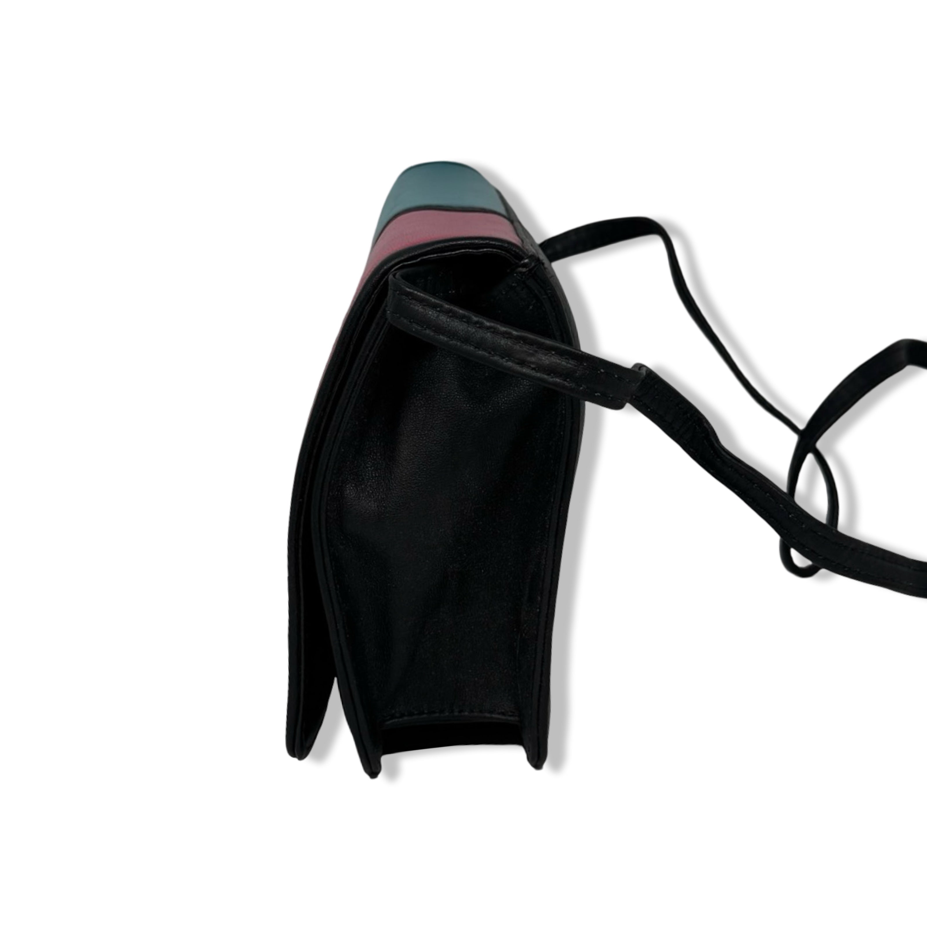 - Three panel colorblock clutch with snap closure and adjustable crossbody strap