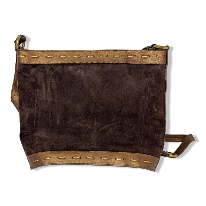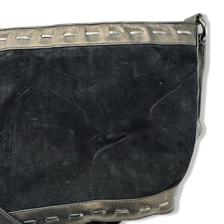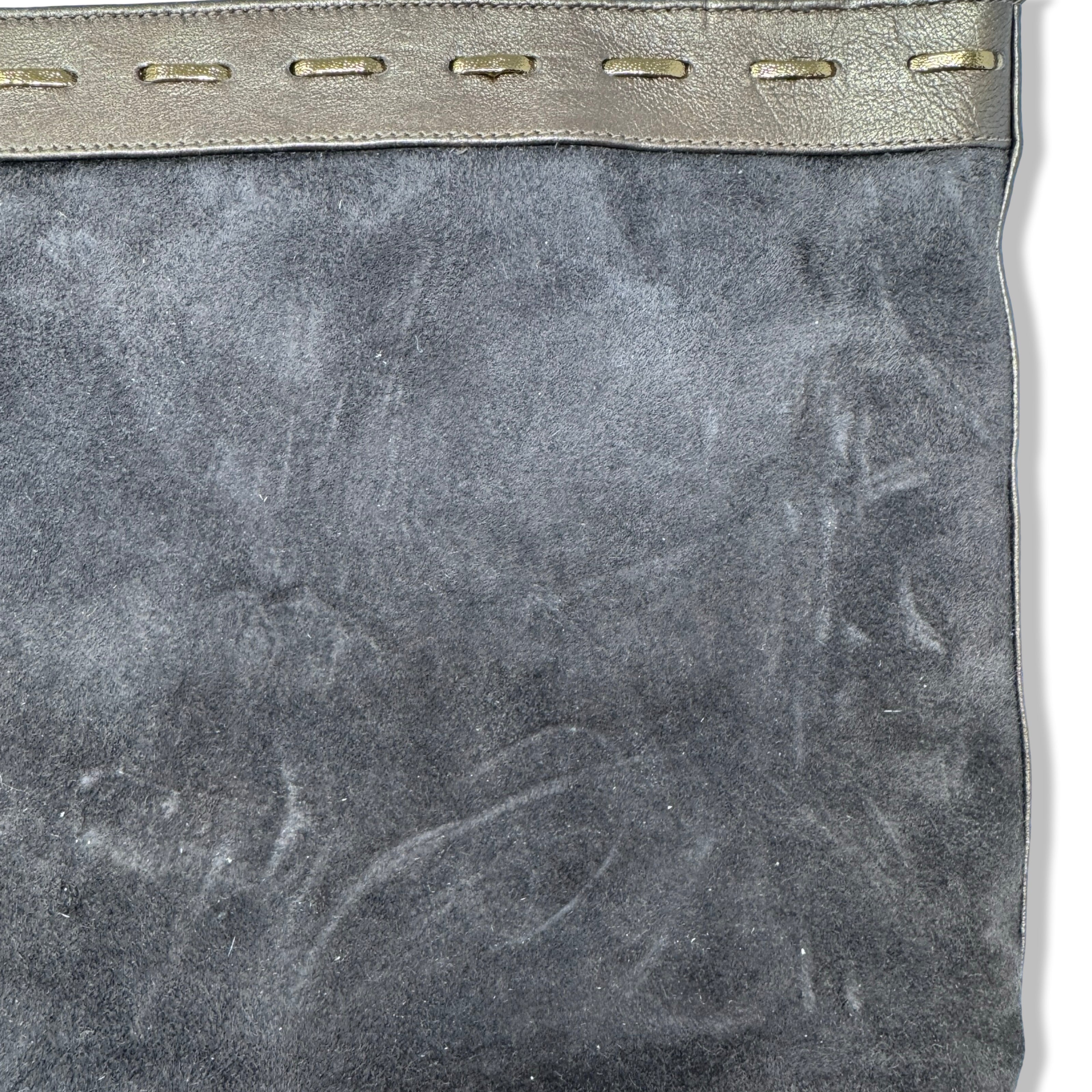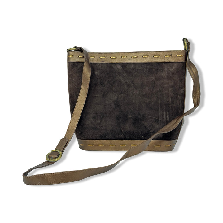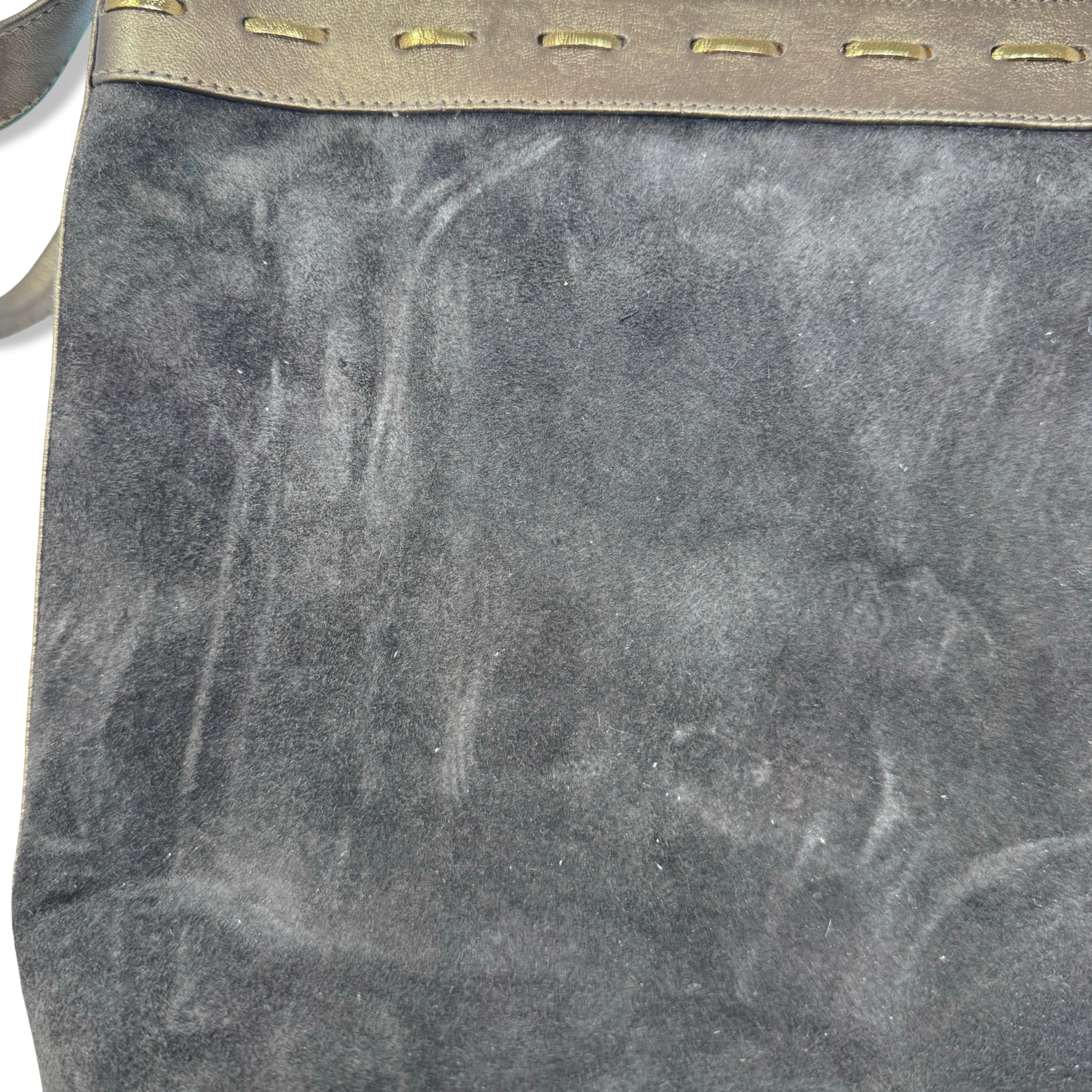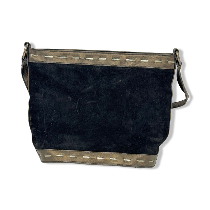 - Suede crossbody bag with metallic straps and stitching and zip closure. Signs of wear (pictured)