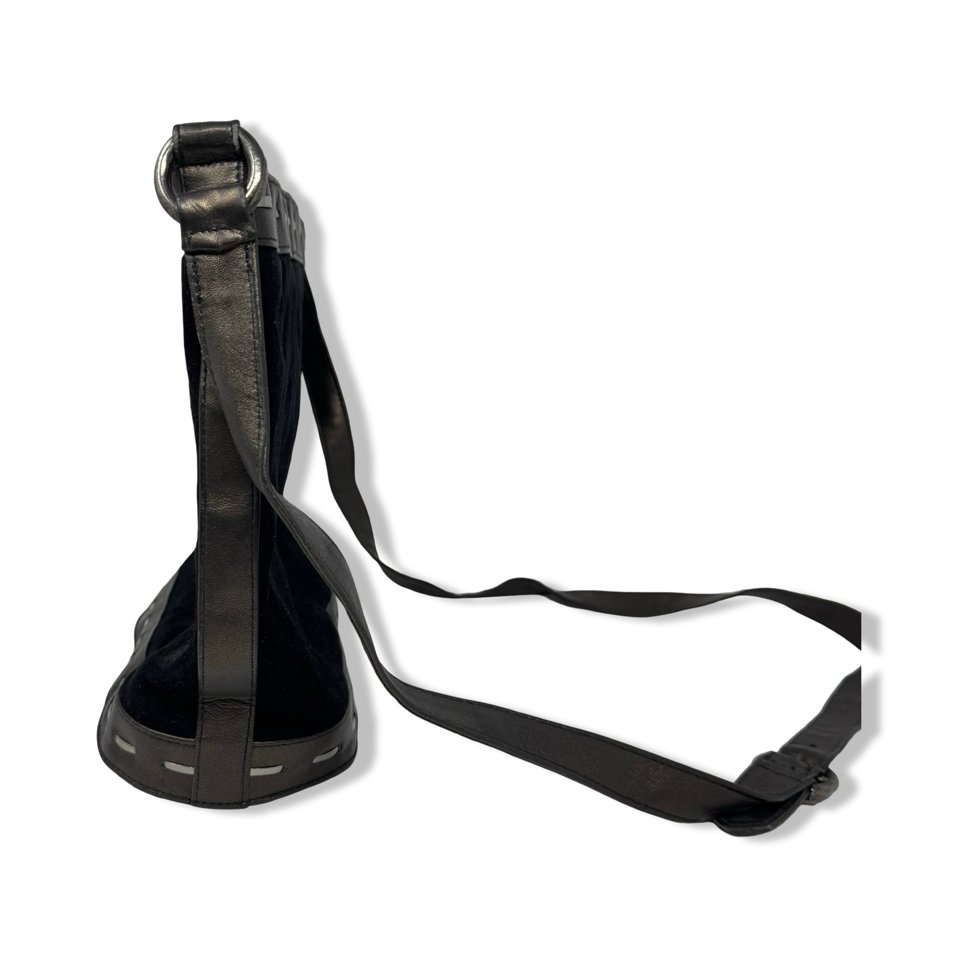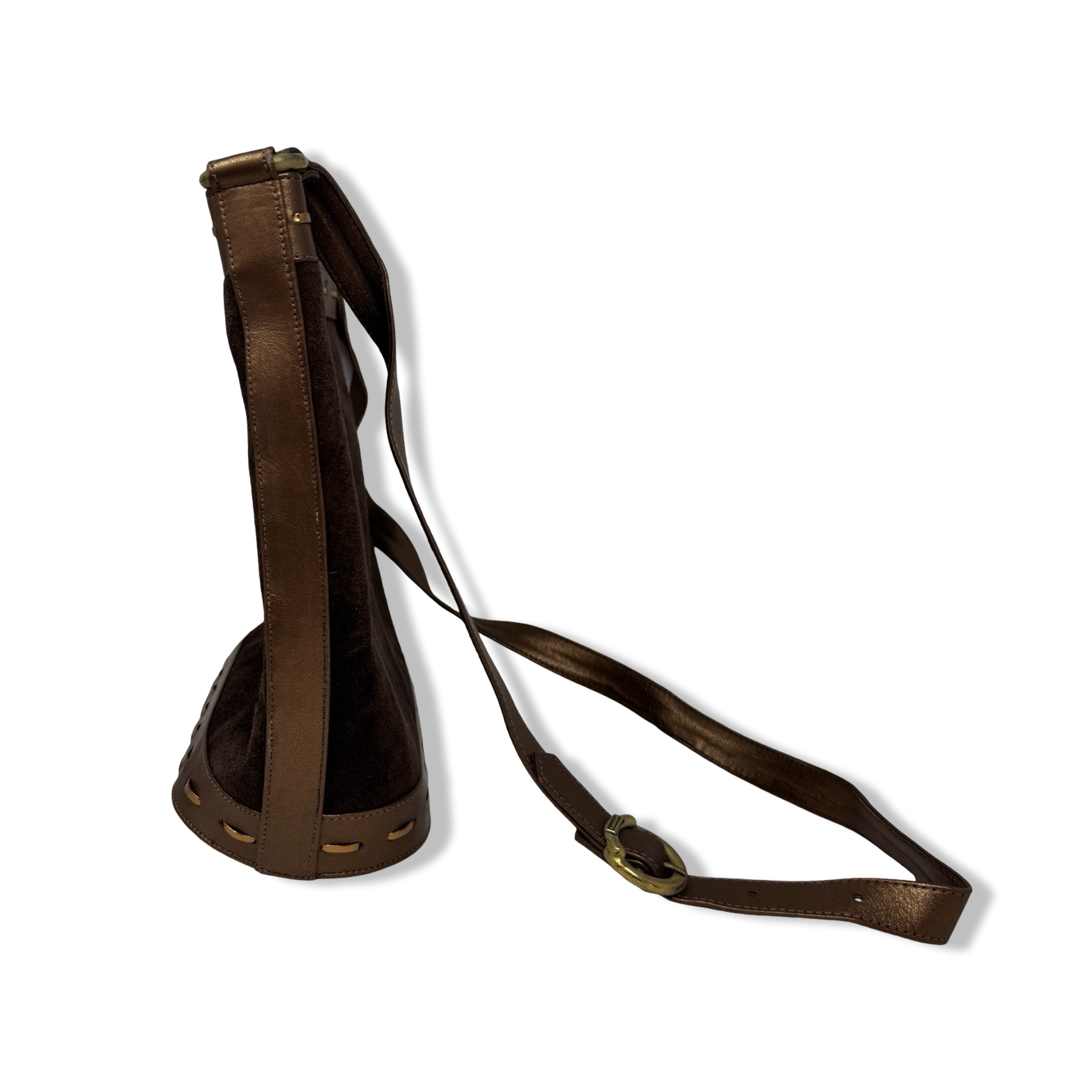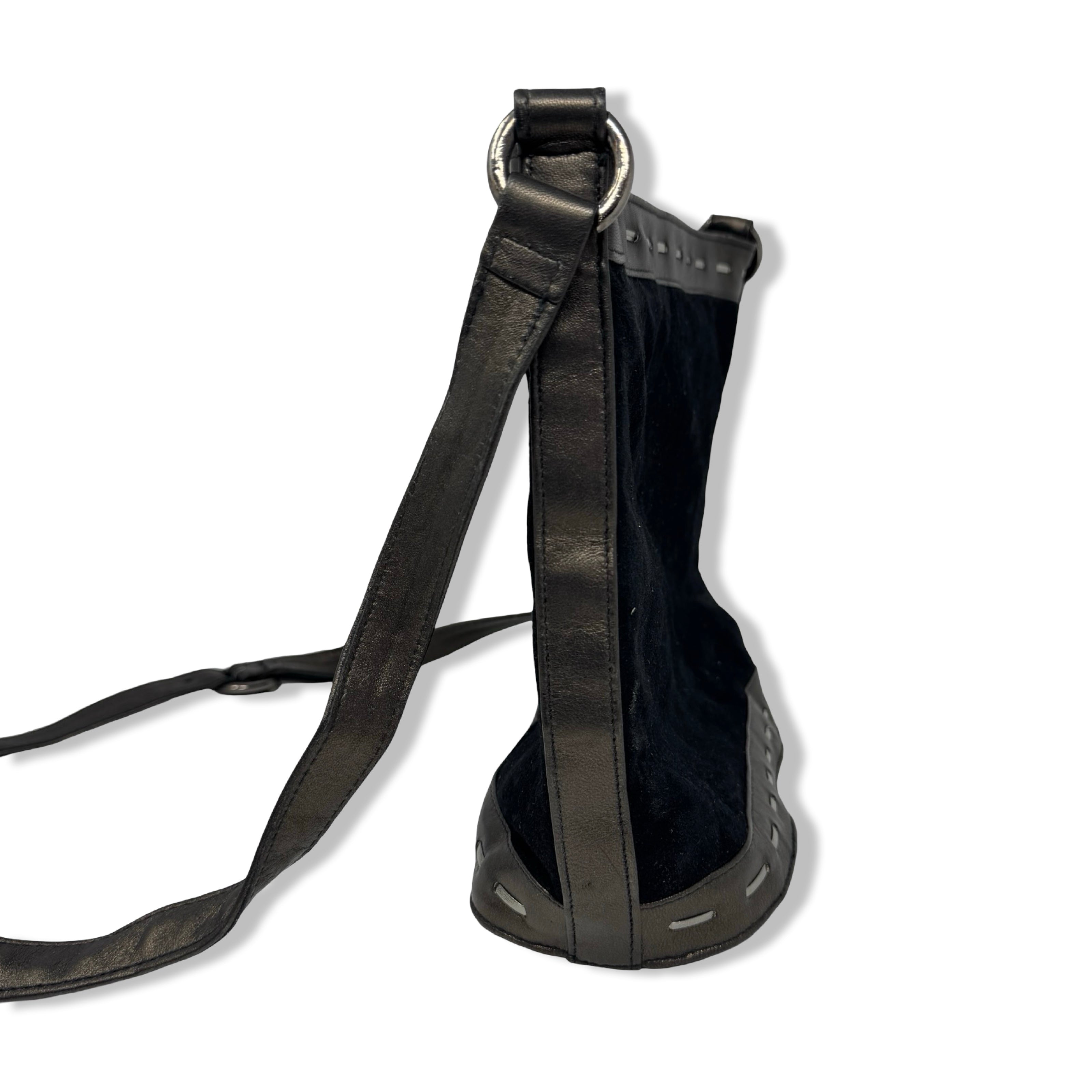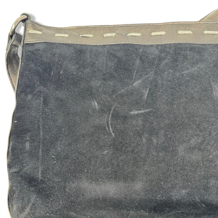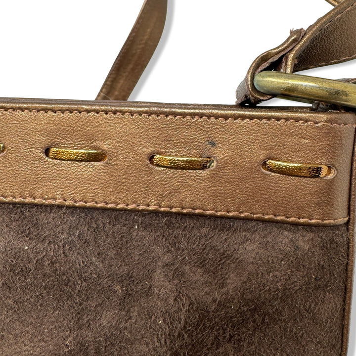- Suede crossbody bag with metallic straps and stitching and zip closure. Signs of wear (pictured)