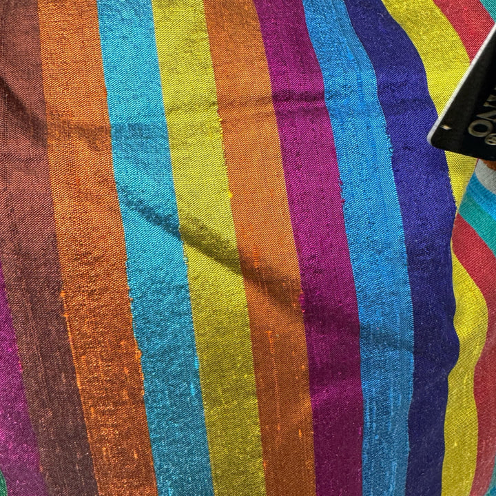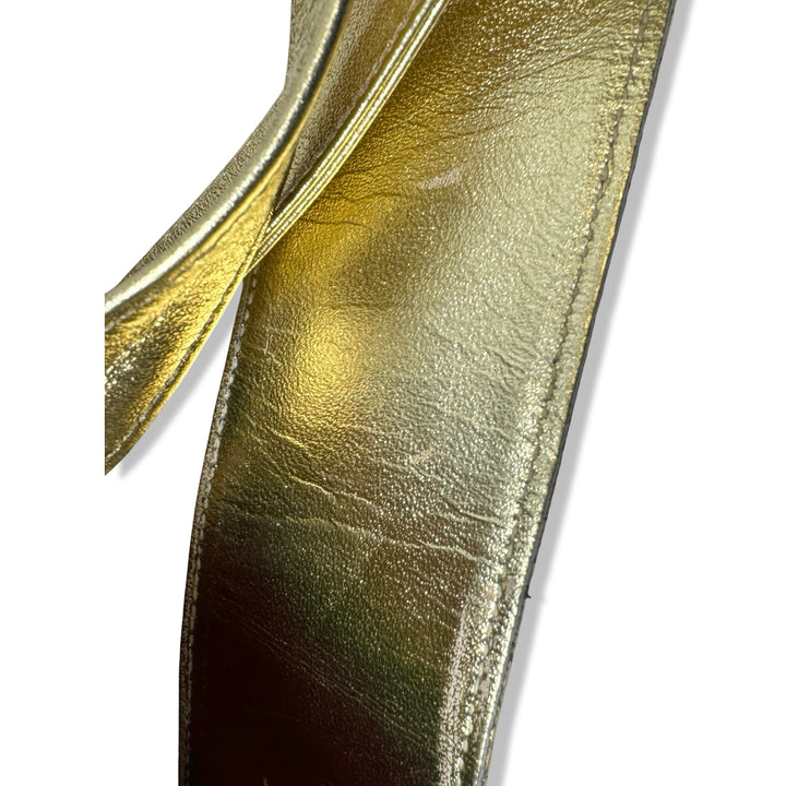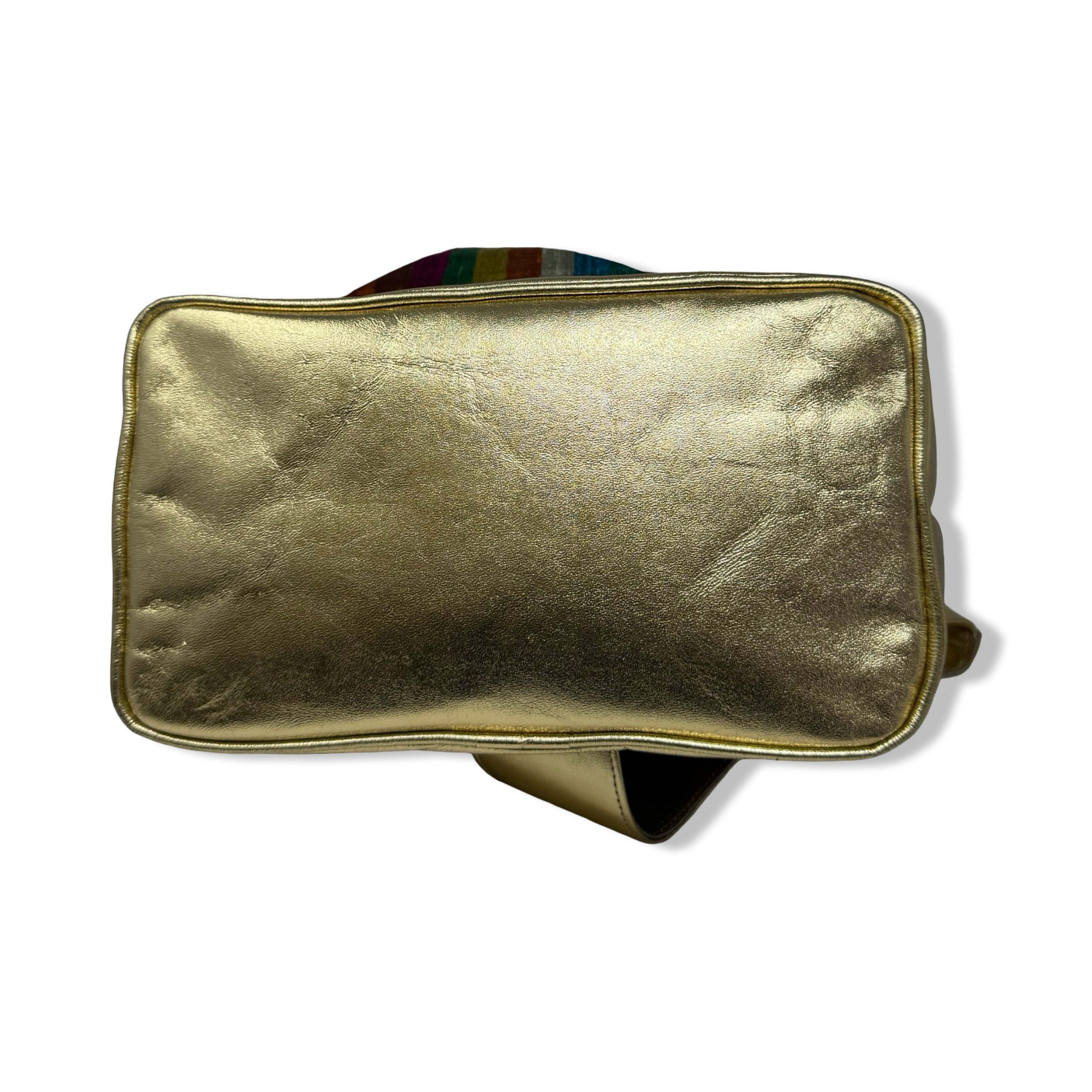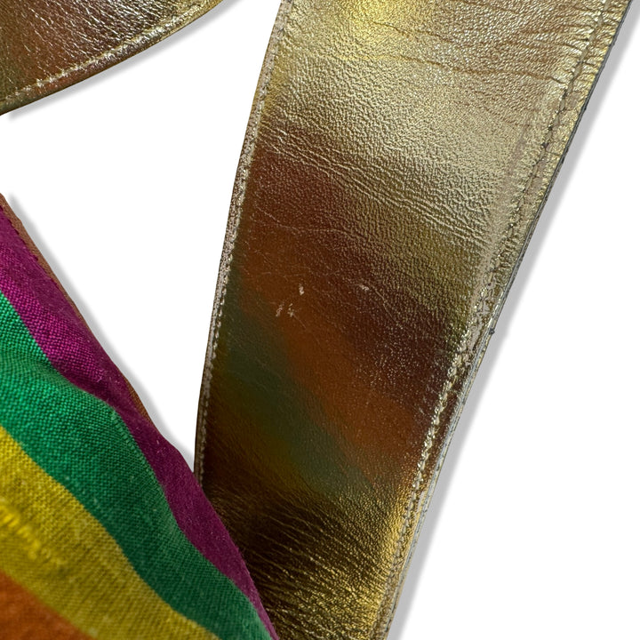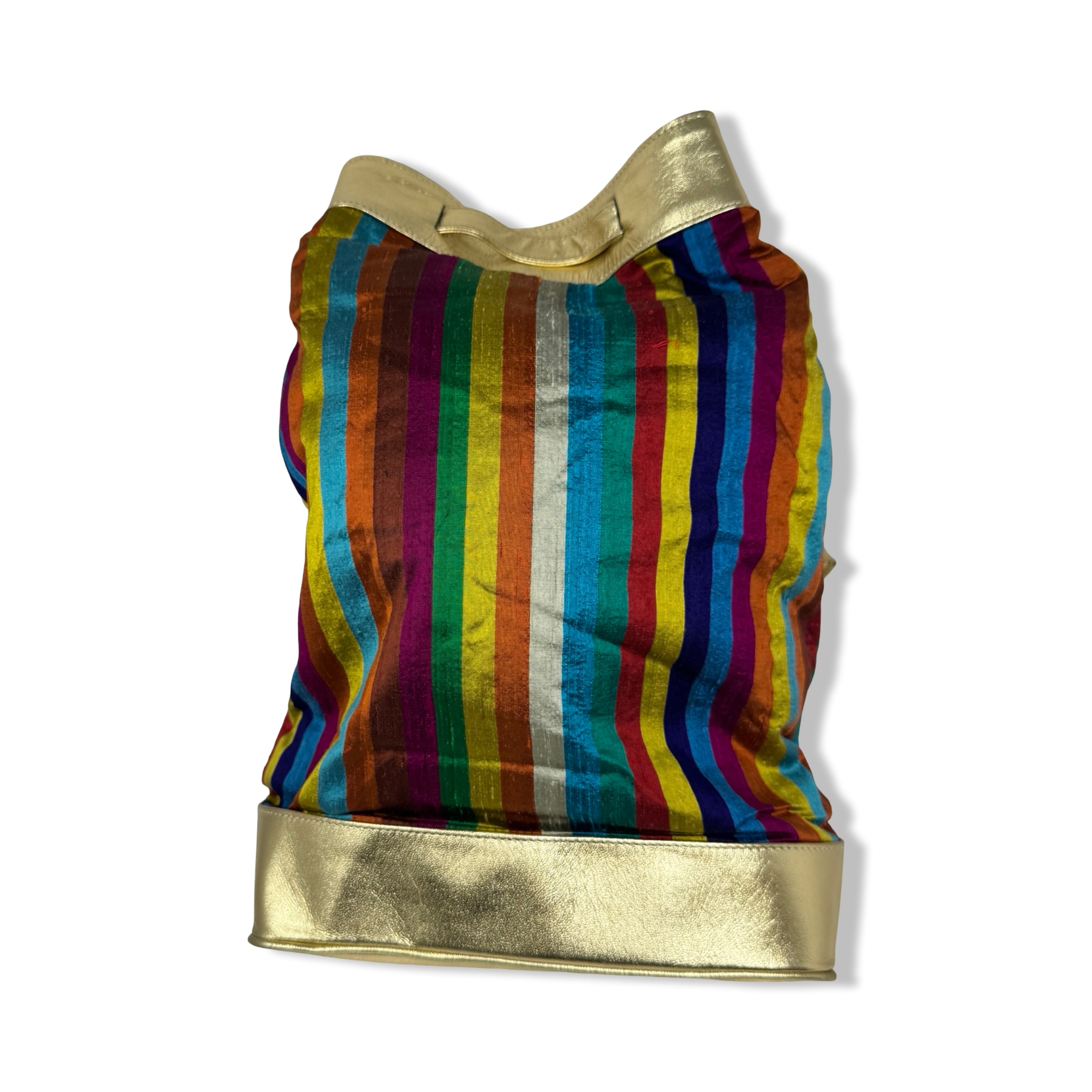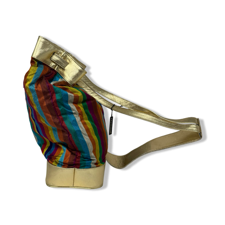 - Striped slingback bag with metallic straps and drawstring closure. Signs of wear (pictured)