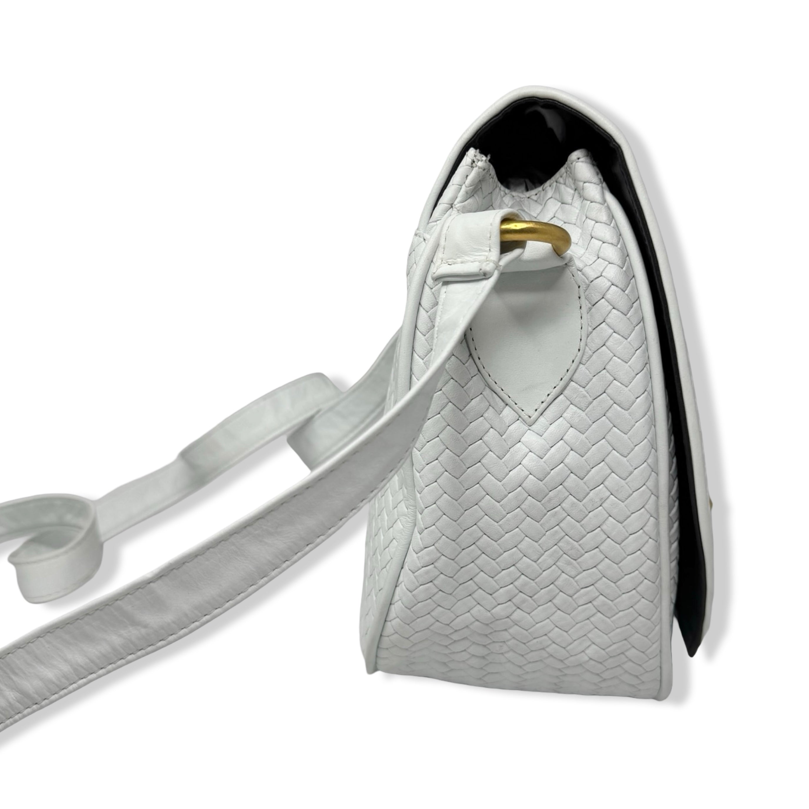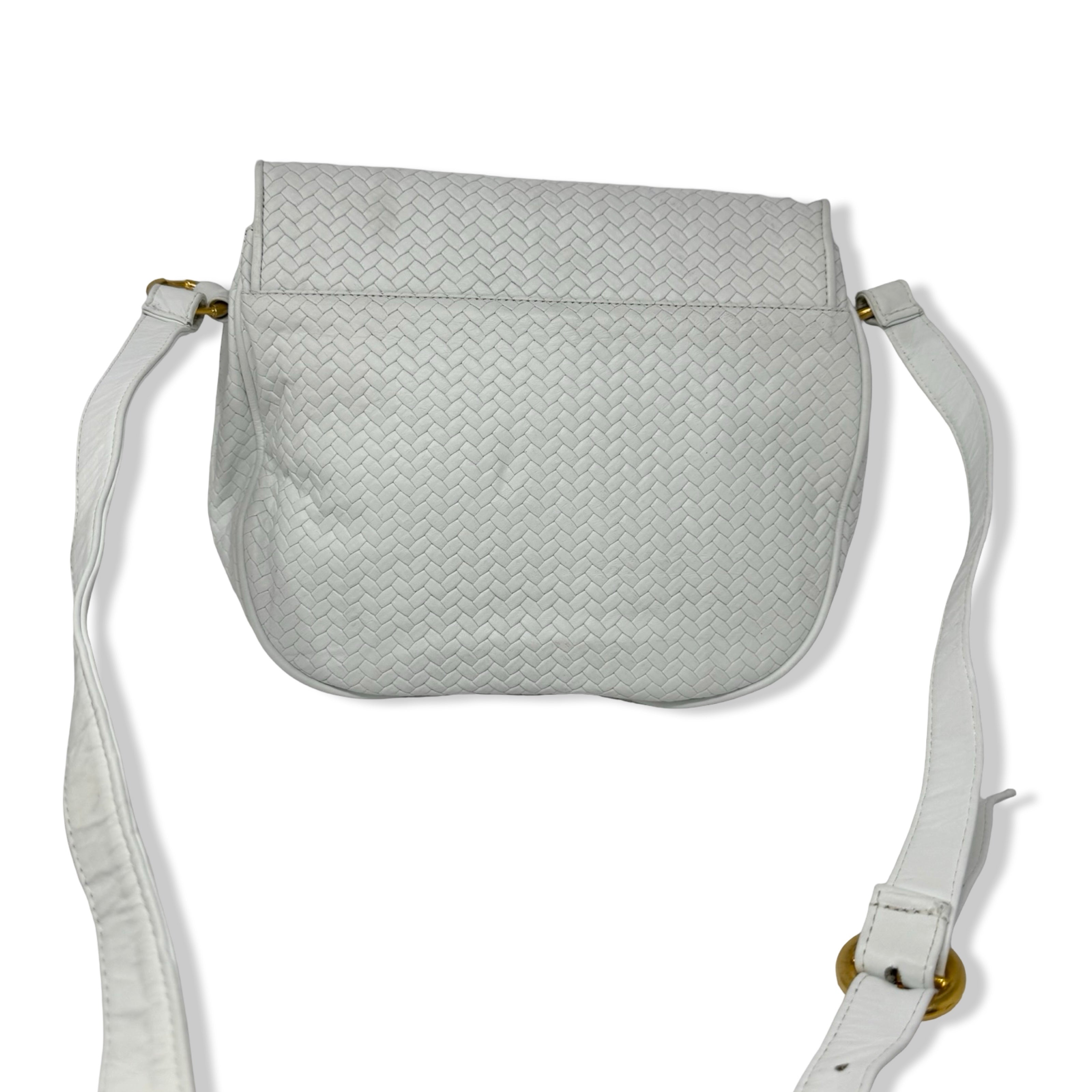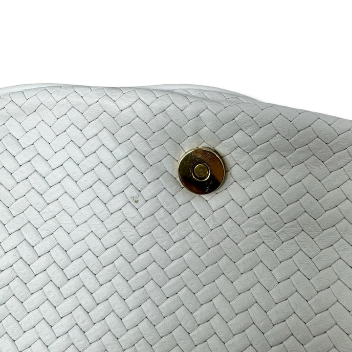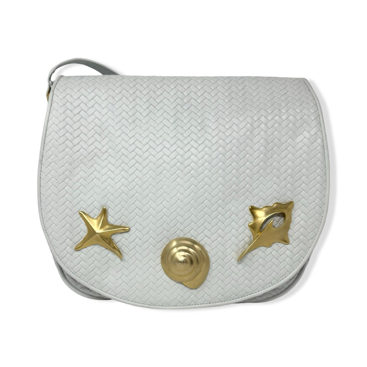 - Woven bag with seashell inspired hardware, crossbody strap, and snap closure. Signs of wear (pictured)