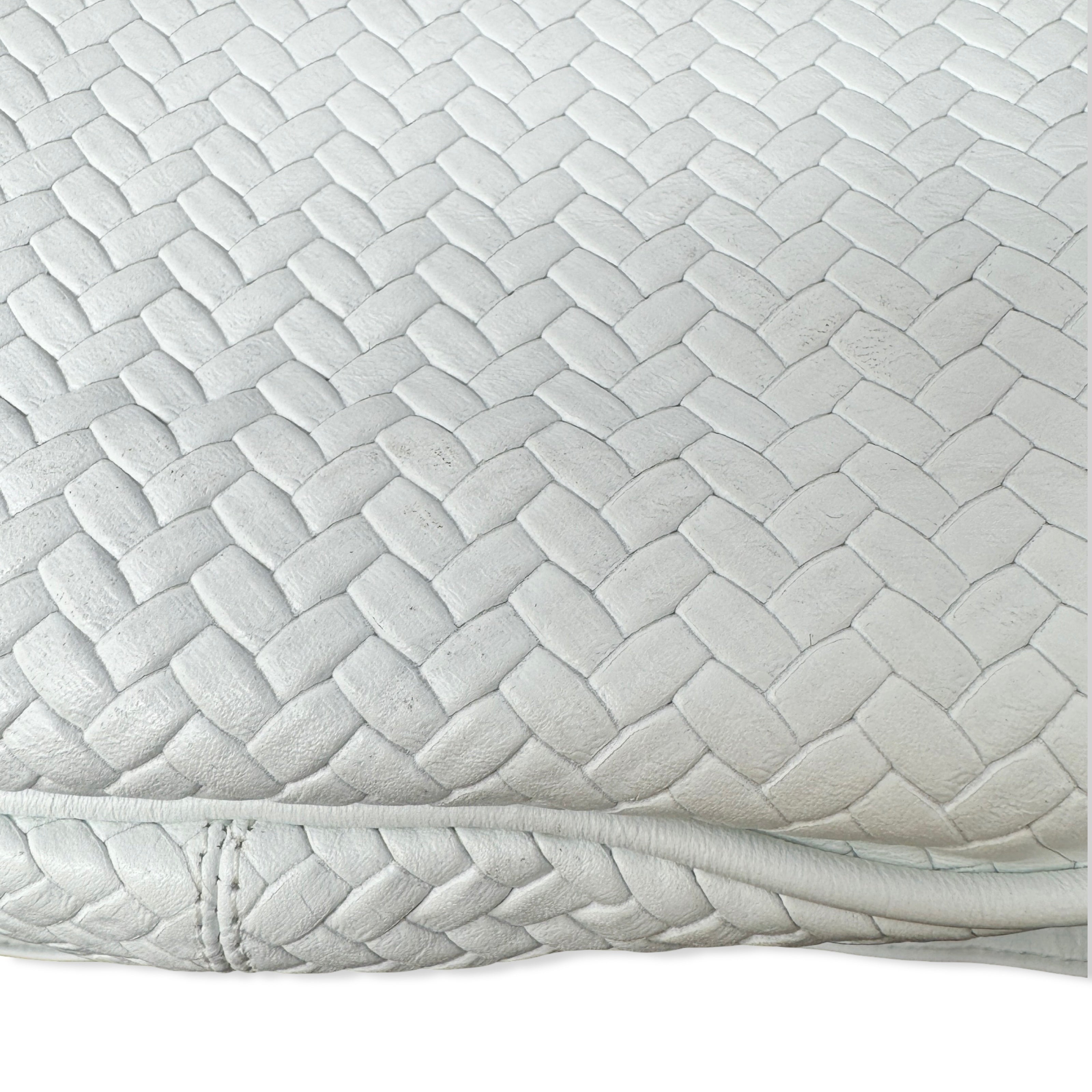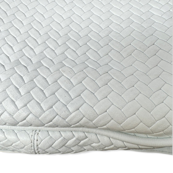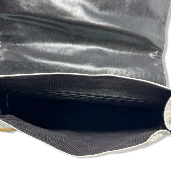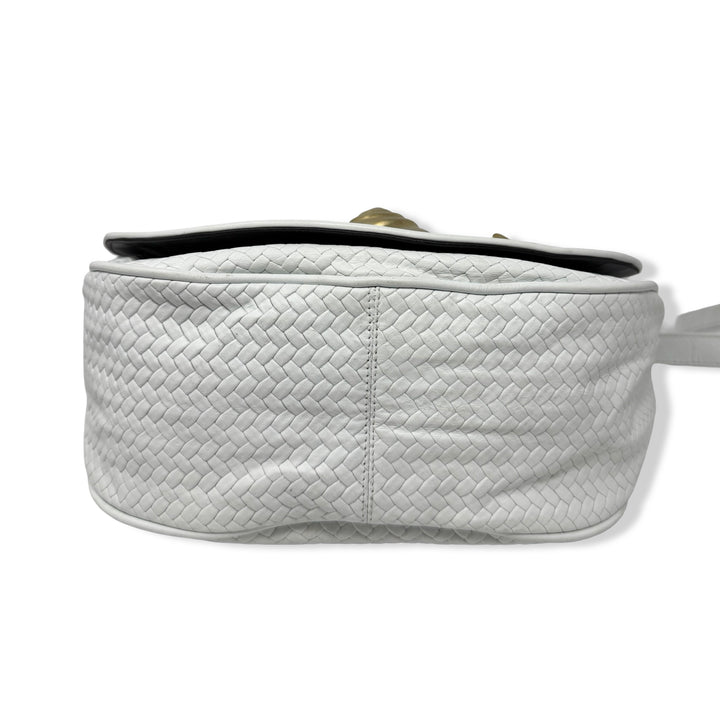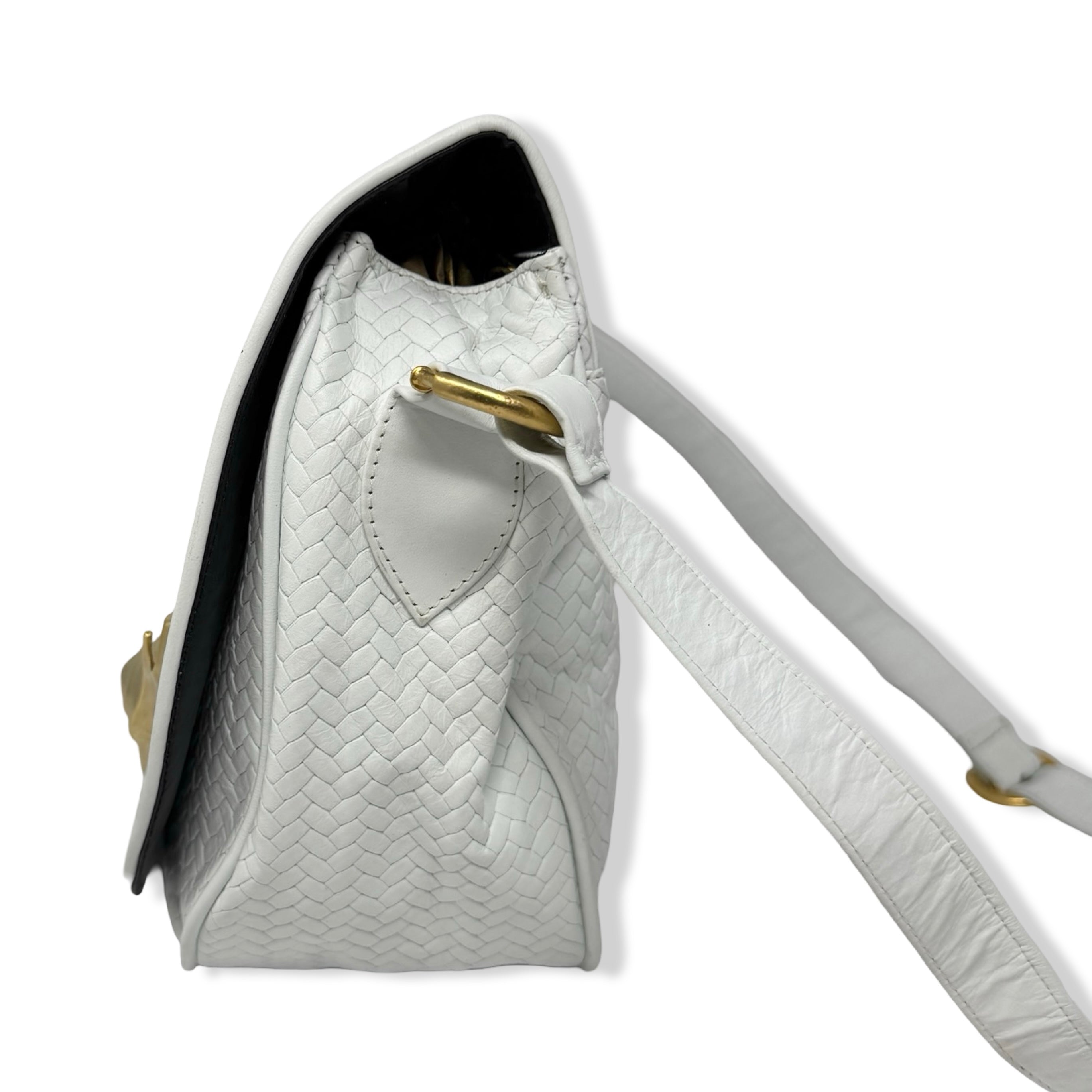 - Woven bag with seashell inspired hardware, crossbody strap, and snap closure. Signs of wear (pictured)