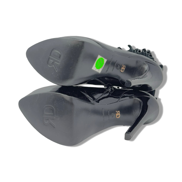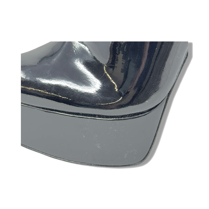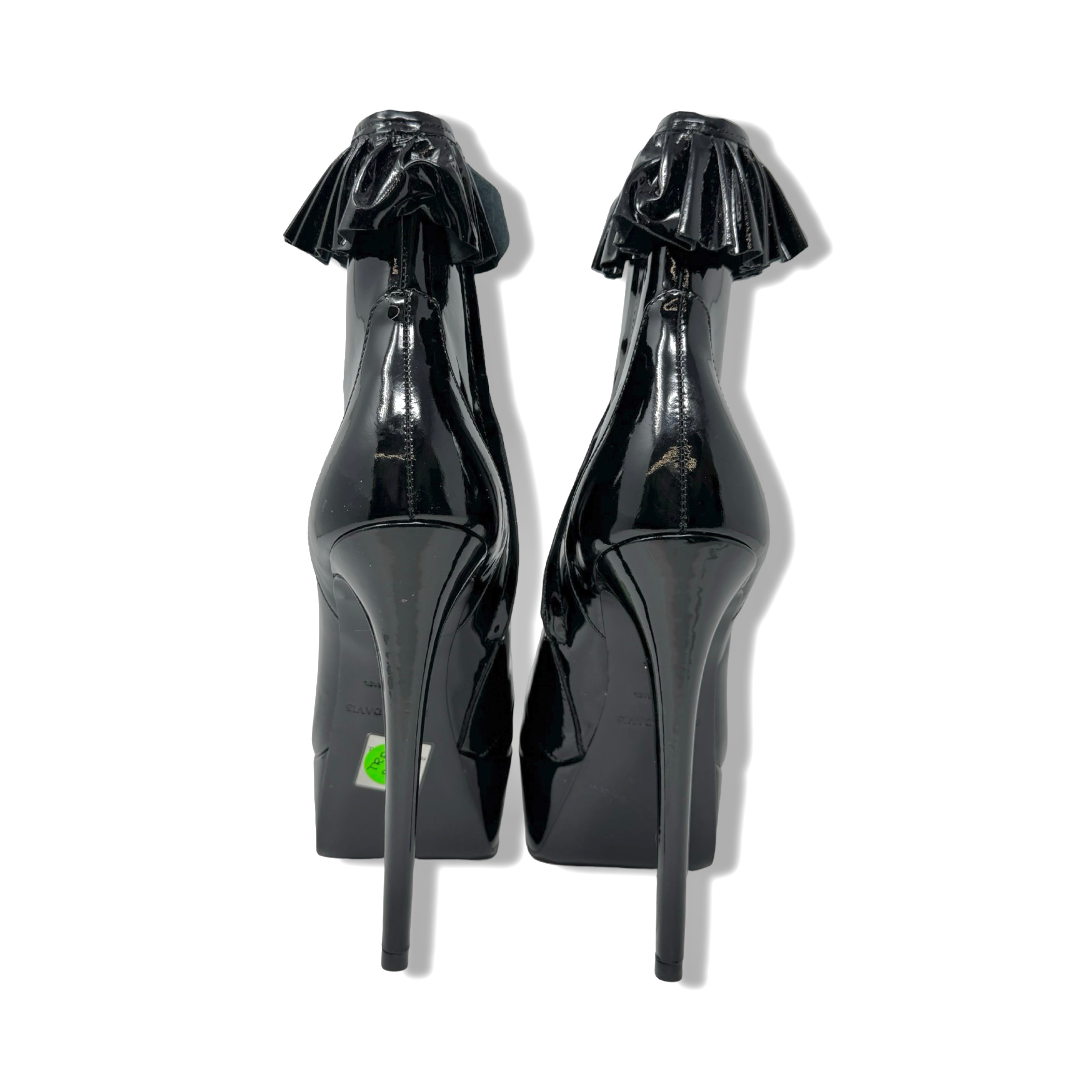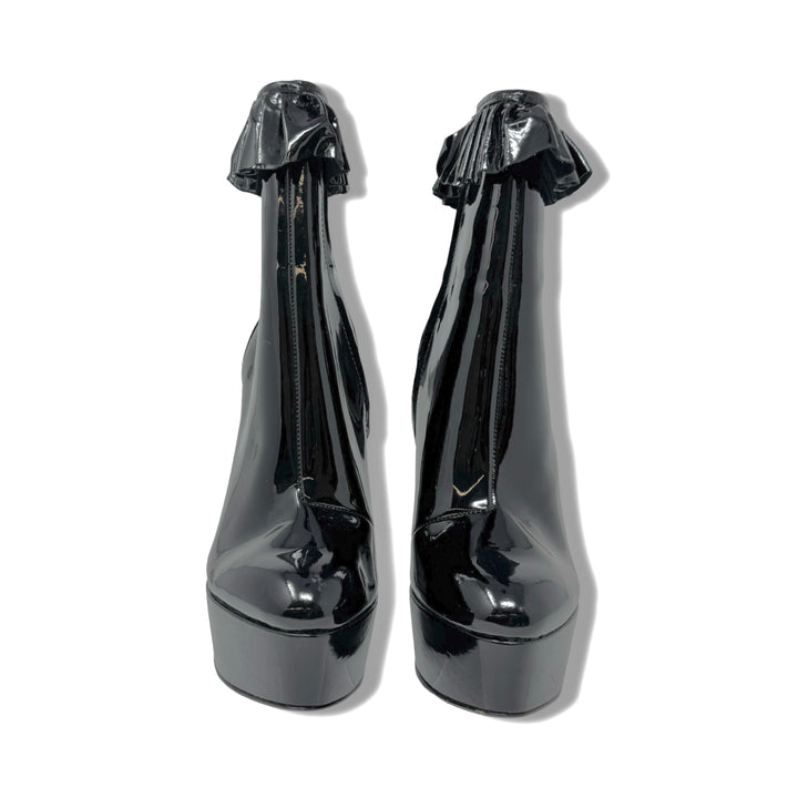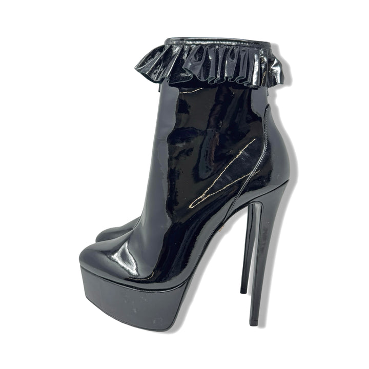 - Patent leather boots with side zip closure, ruffle trim, and stiletto heel.