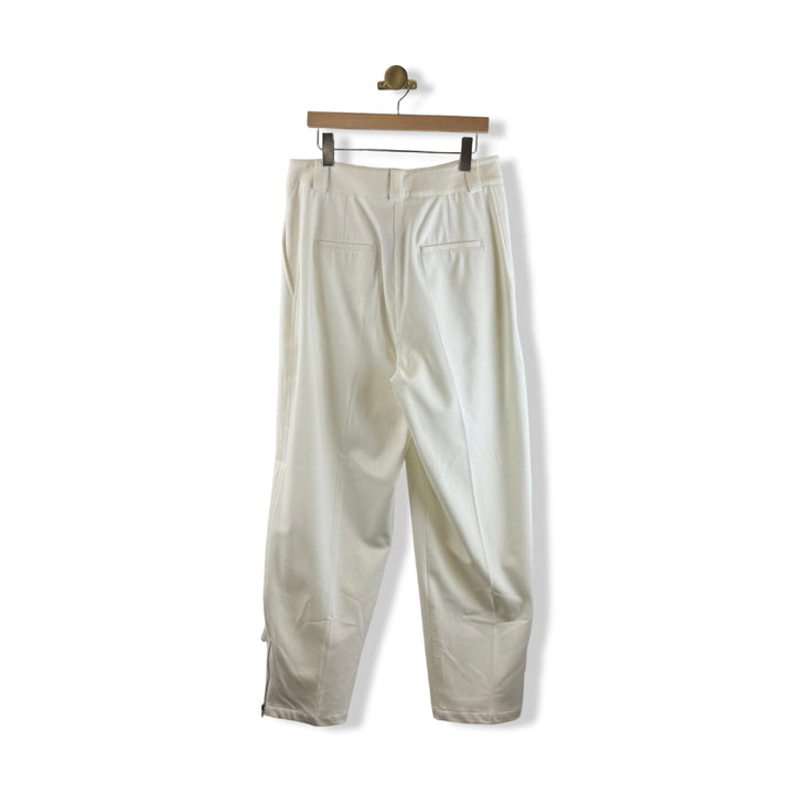 - Wide leg tapered pants with dual front pockets, faux back pockets, and hook and bar zip fly