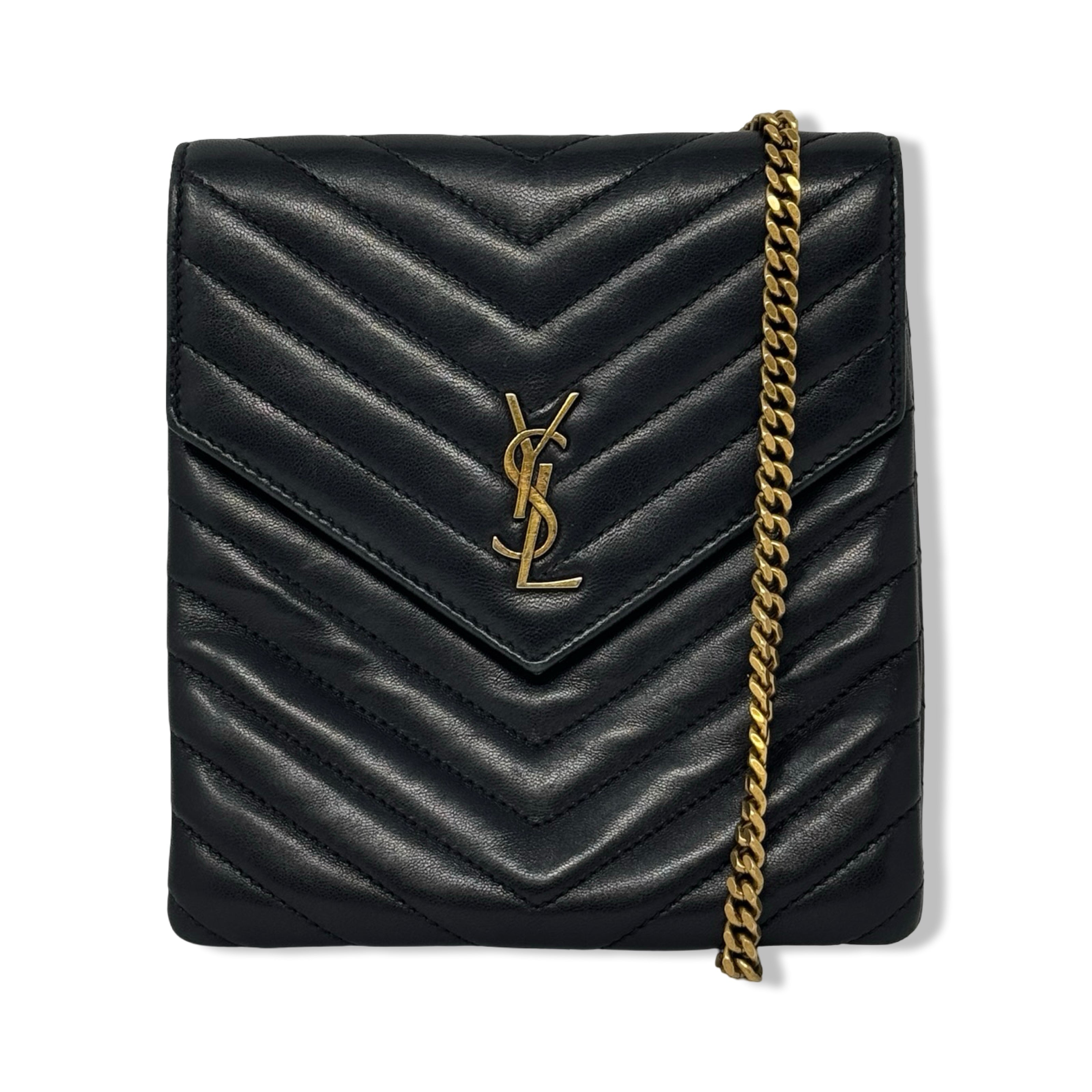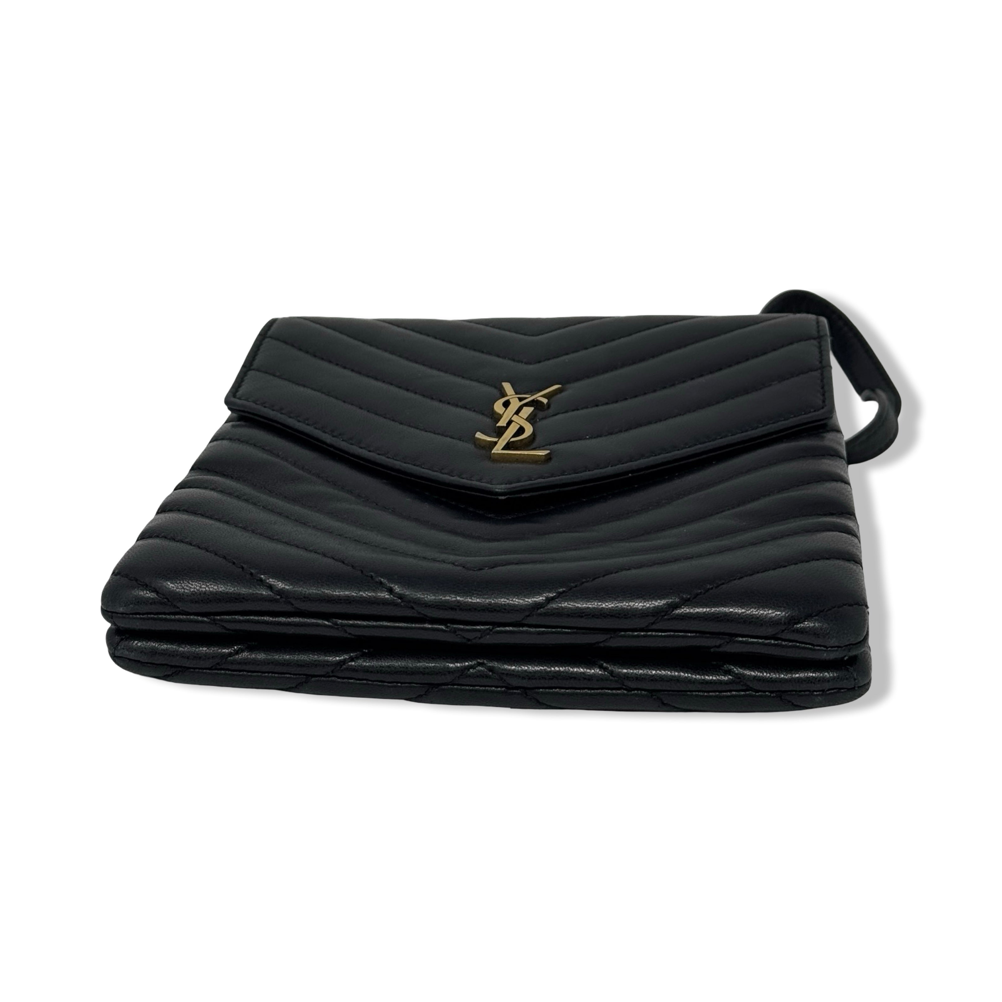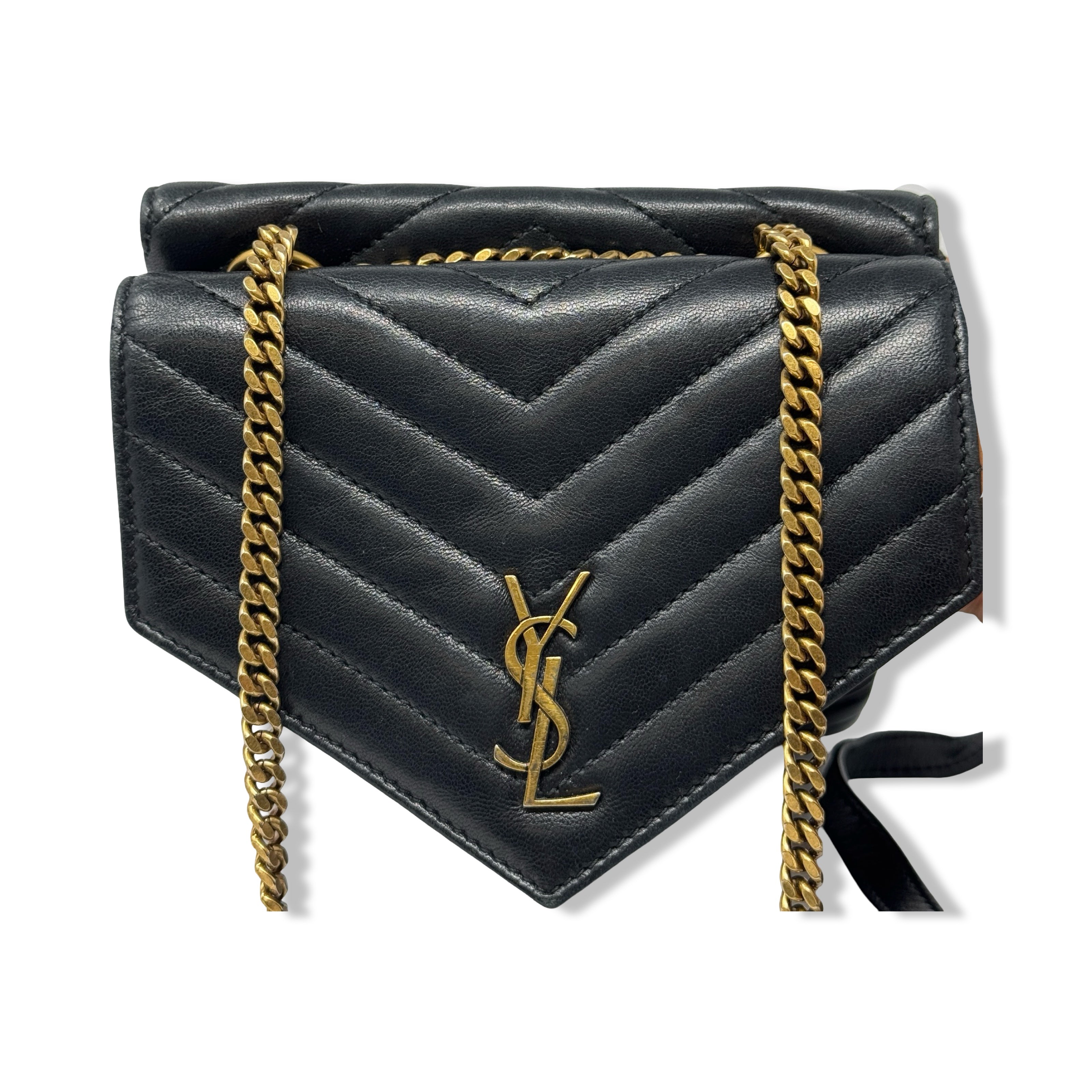 - Cross body bag with double chain sliding shoulder straps with leather shoulder padding, front compartment with interlocking YSL snap closure and one interior patch pocket, and rear compartment with snap closure and an open interior. Designer dust bag included. Some signs of wear (pictured)