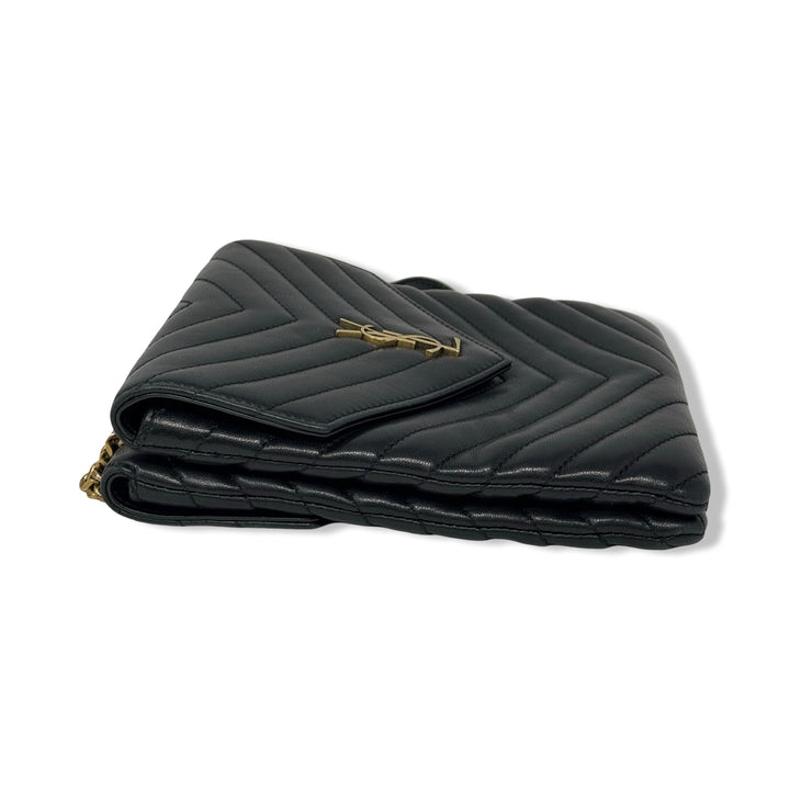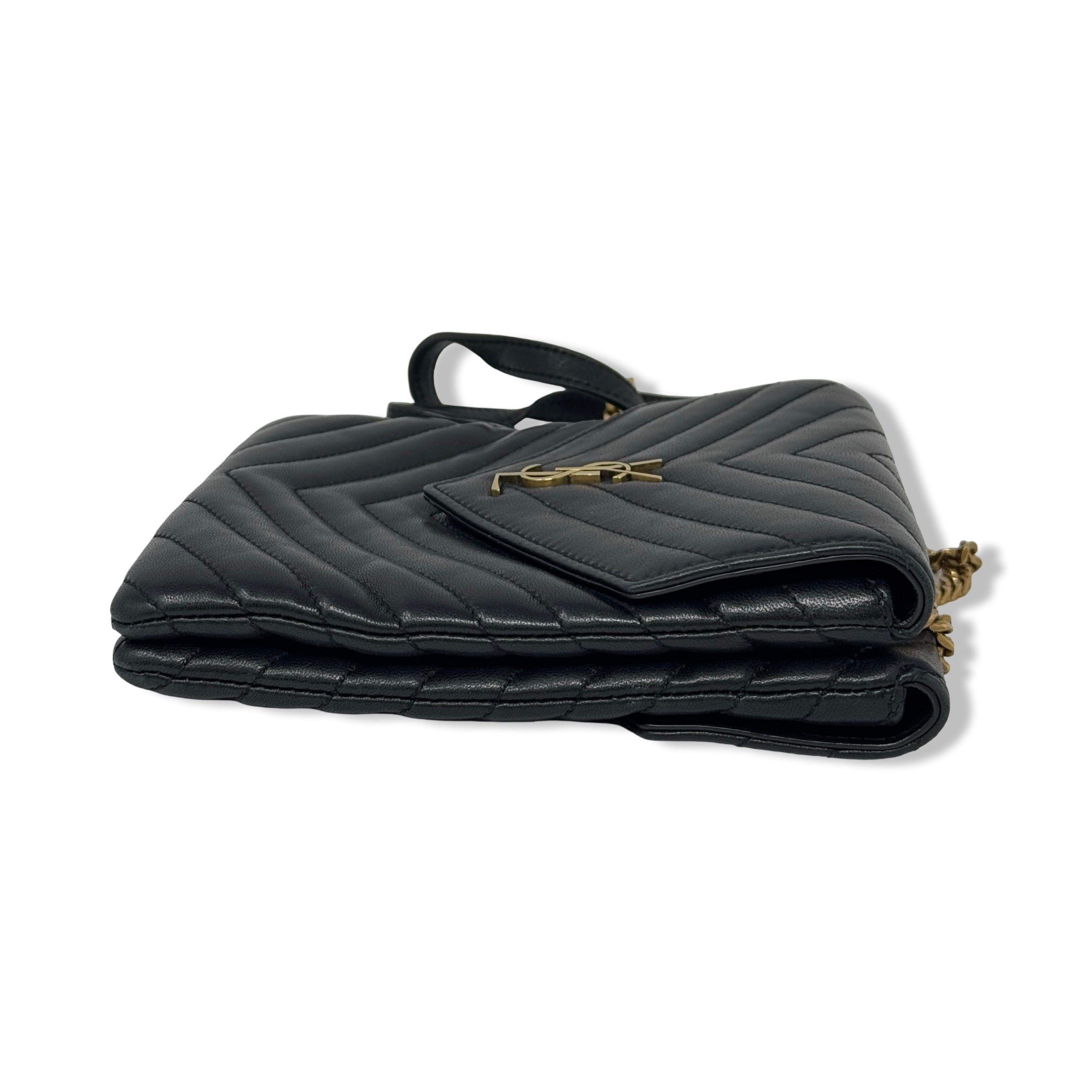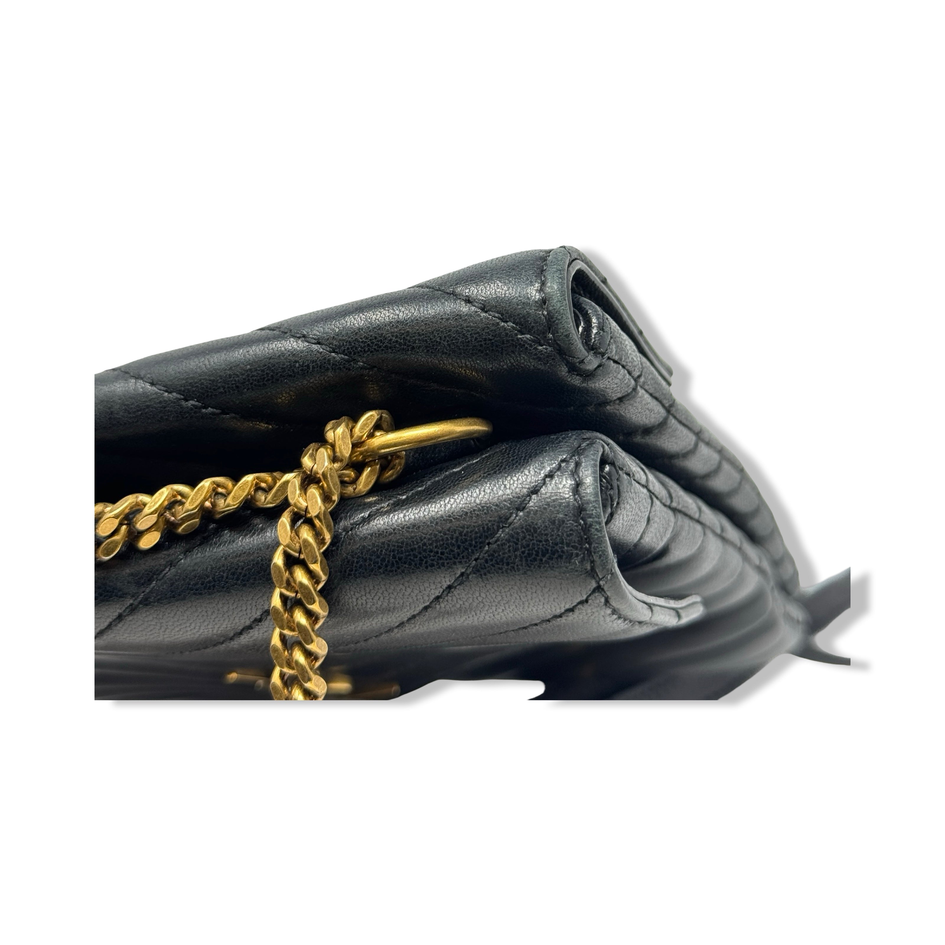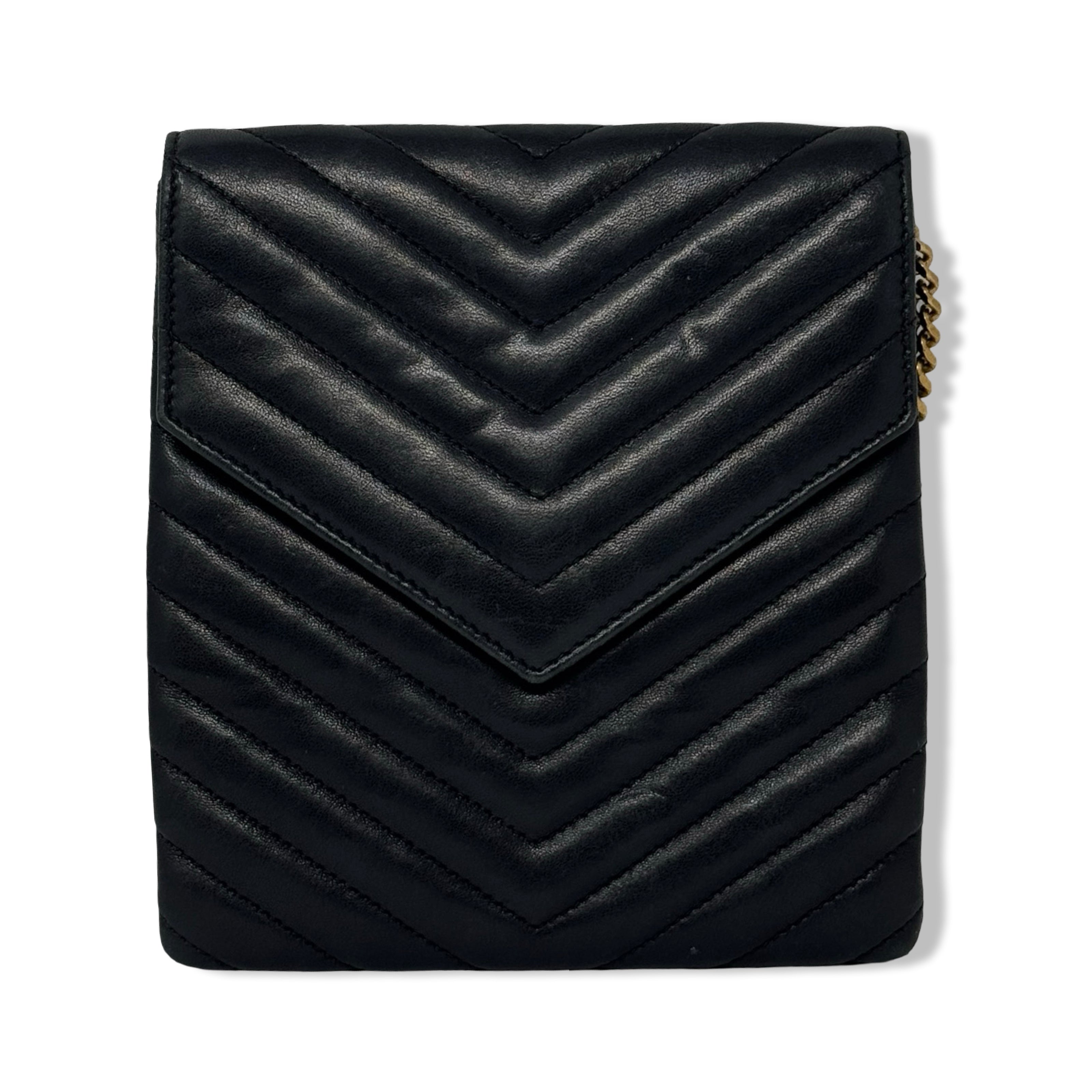 - Cross body bag with double chain sliding shoulder straps with leather shoulder padding, front compartment with interlocking YSL snap closure and one interior patch pocket, and rear compartment with snap closure and an open interior. Designer dust bag included. Some signs of wear (pictured)