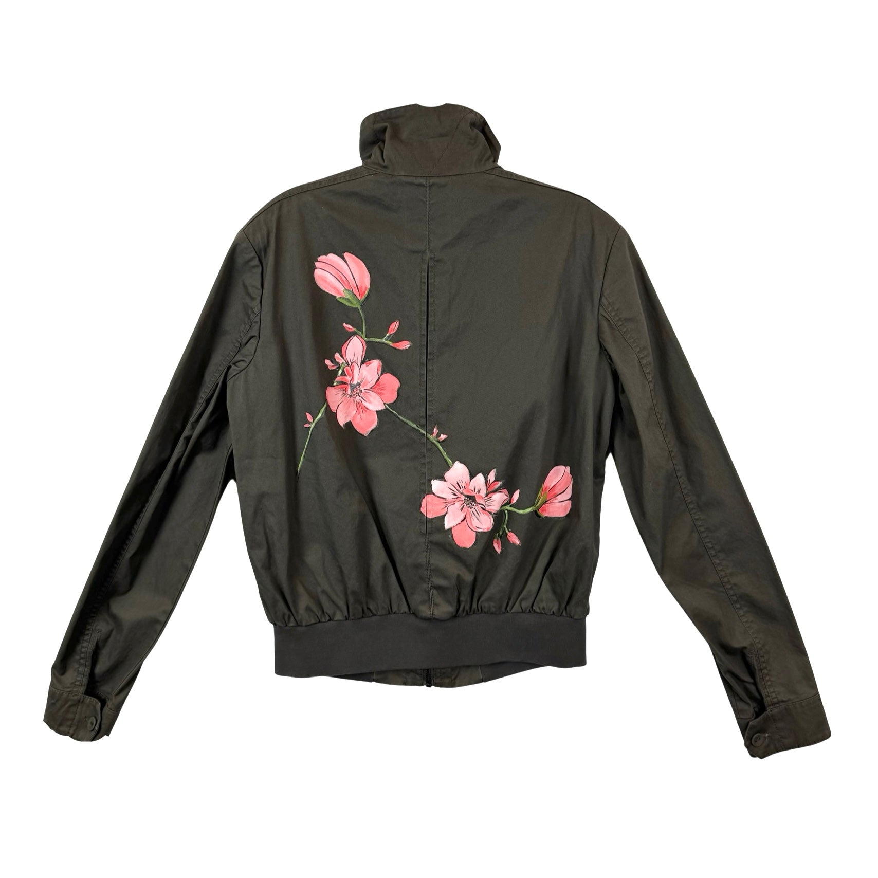 - Zip up jacket with front pockets, elastic hem and original hand-painted artwork on back
