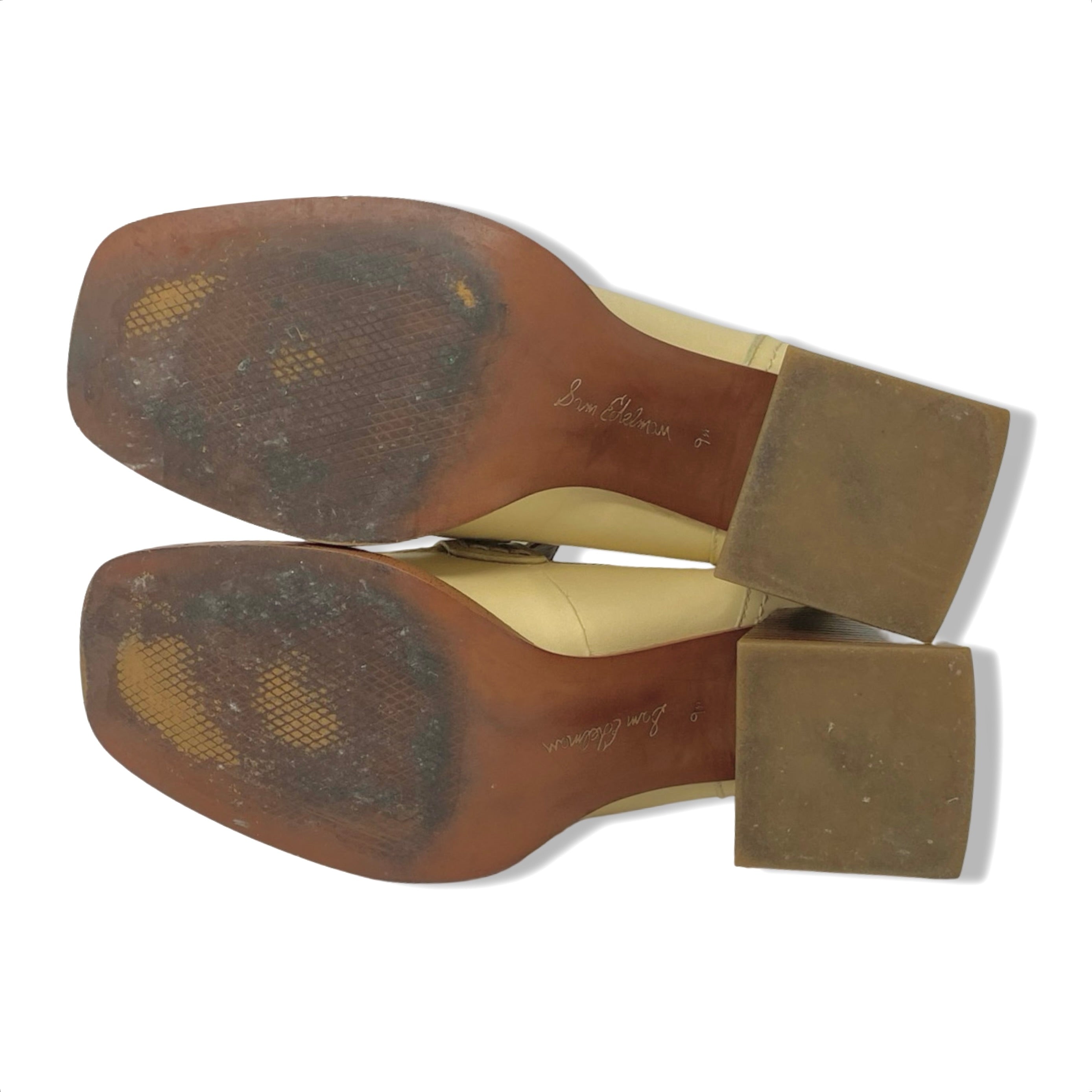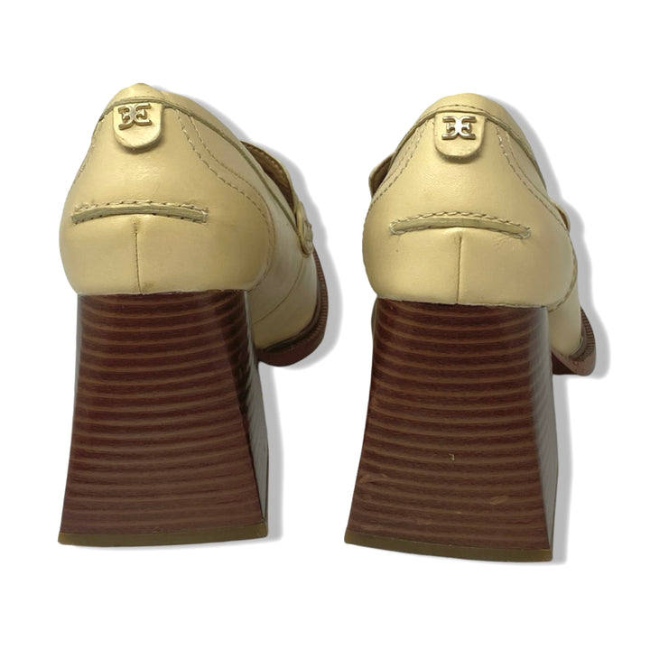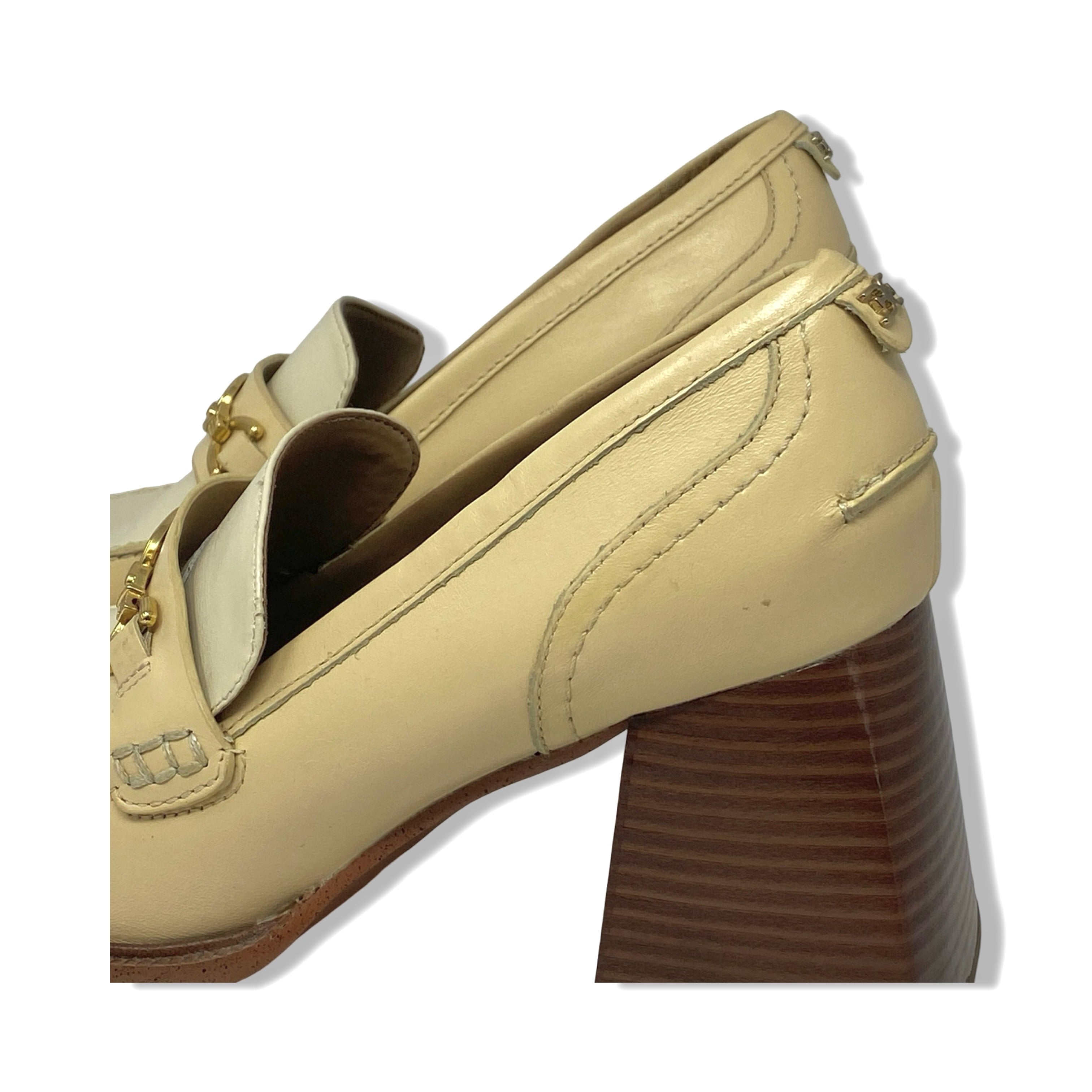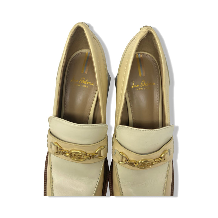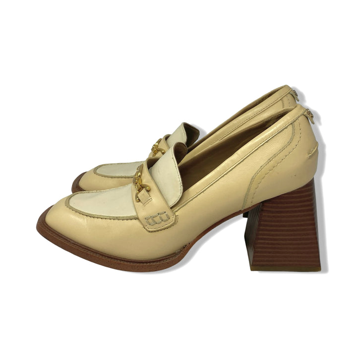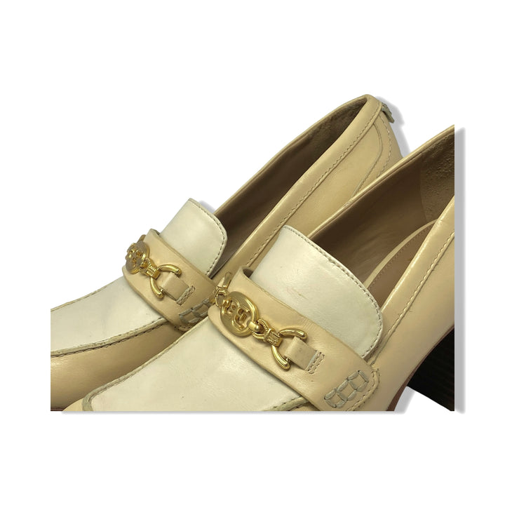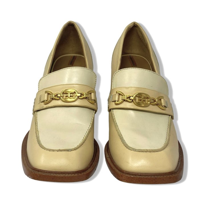 - Slip on heeled loafer with square toe, contrast stitching and gold hardware
