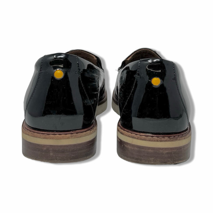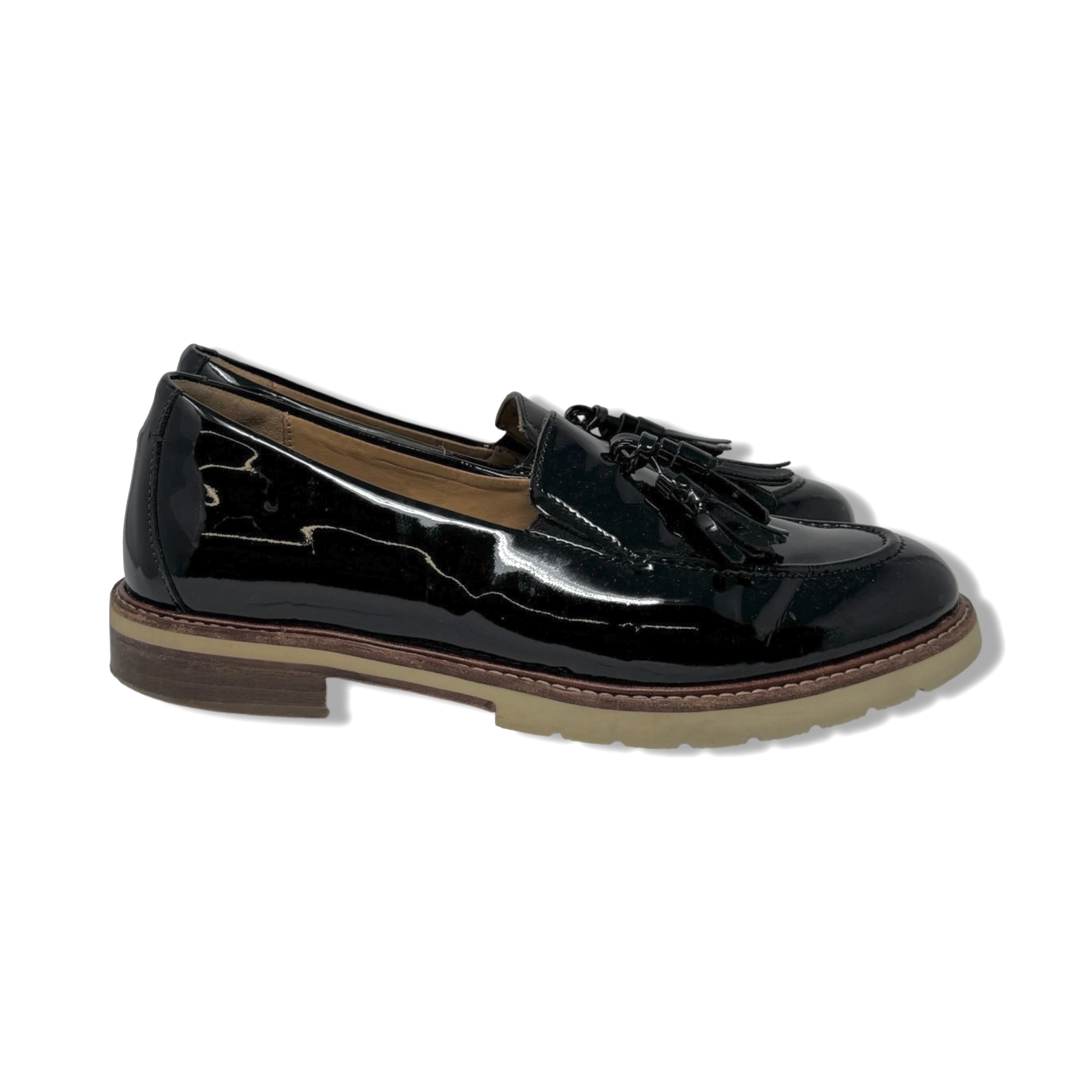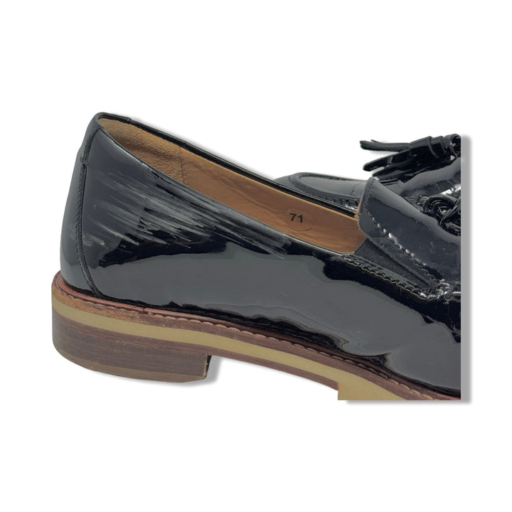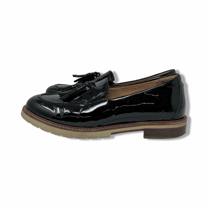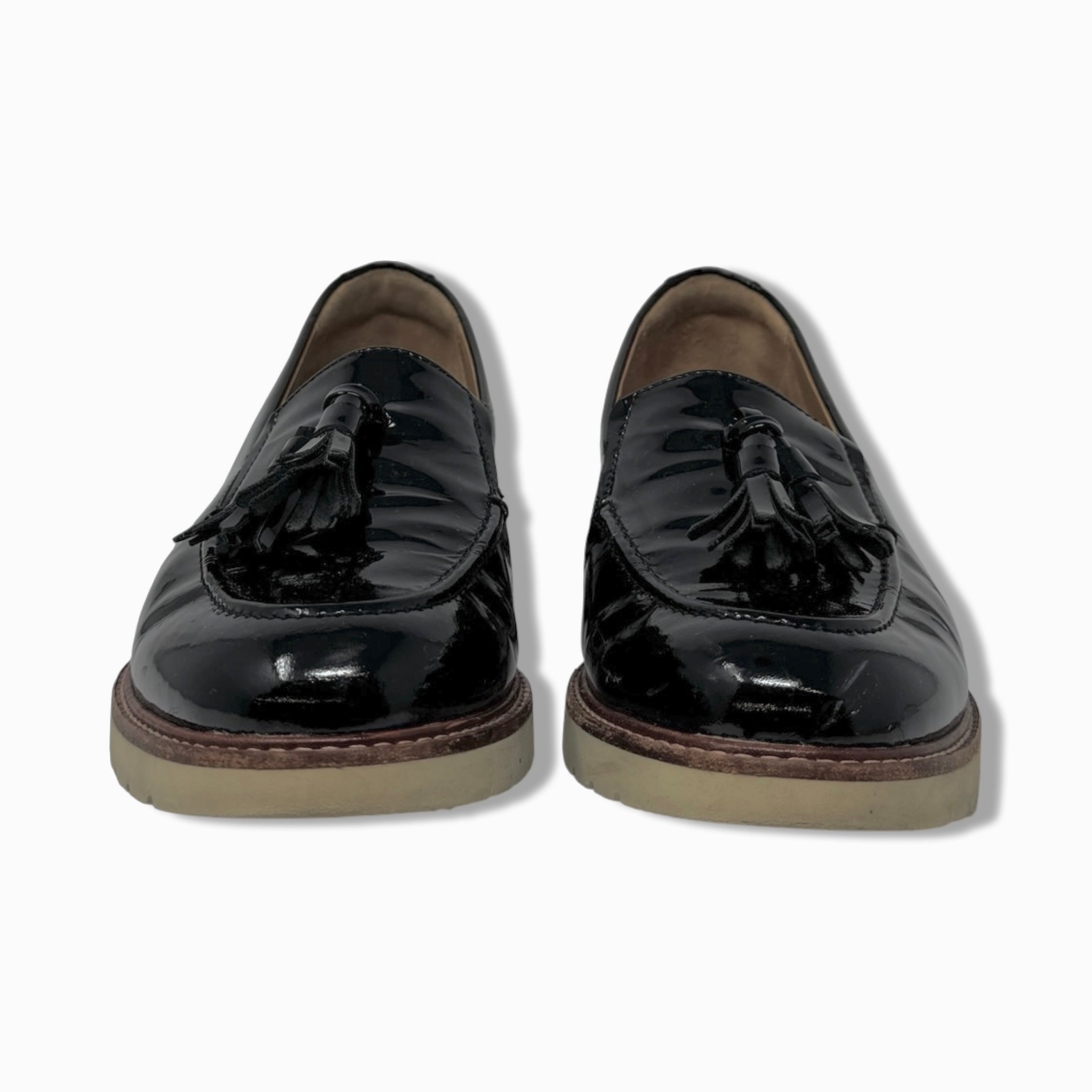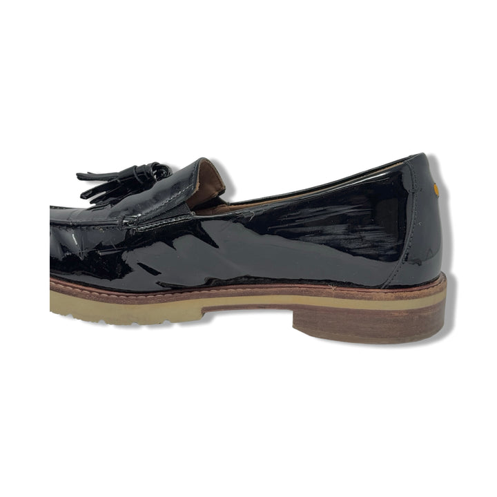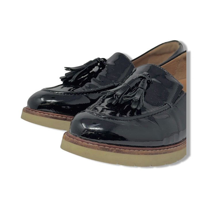 - Slip on loafers with almond toe, tassel detail and contrast stitching. Signs of wear.