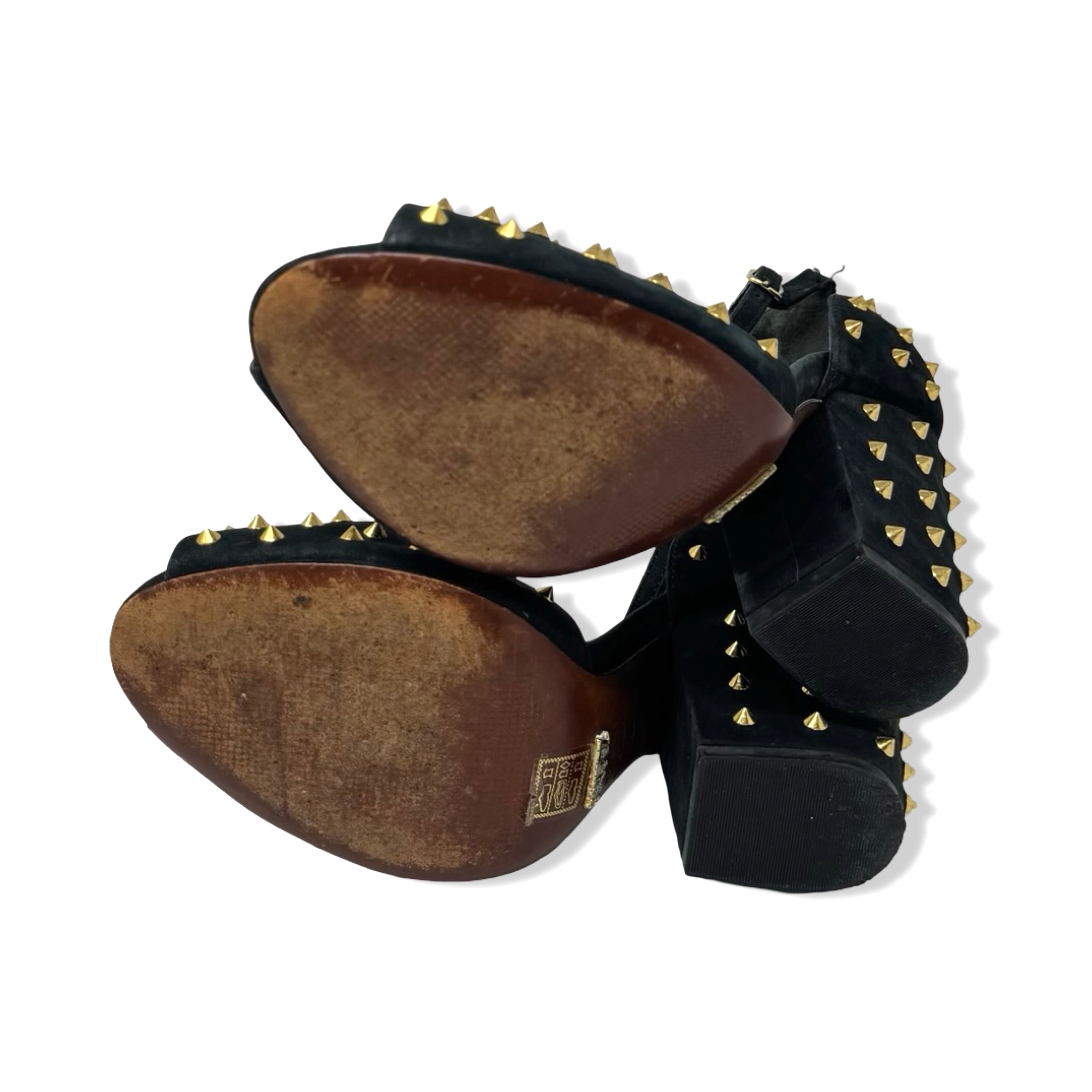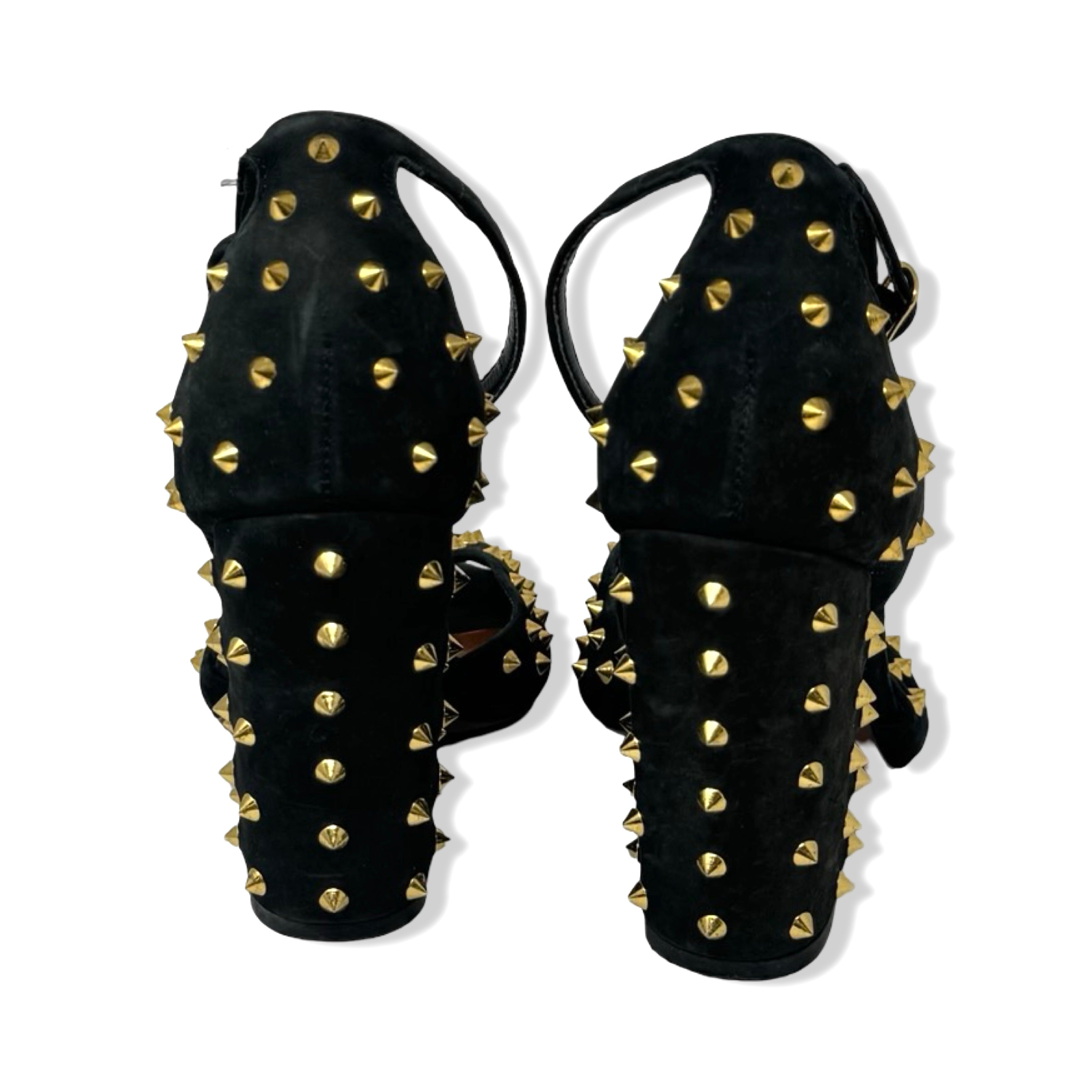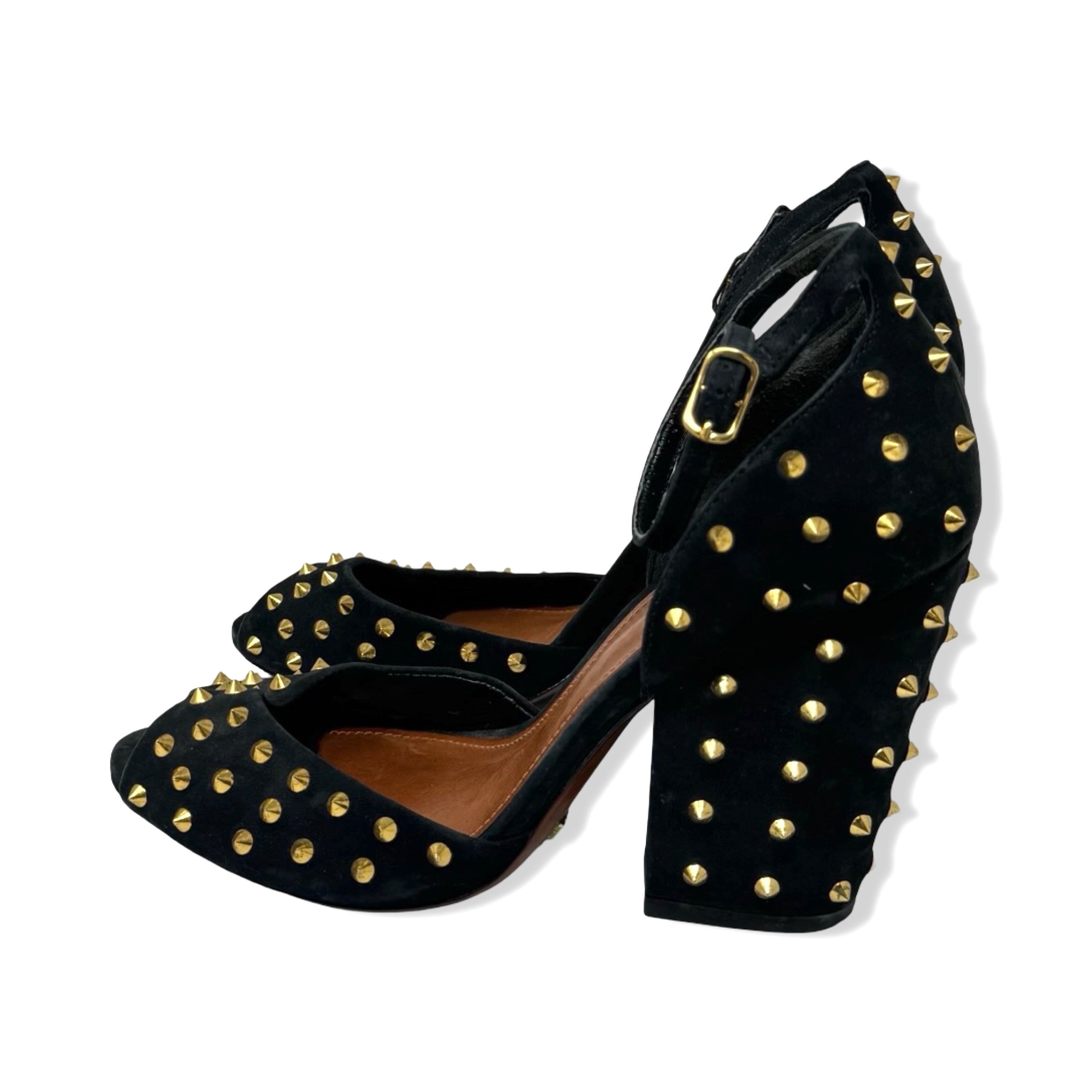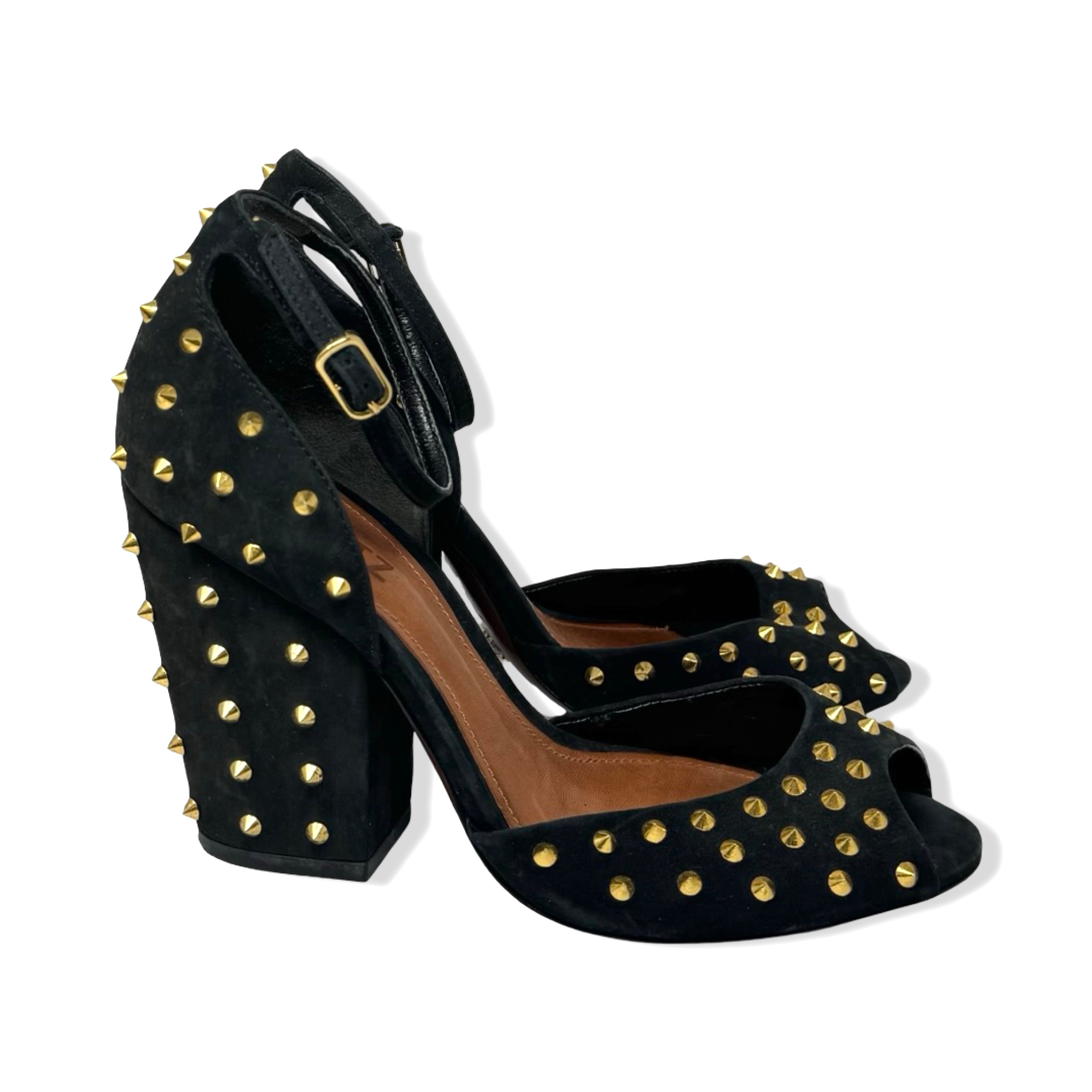 - These peep toe heels feature a striking spike embellishment throughout, adding a touch of edge to any outfit. The adjustable strap with buckle closure ensures a secure and comfortable fit, making these a must-have for any fashion-forward individual.