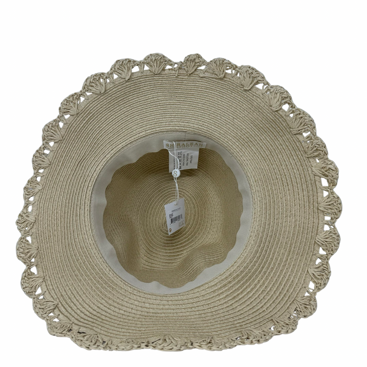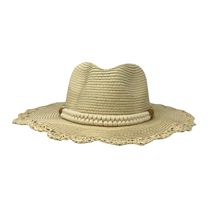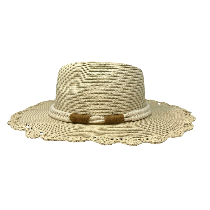 - Wide brimmed woven hat with braided cord detail and crochet edge