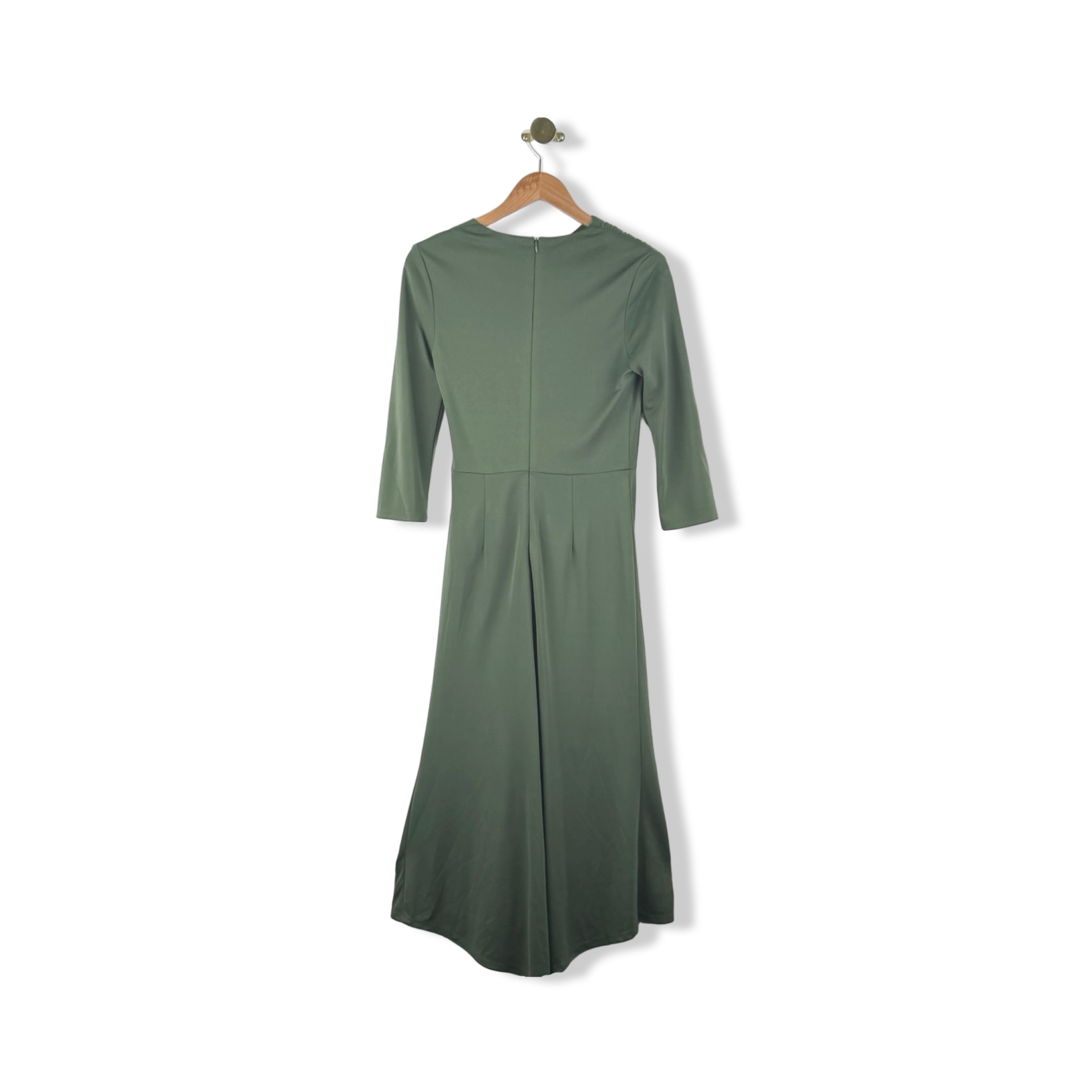- Half sleeve dress with asymmetrical neckline, ruching, and back zip closure