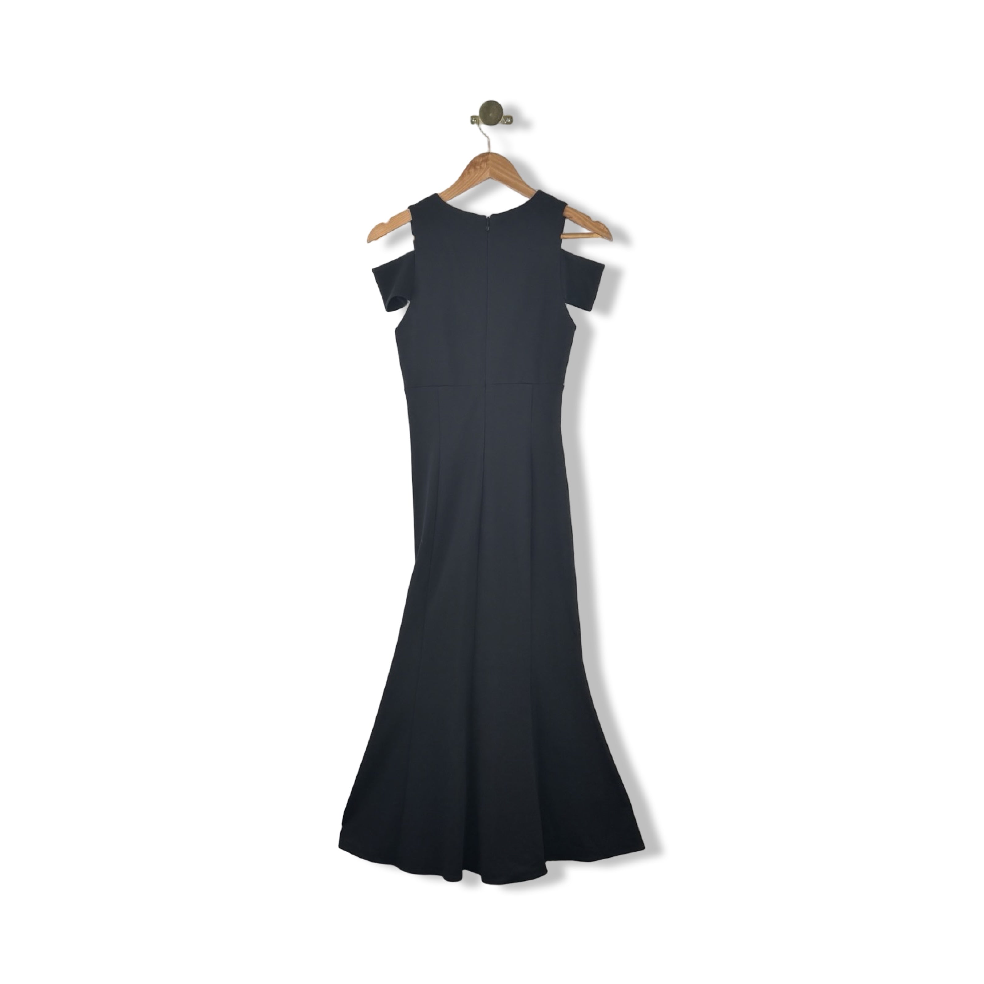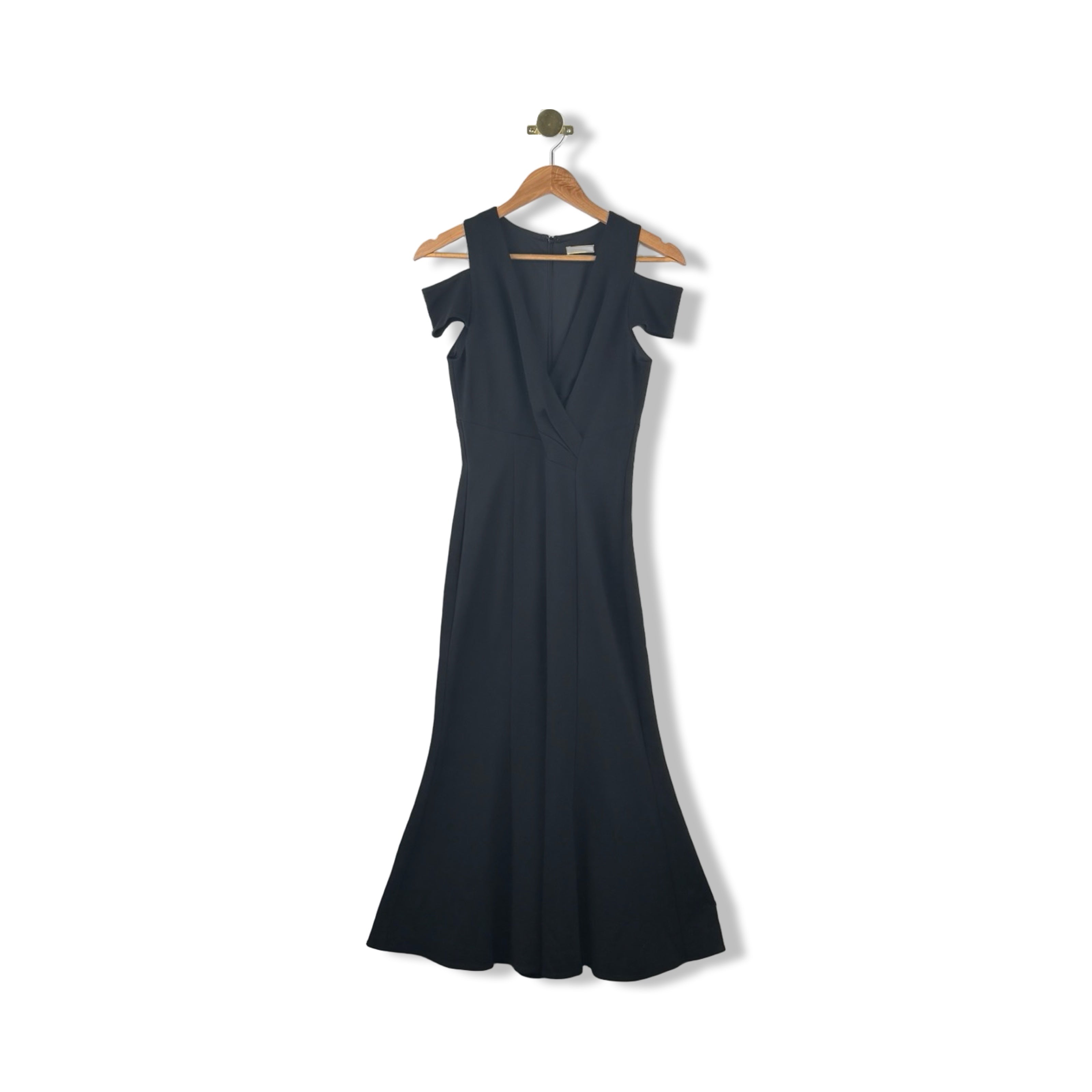 - Cold shoulder dress with plunge neck and back zip closure. Size label missing, looks like a Small
