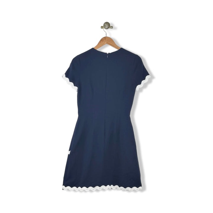 - Short sleeve mini dress with contrast trim and back zip closure. Size label missing, looks like a Medium