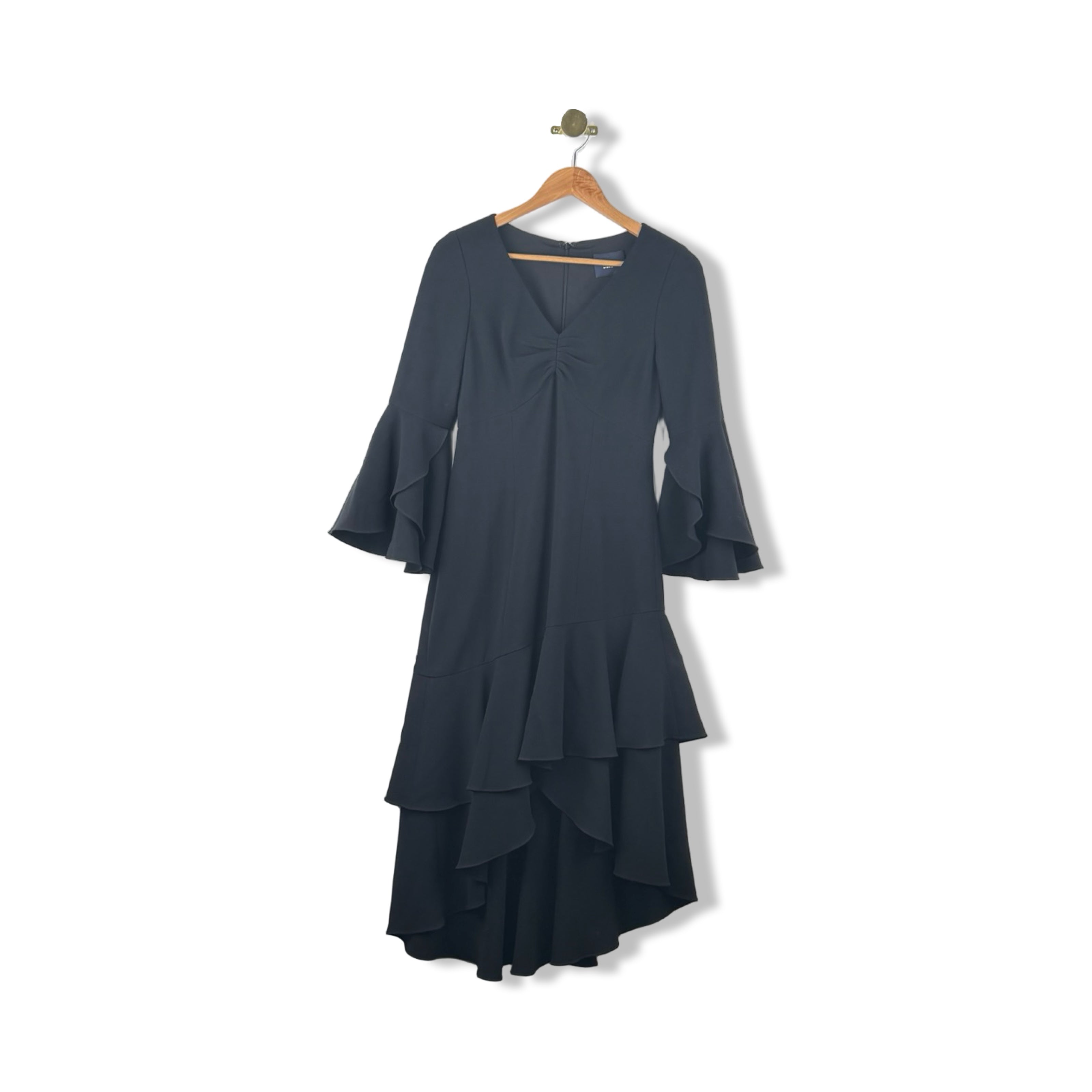 - Plunge neck maxi dress with long flare sleeves, layered ruffle hem, and back zip closure. Size label missing, looks like a Small