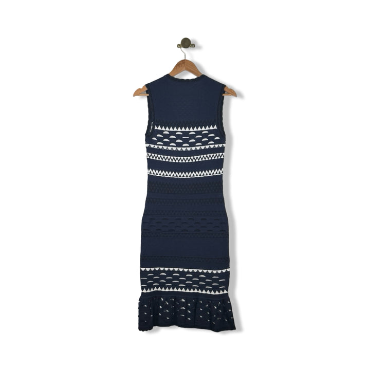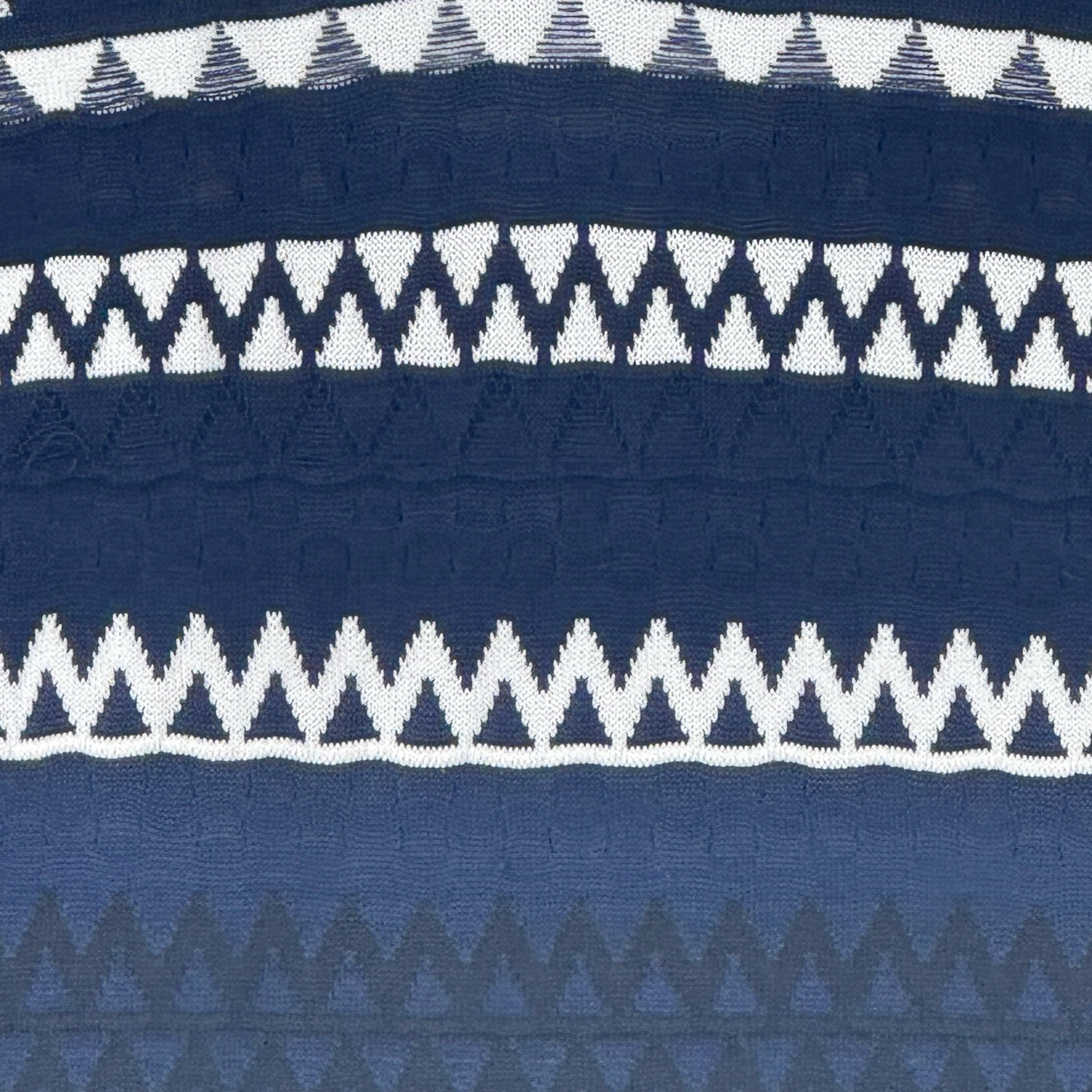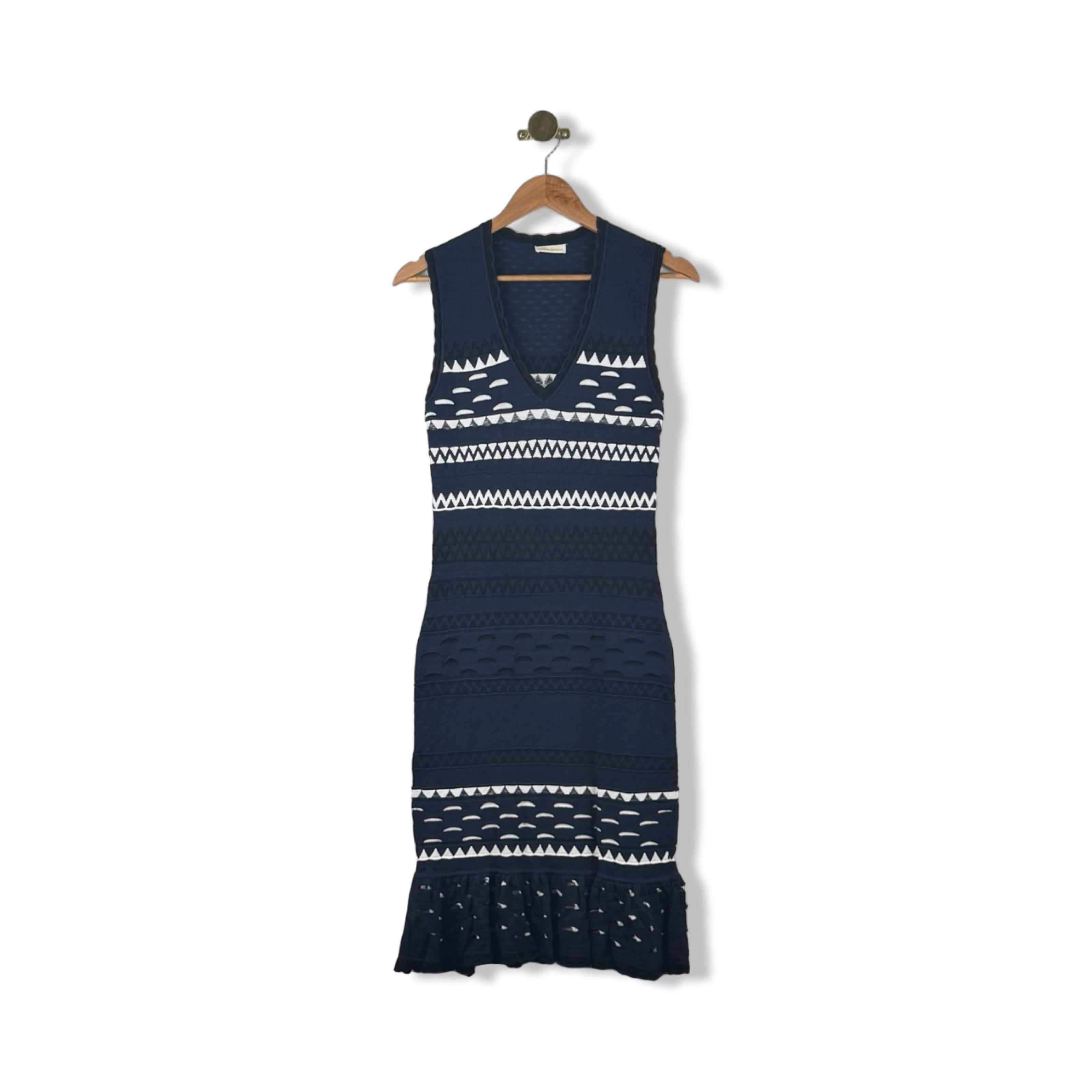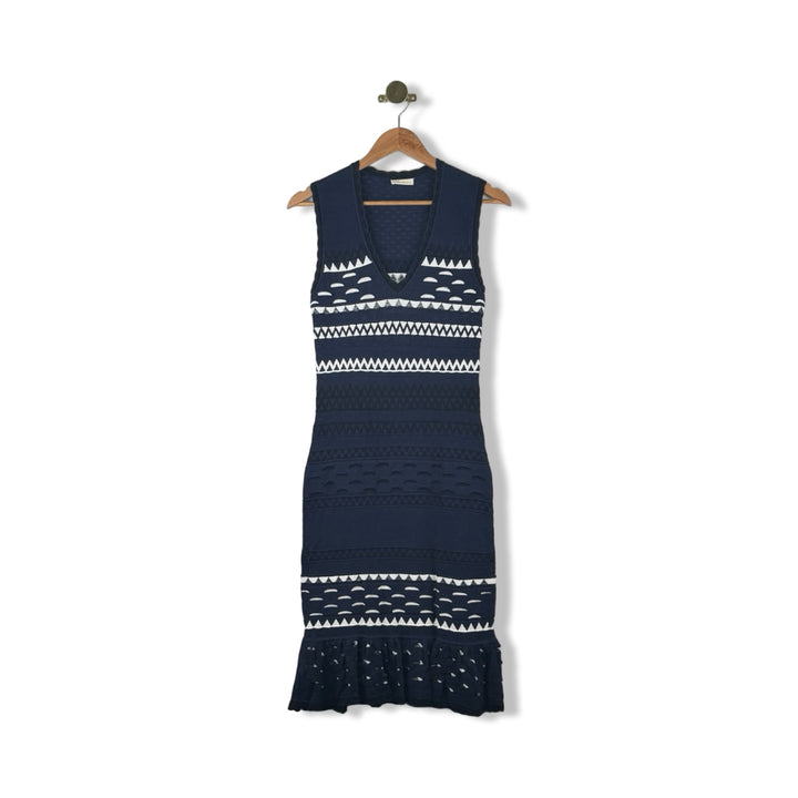 - Patterned pull on knit maxi dress. Size label missing, looks like Polyester blend