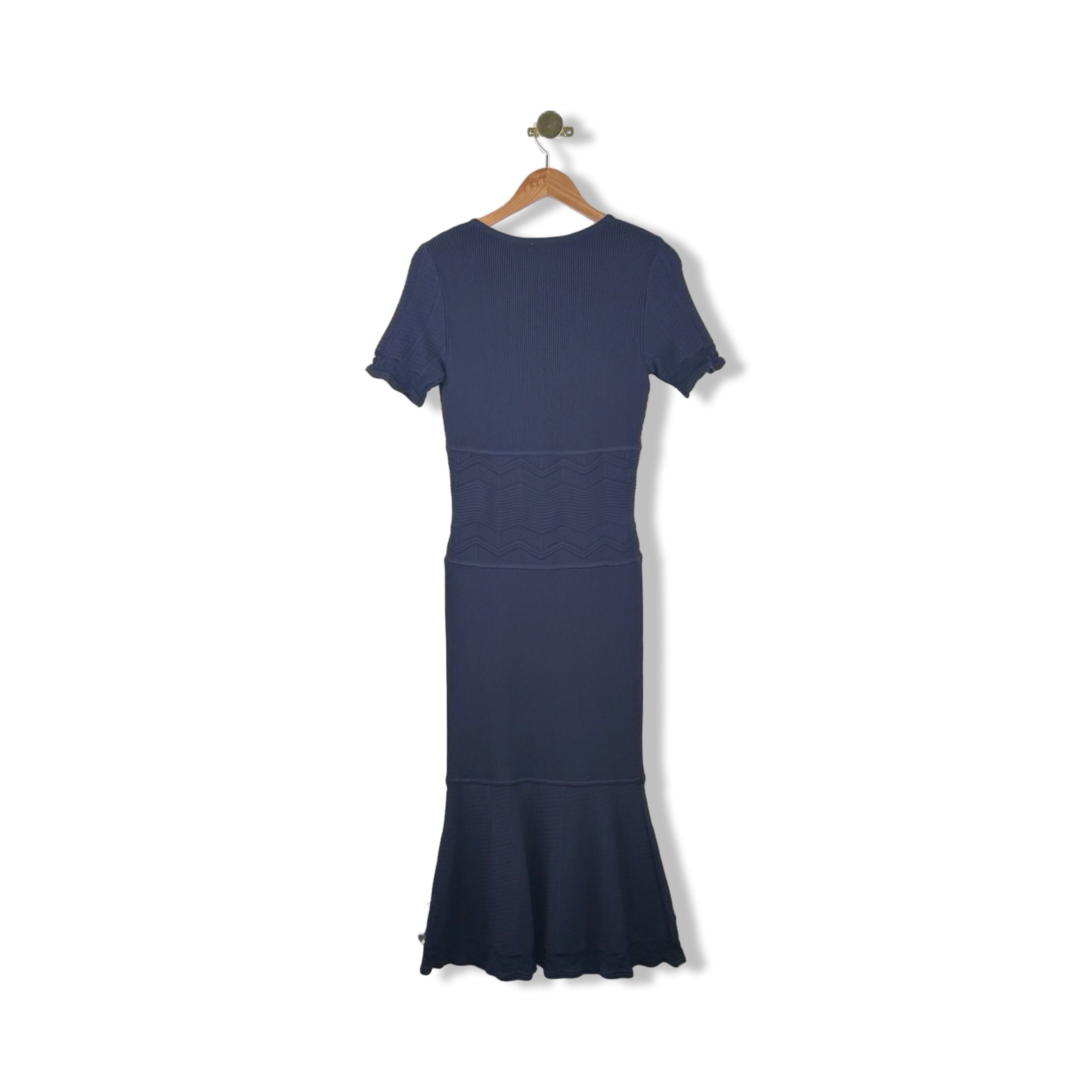 - Pull on short sleeve maxi dress with textured patterning on sleeves, waist, and hem