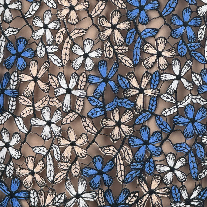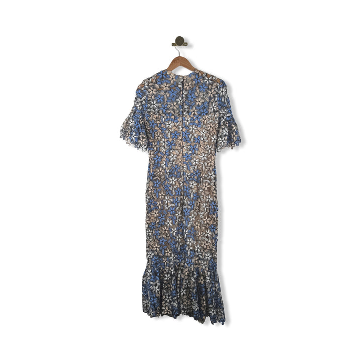 - Short sleeve maxi dress with floral lace layer and back zip closure