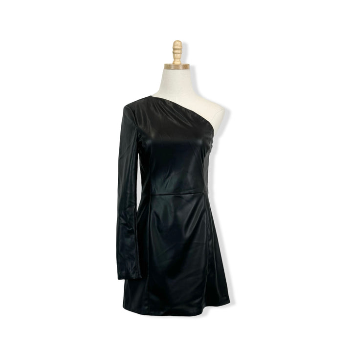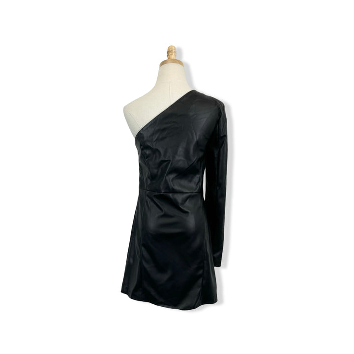 - Asymmetrical, one sleeve, faux leather, mini dress