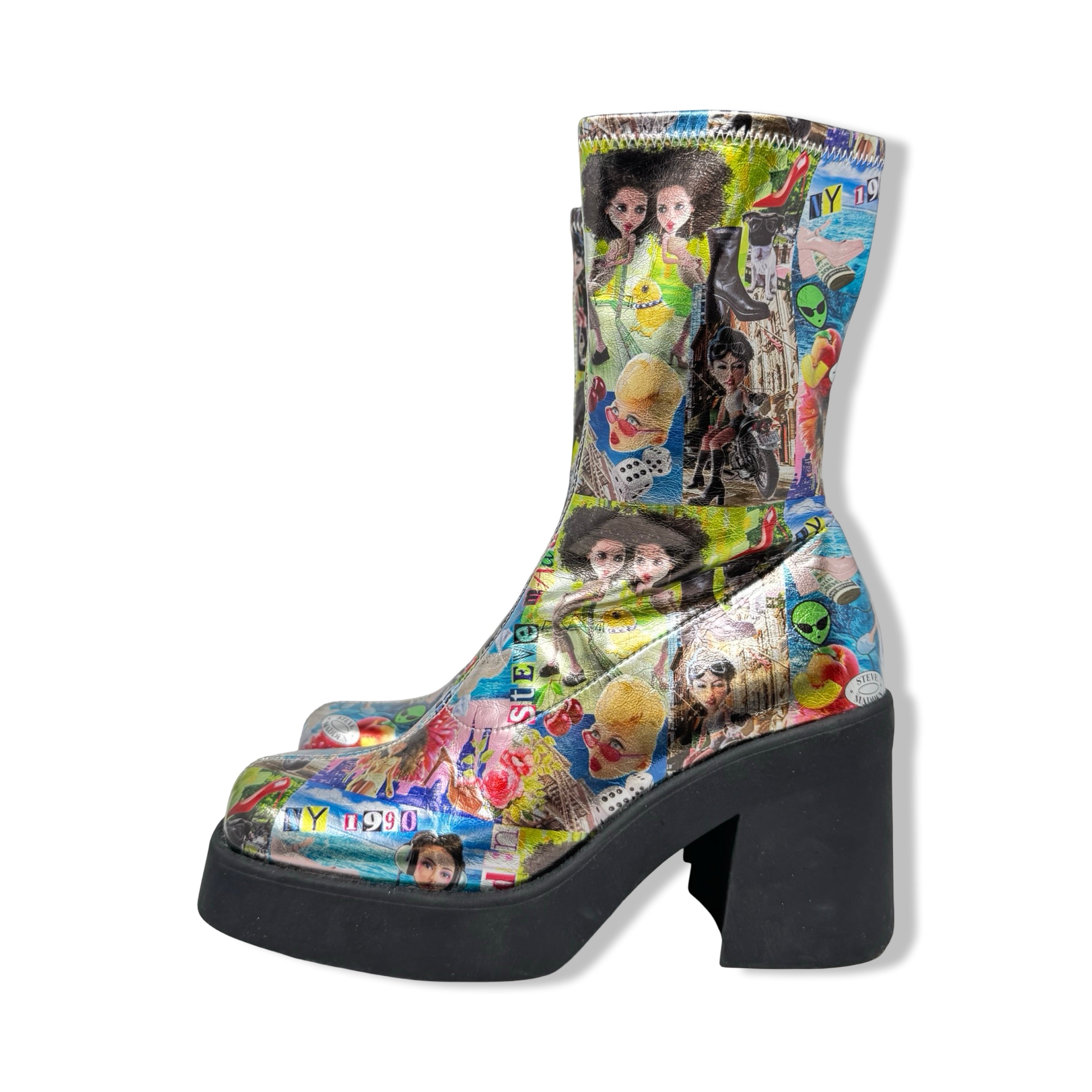- Slip on platform boots with square toe, side zip closure and comic brand inspired pattern throughout.