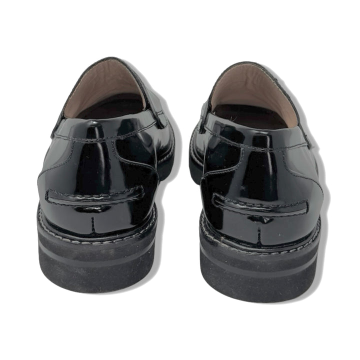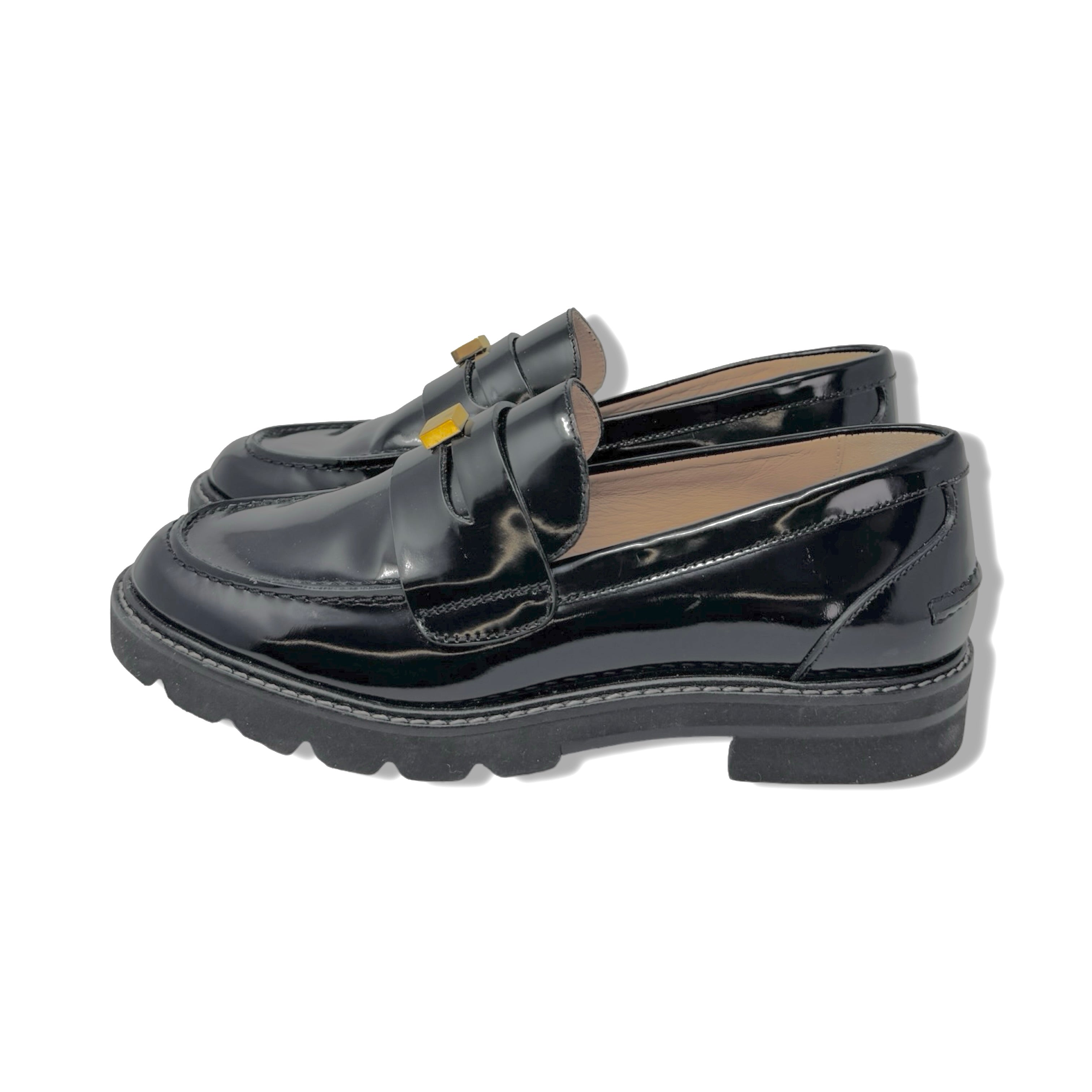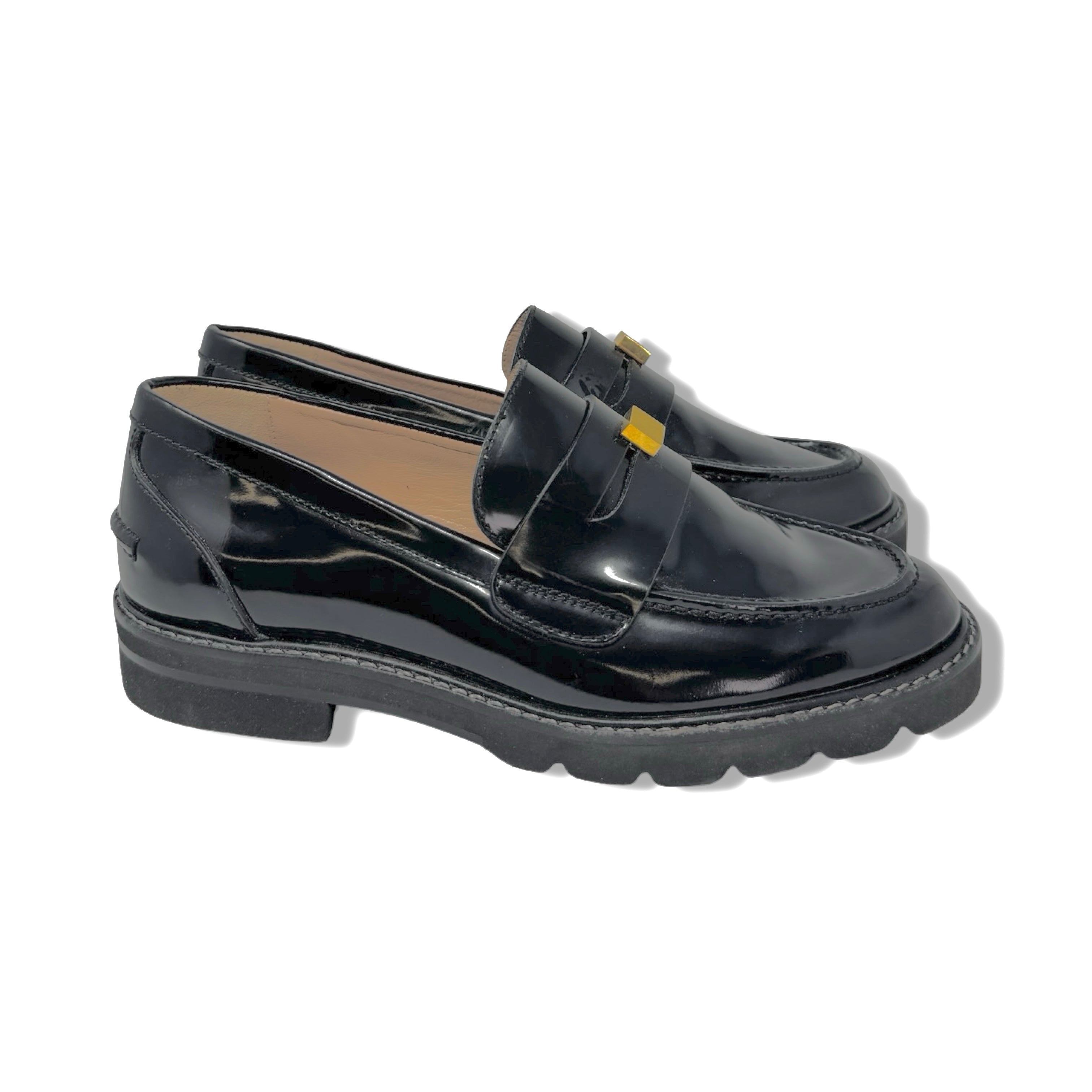- Slip on patent leather loafer with gold hardware and contrast stitching.
