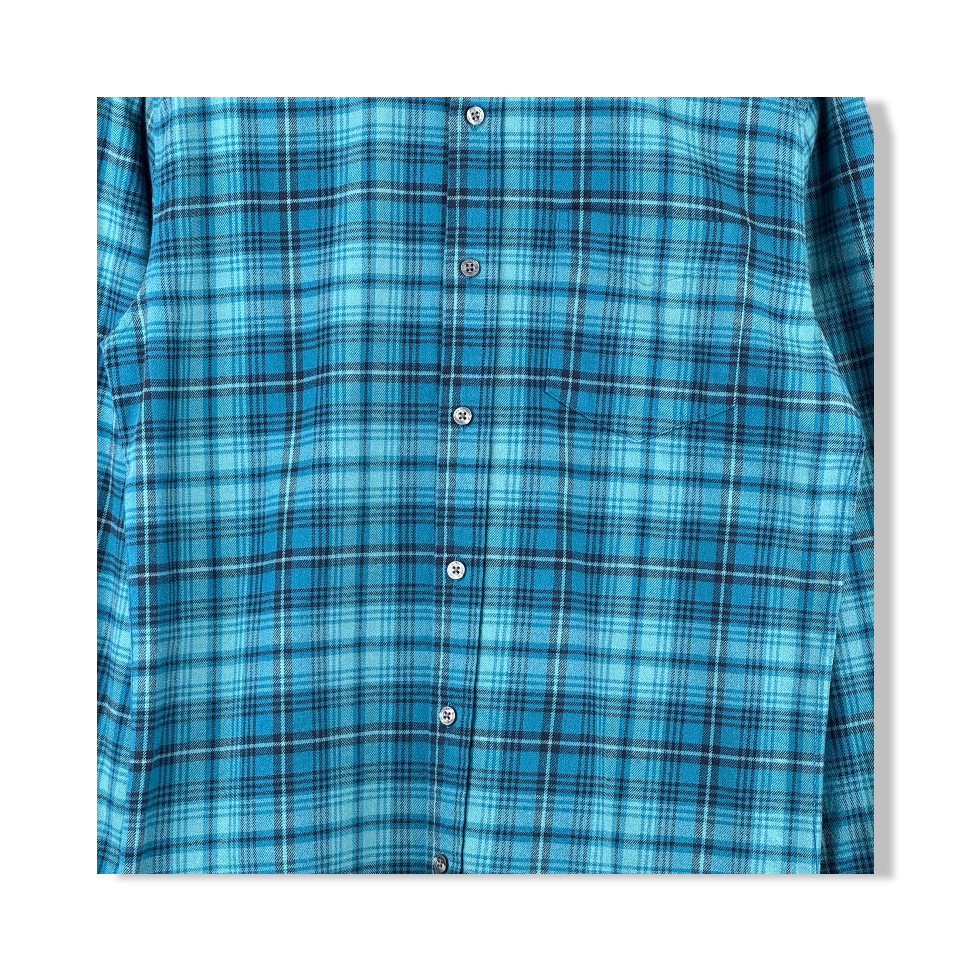 - Long sleeve button up shirt with a chest pocket and plaid print throughout.