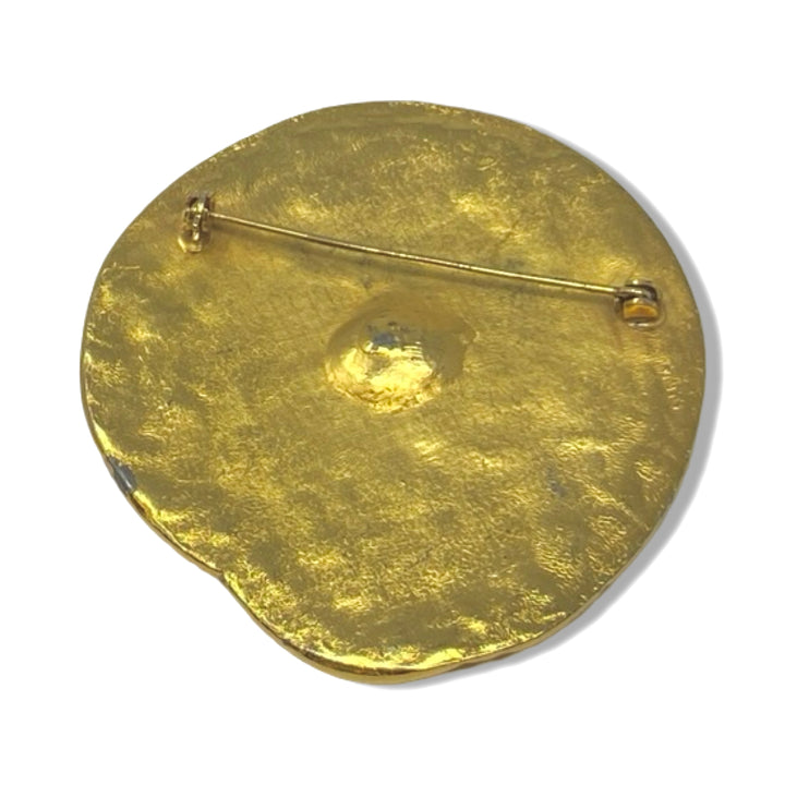 - Swirl patterned brooch with rhinestone on center and closure on back.