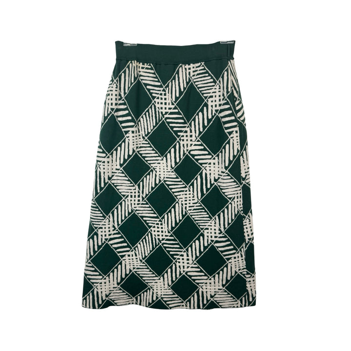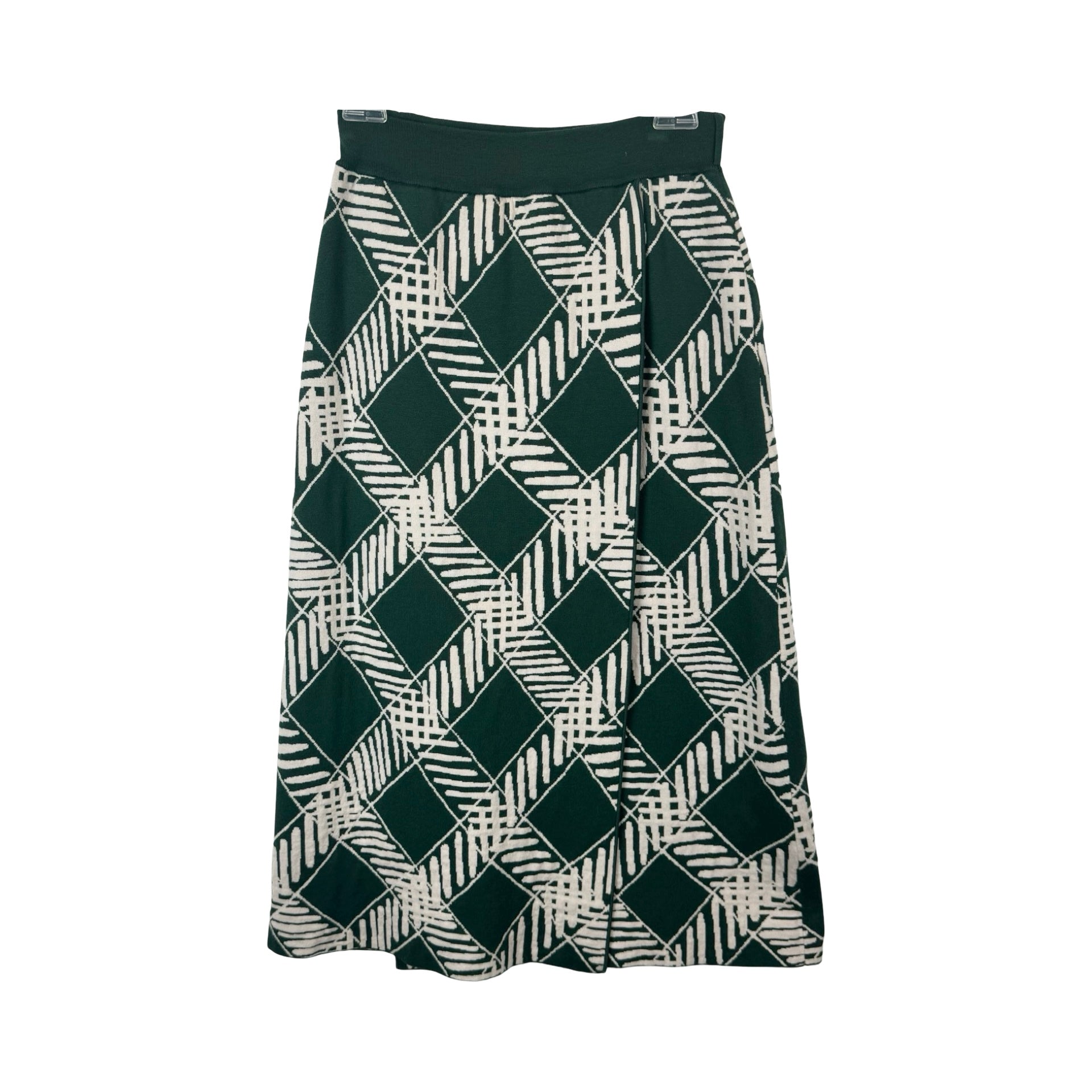 - Pull on midi skirt with elastic waist, and overlap detail. Missing belt on waist.