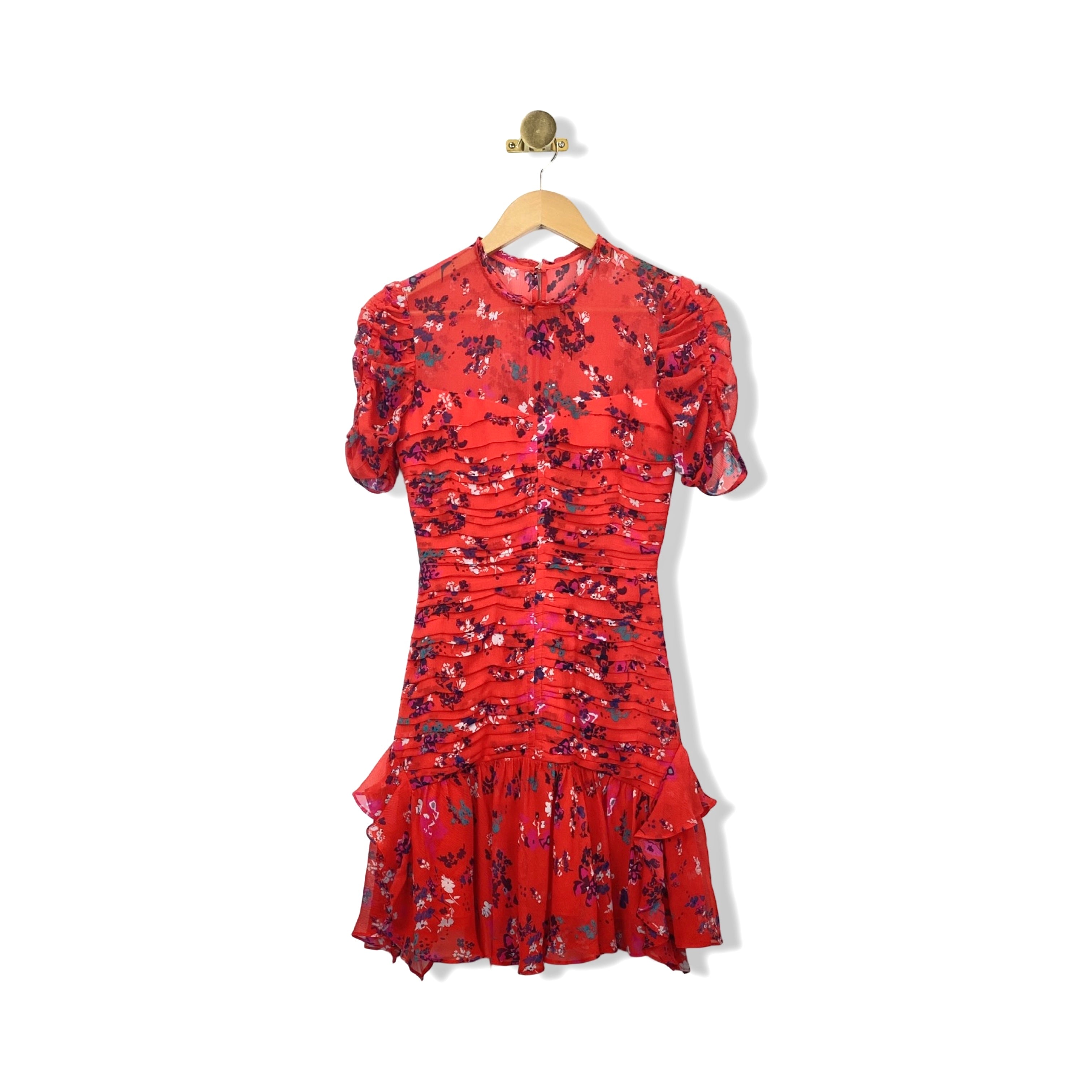 - Short sleeve mini dress with pleated folds on front, ruffle sleeves/hem and zip closure on back