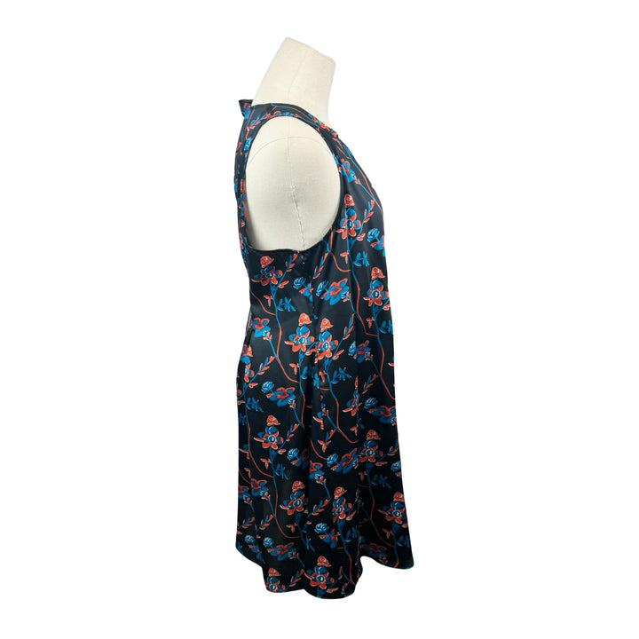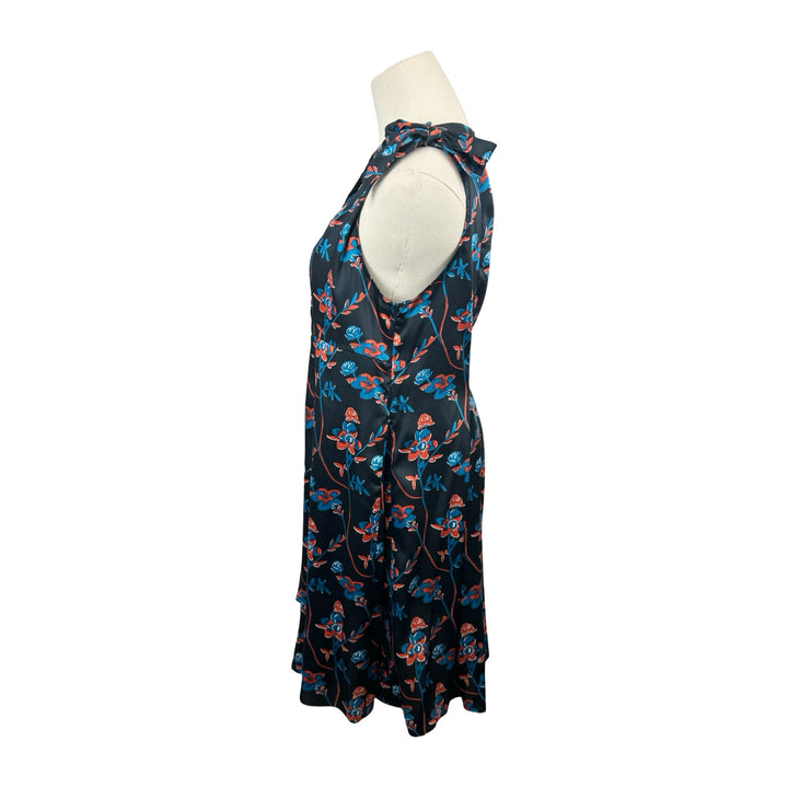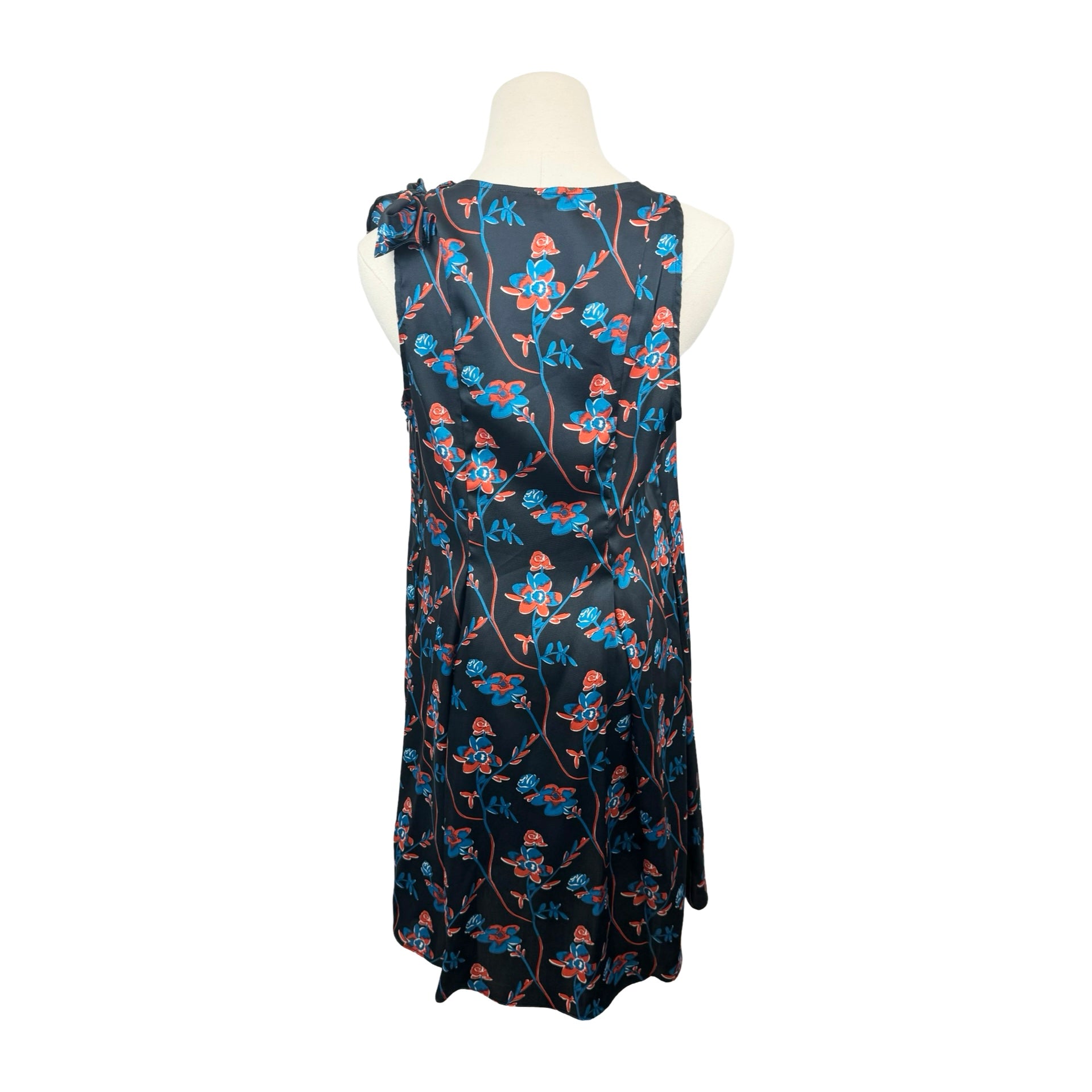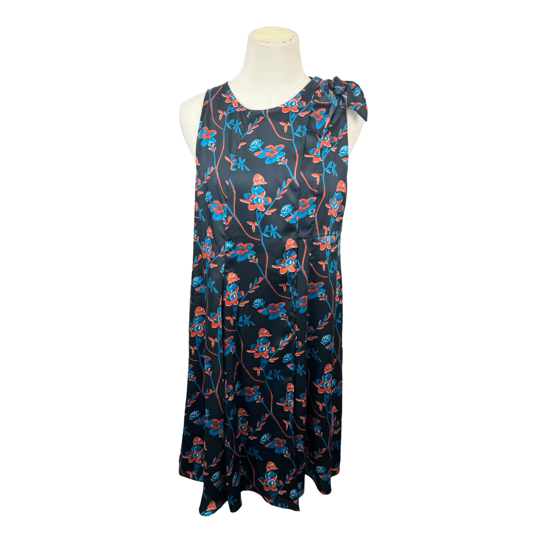 - Sleeveless floral dress with overlap on front, snap closure with self tie detail on shoulder and side zip closure.