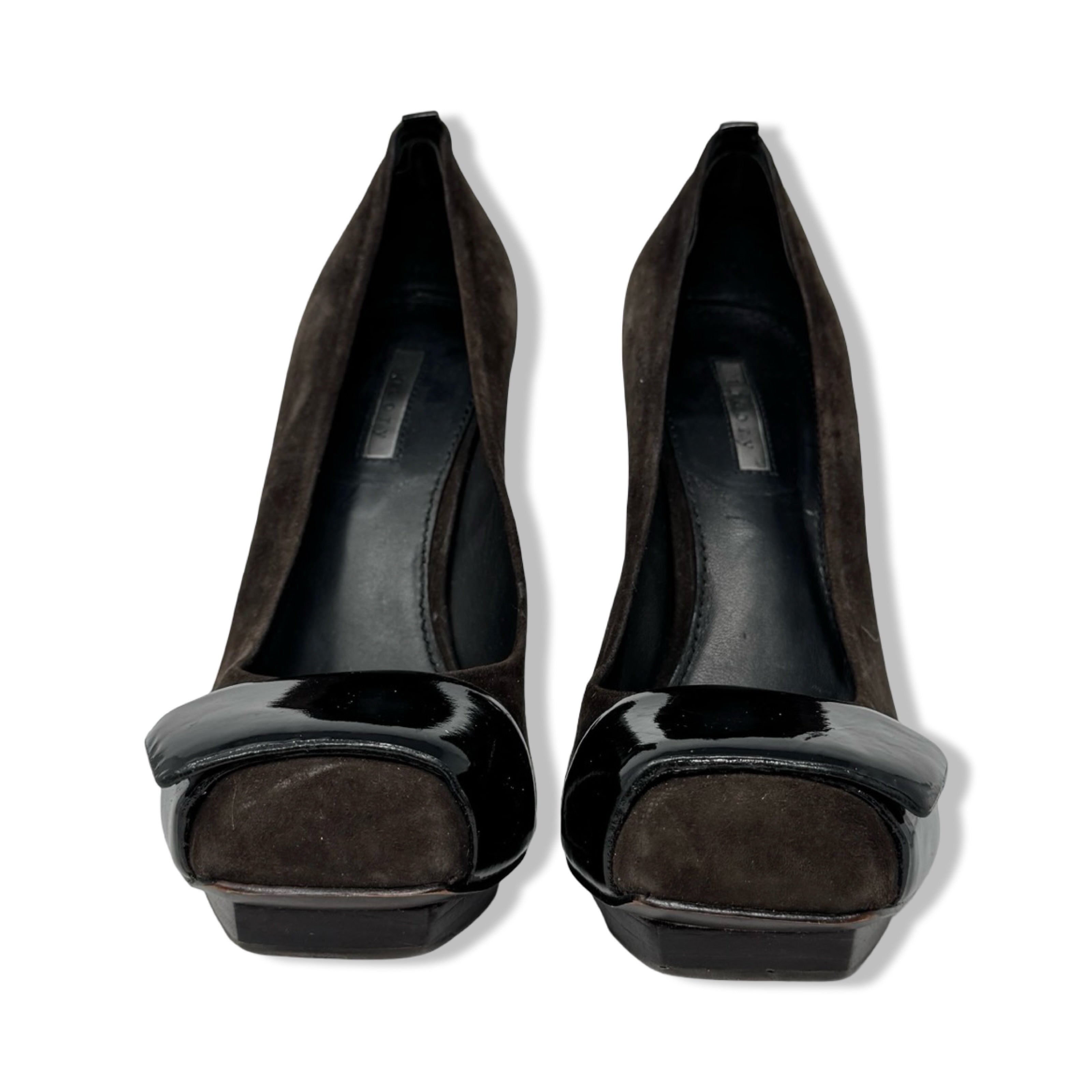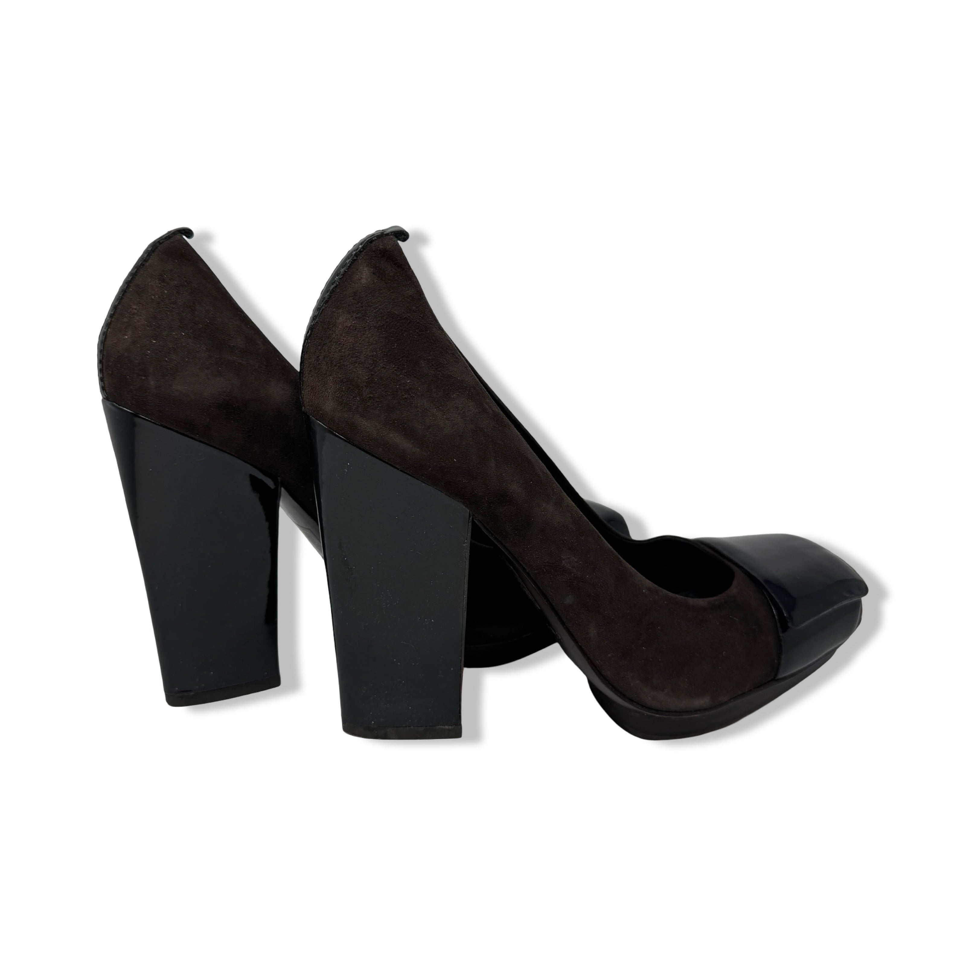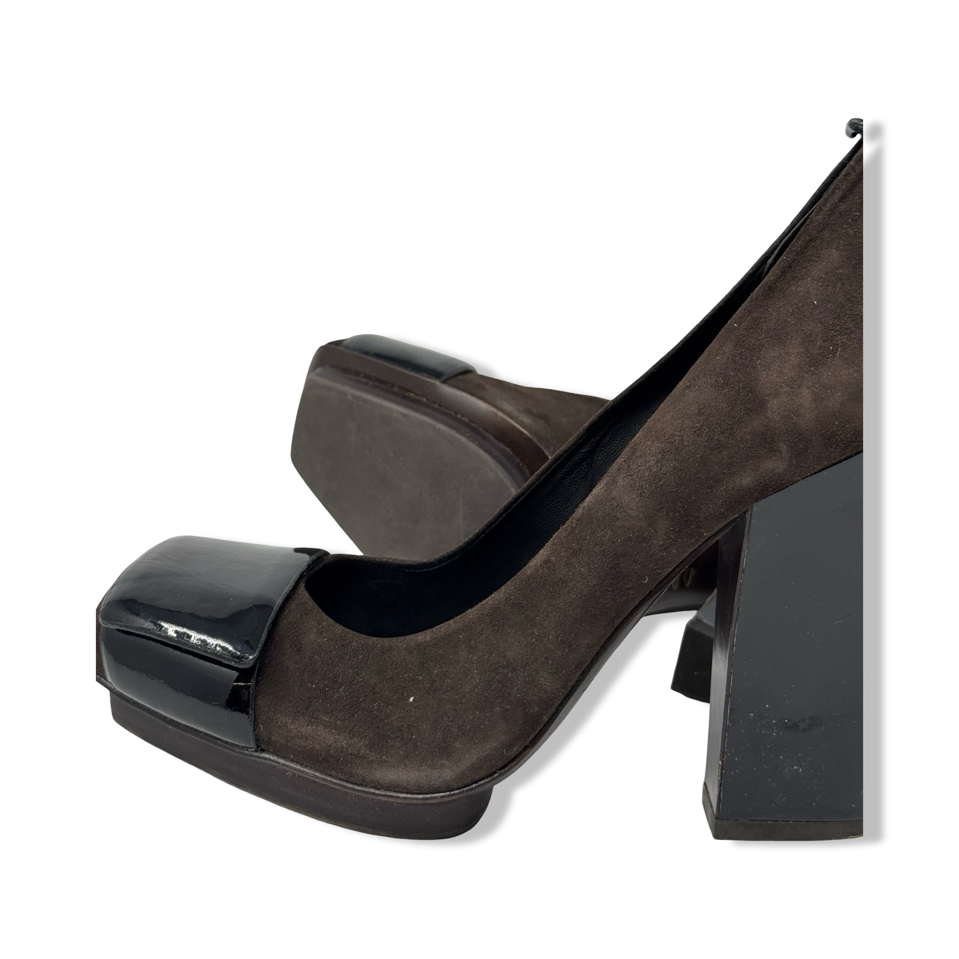- Slip on pumps with patent leather strap and block heel.
