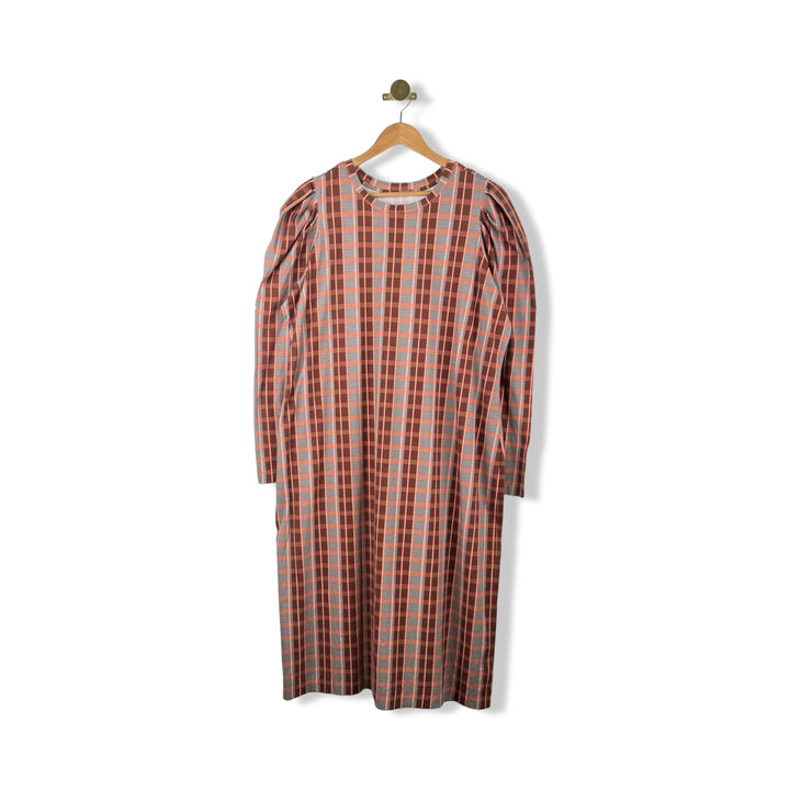 - Plaid printed puff sleave shift dress. Size not listed, Looks like size X-Large. Please check measurements.